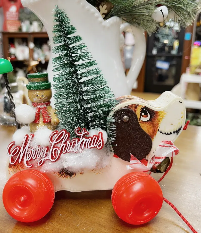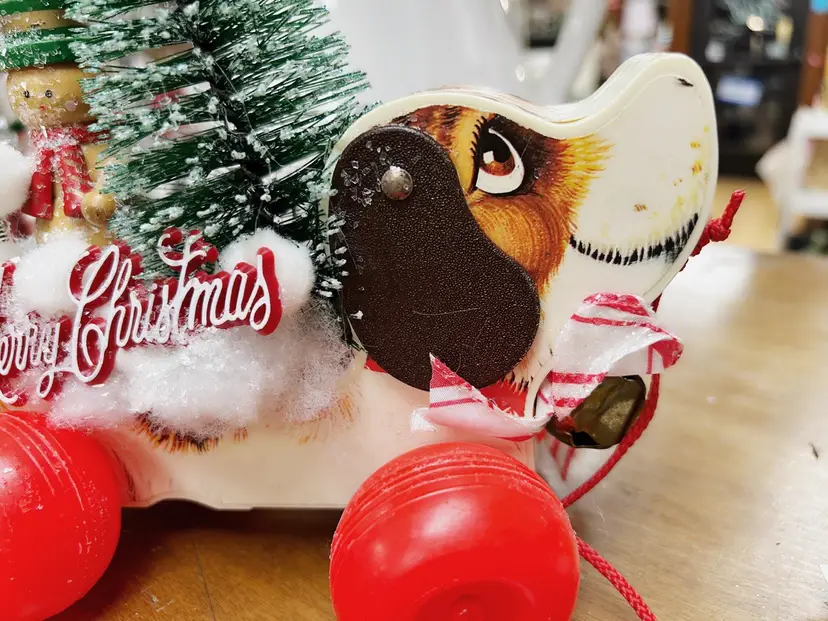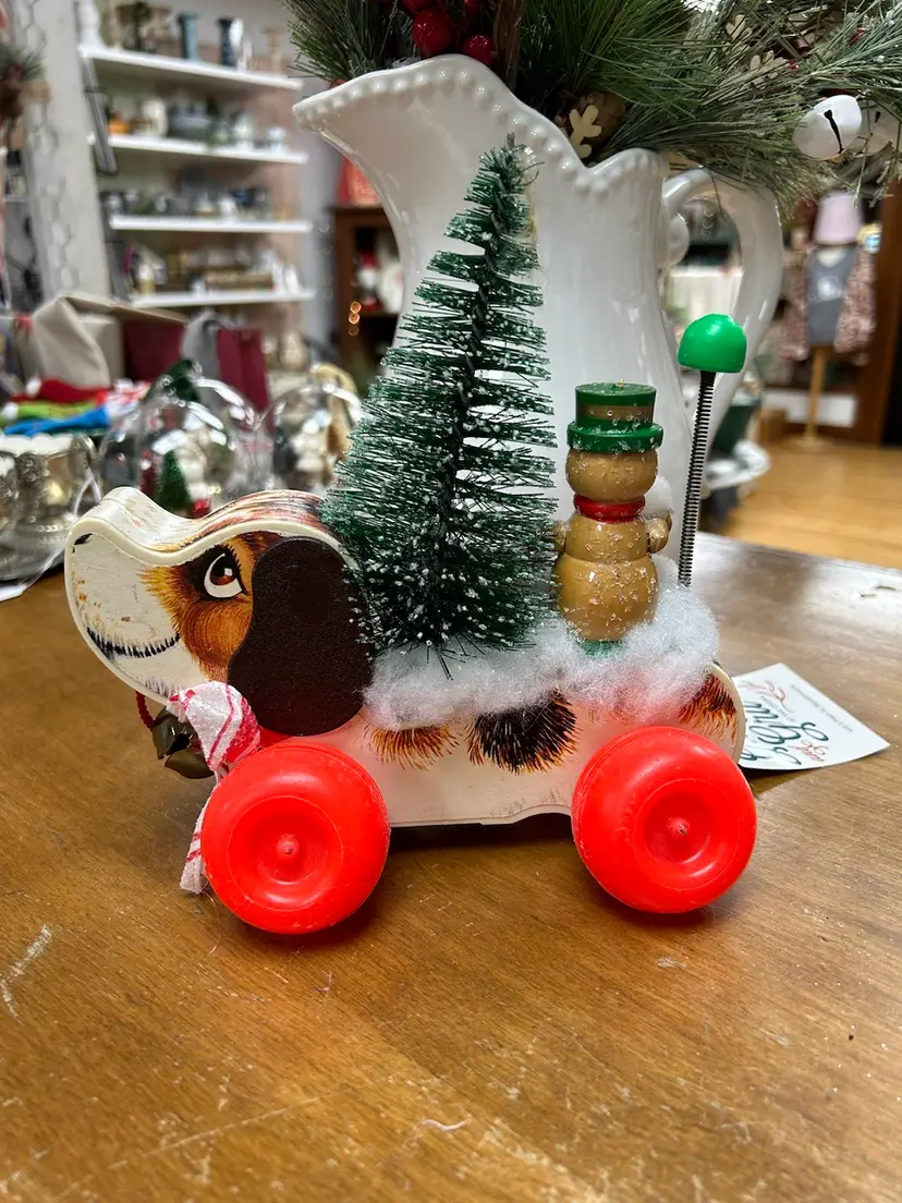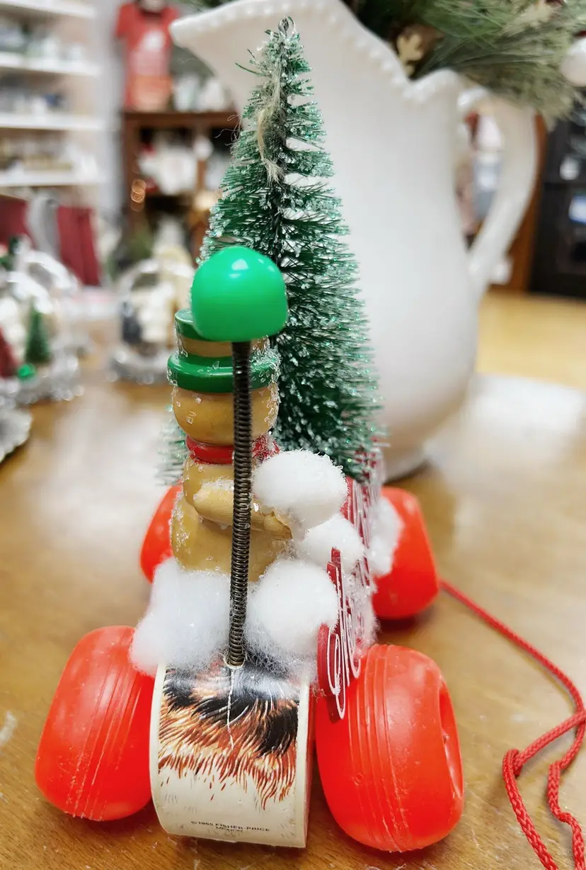 Christmas Float Assemblage based on a vintage Snoopy wood dog pull toy. Topped with a bottlebrush tree, a woody snowman, vintage red Merry Christmas plastic pick and batting snowballs with a red and white candy cane ribbon with a tarnished brass jingle bell and Lots Of German glass glitter.