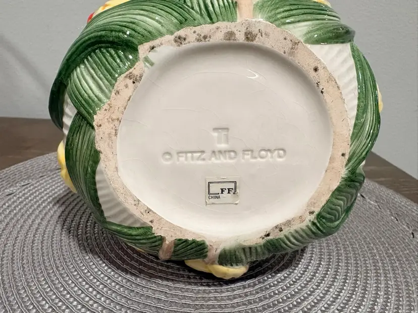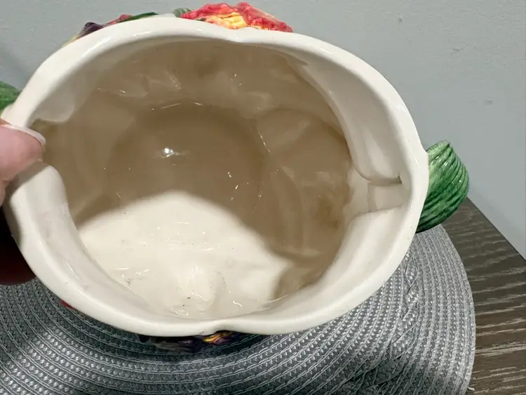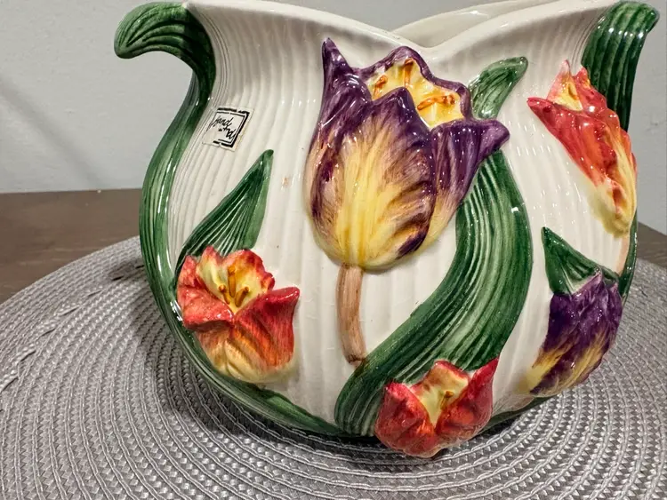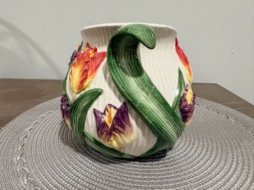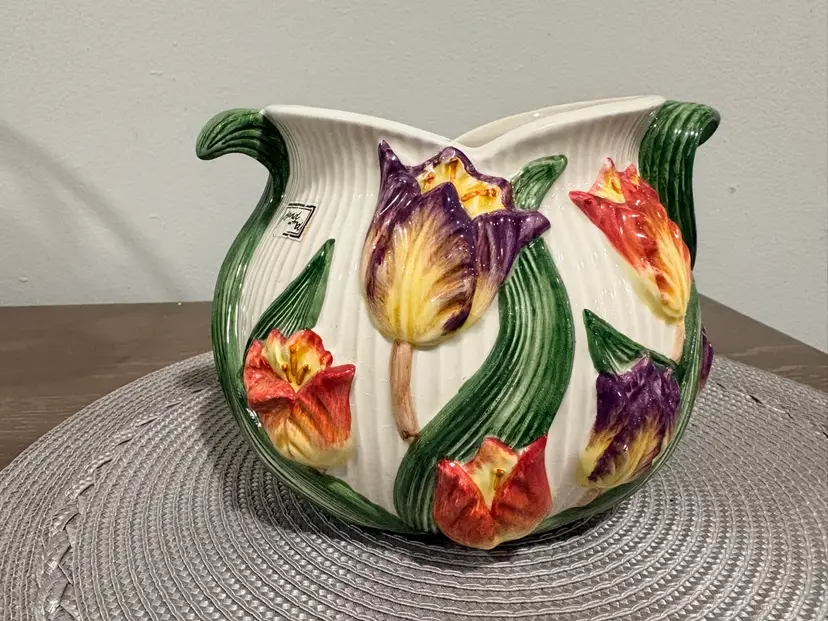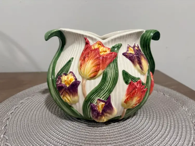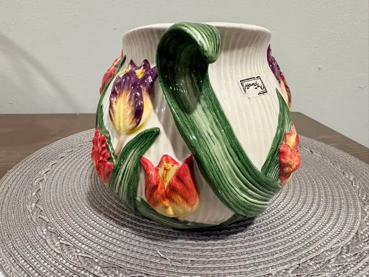 Hand-painted earthenware. It features a vibrant multicolor tulip floral design with green leaf-shaped handles. It measures approximately 5.5 inches tall and 7.5 inches wide. Pattern was retired in 1995.