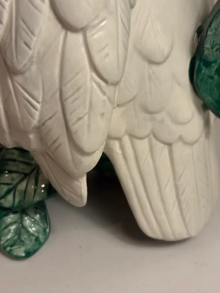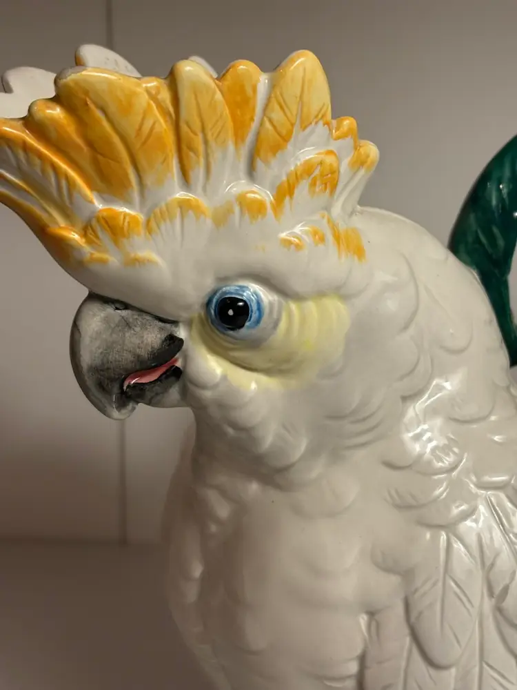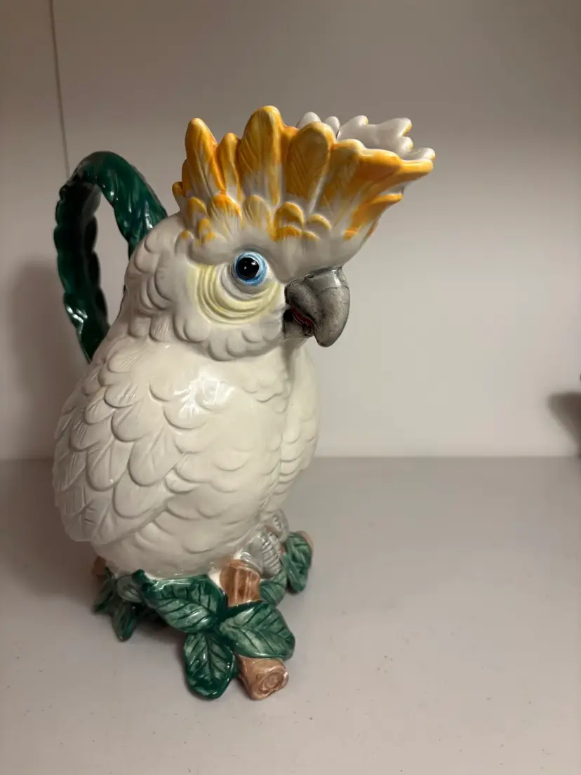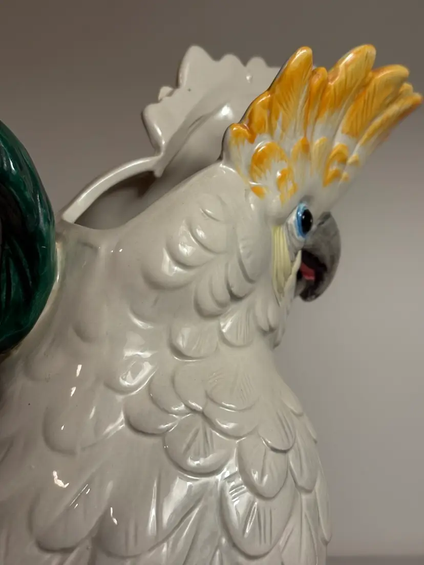 The Vintage Fitz & Floyd Ceramic Cockatoo Bird Pitcher is a unique and colorful addition to any kitchen or collector's display. Made of ceramic with a glossy finish, this 1.25 quart pitcher stands at 10 1/4" tall and features a novelty shape in the form of a cockatoo bird. Manufactured in 1991 by Fitz & Floyd, this vintage piece adds a touch of whimsy and charm to any space. Its multicolor design and quirky bird motif make it a standout piece for those who appreciate collectible dinnerware and serveware items