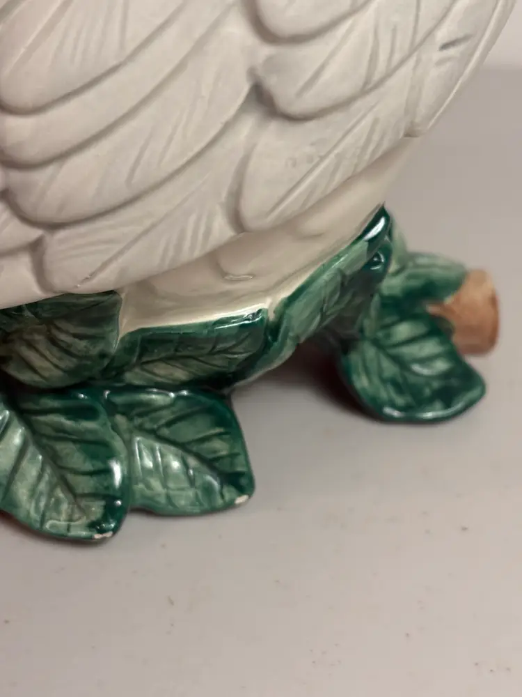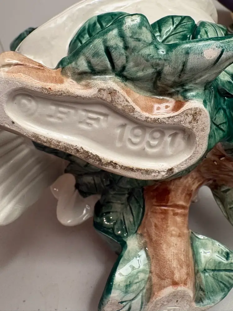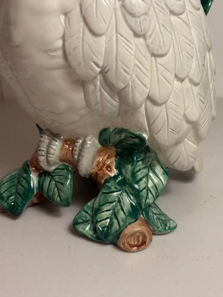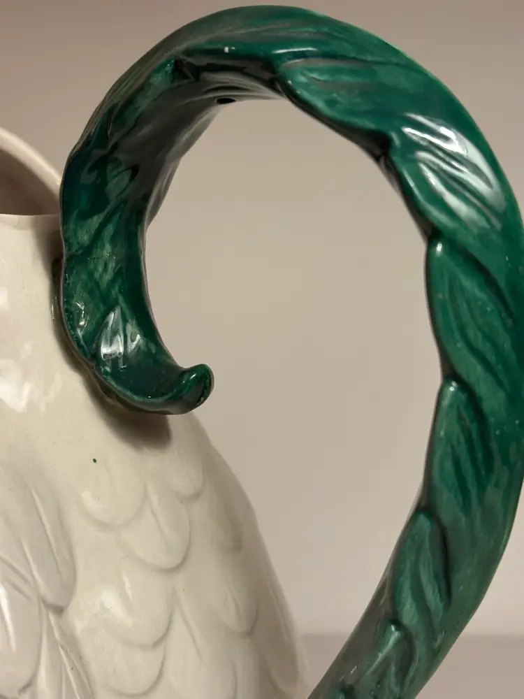 The Vintage Fitz & Floyd Ceramic Cockatoo Bird Pitcher is a unique and colorful addition to any kitchen or collector's display. Made of ceramic with a glossy finish, this 1.25 quart pitcher stands at 10 1/4" tall and features a novelty shape in the form of a cockatoo bird. Manufactured in 1991 by Fitz & Floyd, this vintage piece adds a touch of whimsy and charm to any space. Its multicolor design and quirky bird motif make it a standout piece for those who appreciate collectible dinnerware and serveware items