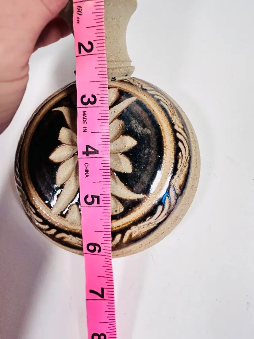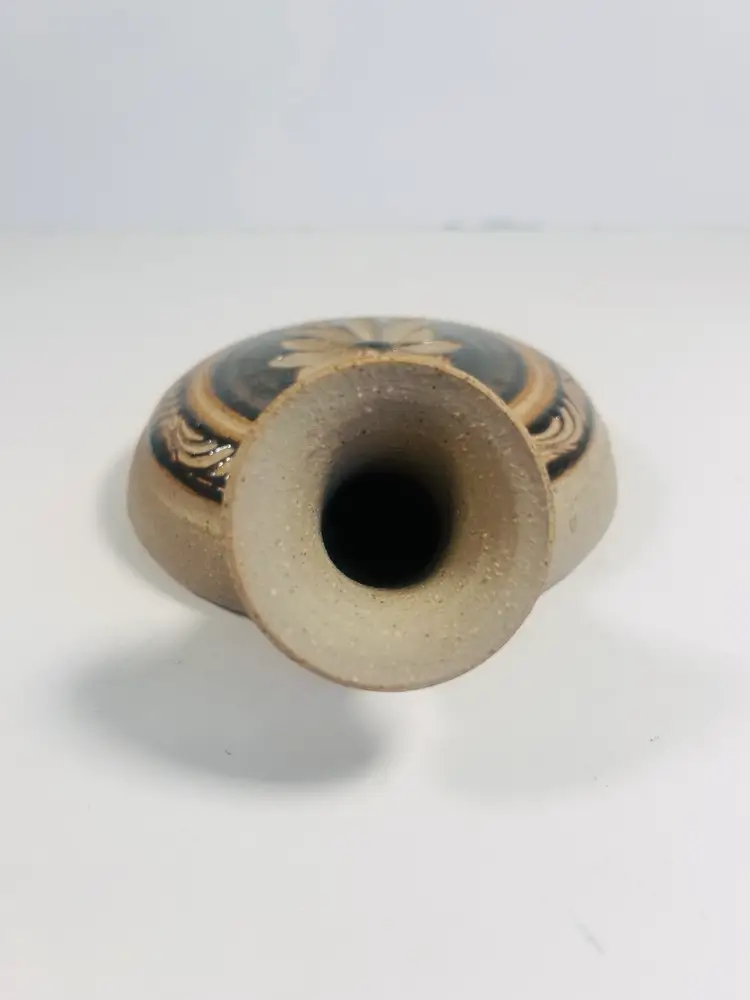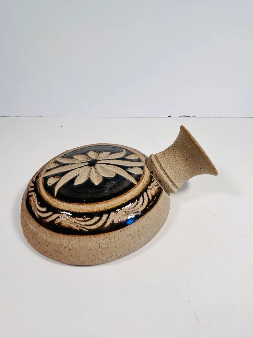 This beautiful flat water pitcher vessel is a classic piece of Mexican art pottery that will bring a touch of traditional charm to any collection. The sandstone jug is signed by the artist and showcases intricate details that highlight the rich cultural heritage of Mexico.
