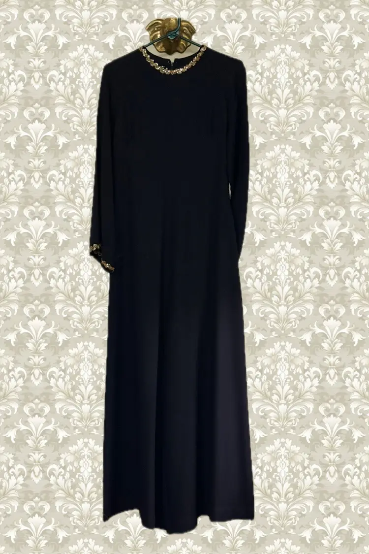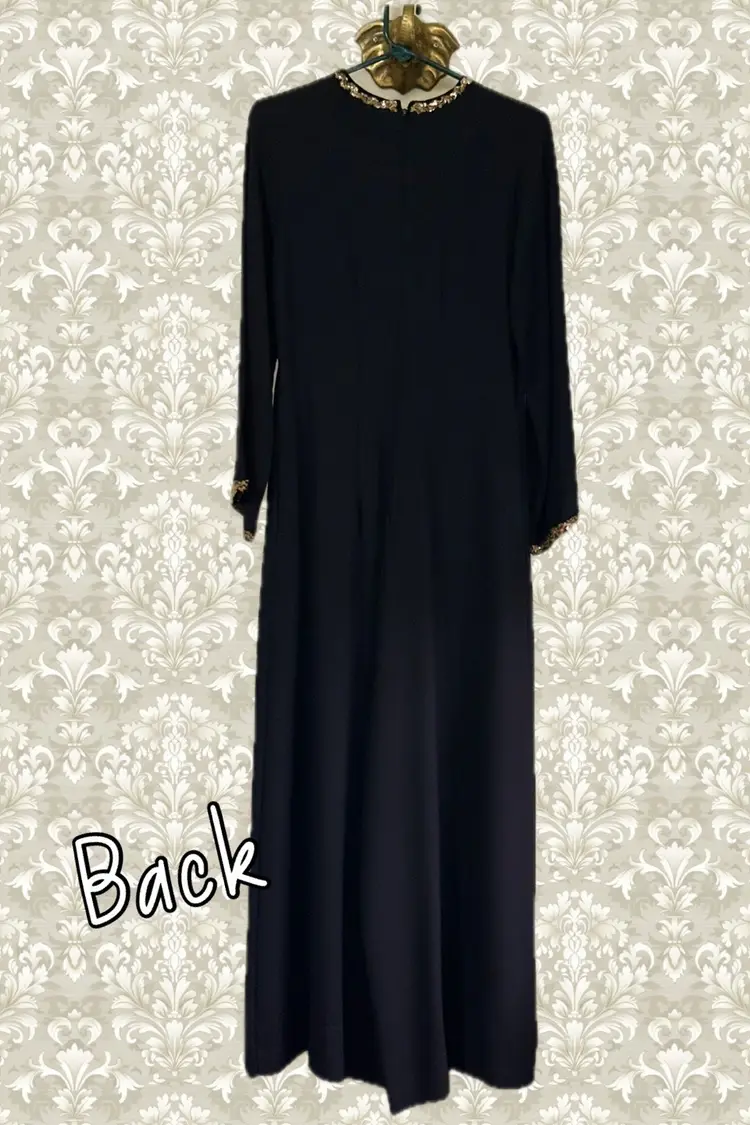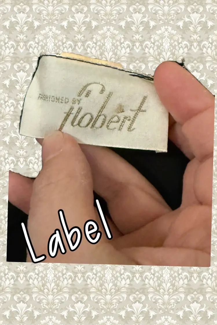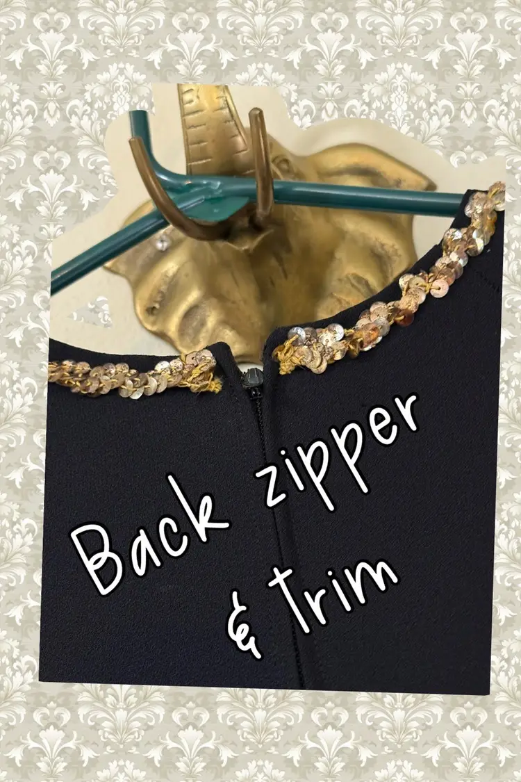 Back Zipper. Very shear. Needs to be dry-cleaned. Otherwise good condition. Size is hard to gage, less than a 14 for sure.