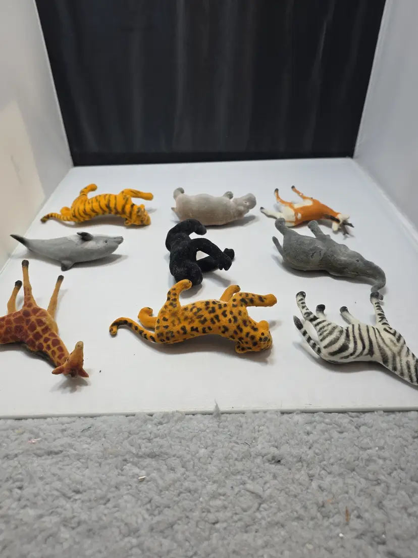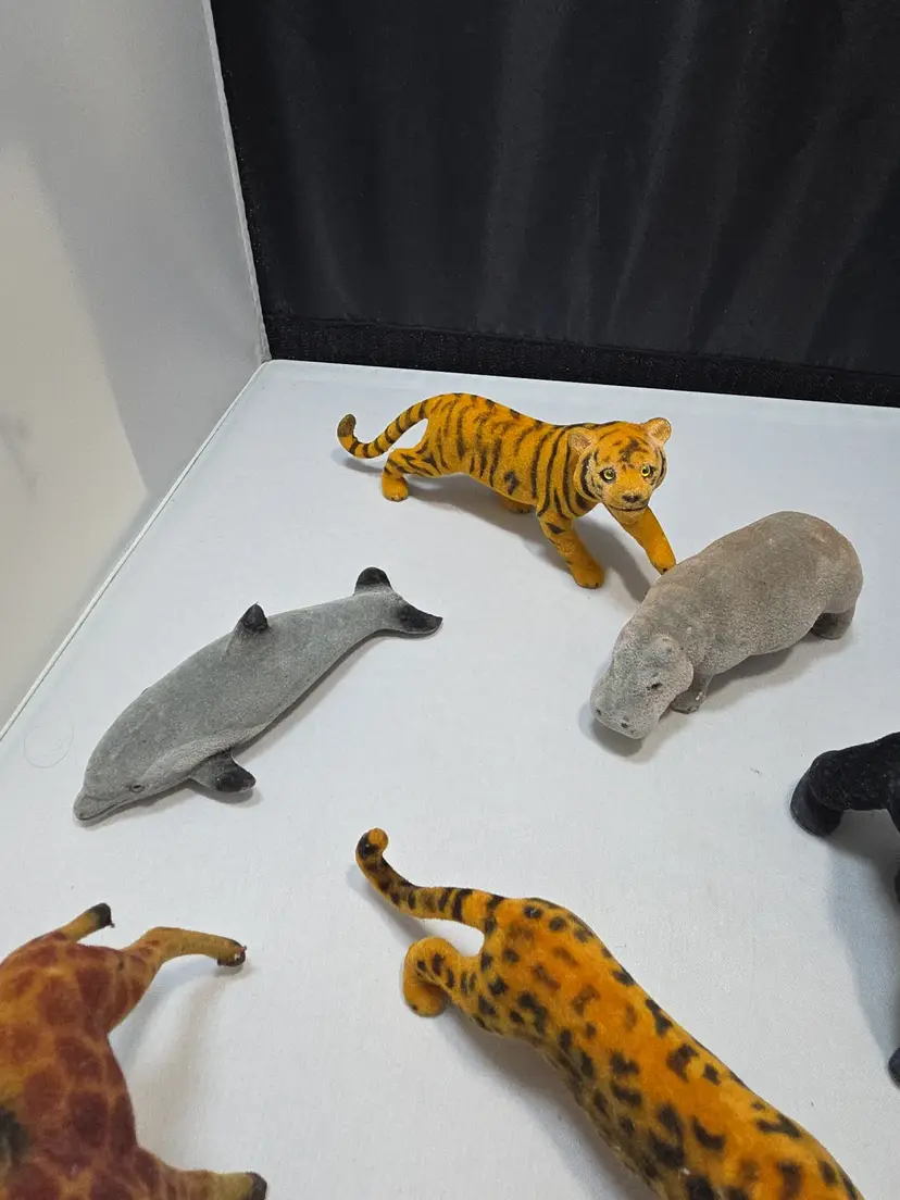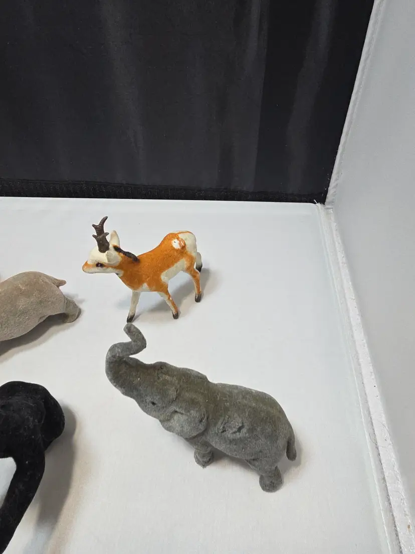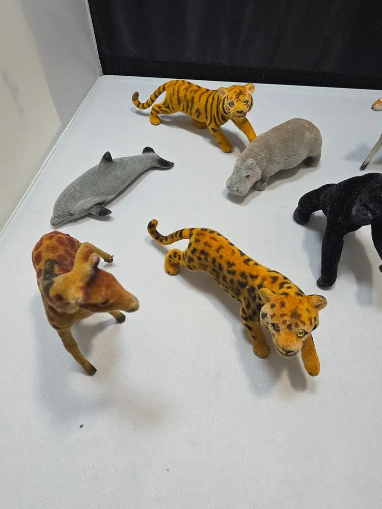 Description Vintage flocked animal figurine lot featuring nine zoo and wildlife animals with soft textured flocked surfaces. Includes a mix of land and aquatic animals, all freestanding and suitable for display, dioramas, or vintage toy collections. Figures show molded detail beneath the flocking with classic mid-century style proportions. Ideal for collectors of vintage animal figures, nursery décor, or educational play displays. Condition Good vintage condition overall. Flocking remains intact with light wear consistent with age and normal handling. No major damage noted. Please review photos closely for exact condition and surface wear. Stored in a smoke and pet free home