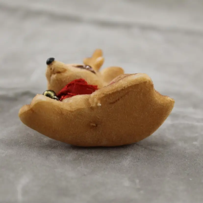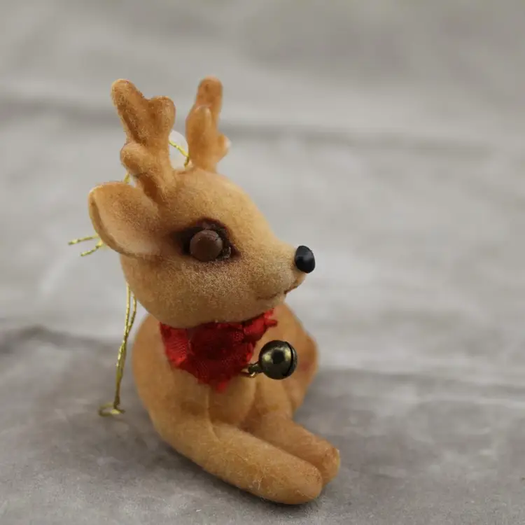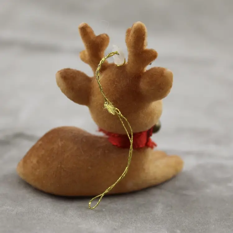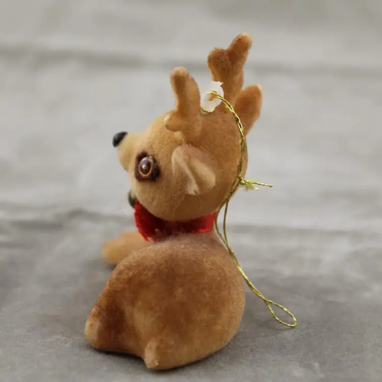 This is a vintage deer Christmas ornament. It is flocked. It's in pretty shape considering how many Christmases this little has probably seen. The flocking is a little thin in places and his eyes are a little weird. He is not broken or missing anything pieces. He measures approx. 2 1/2" tall, 2 1/2" long and 1 3/8" wide.