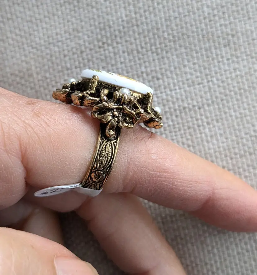 Antique brass finish with detailed design on band. The face of the ring is 1-1/4" across. Adjustable, currently a size 7. Unmarked