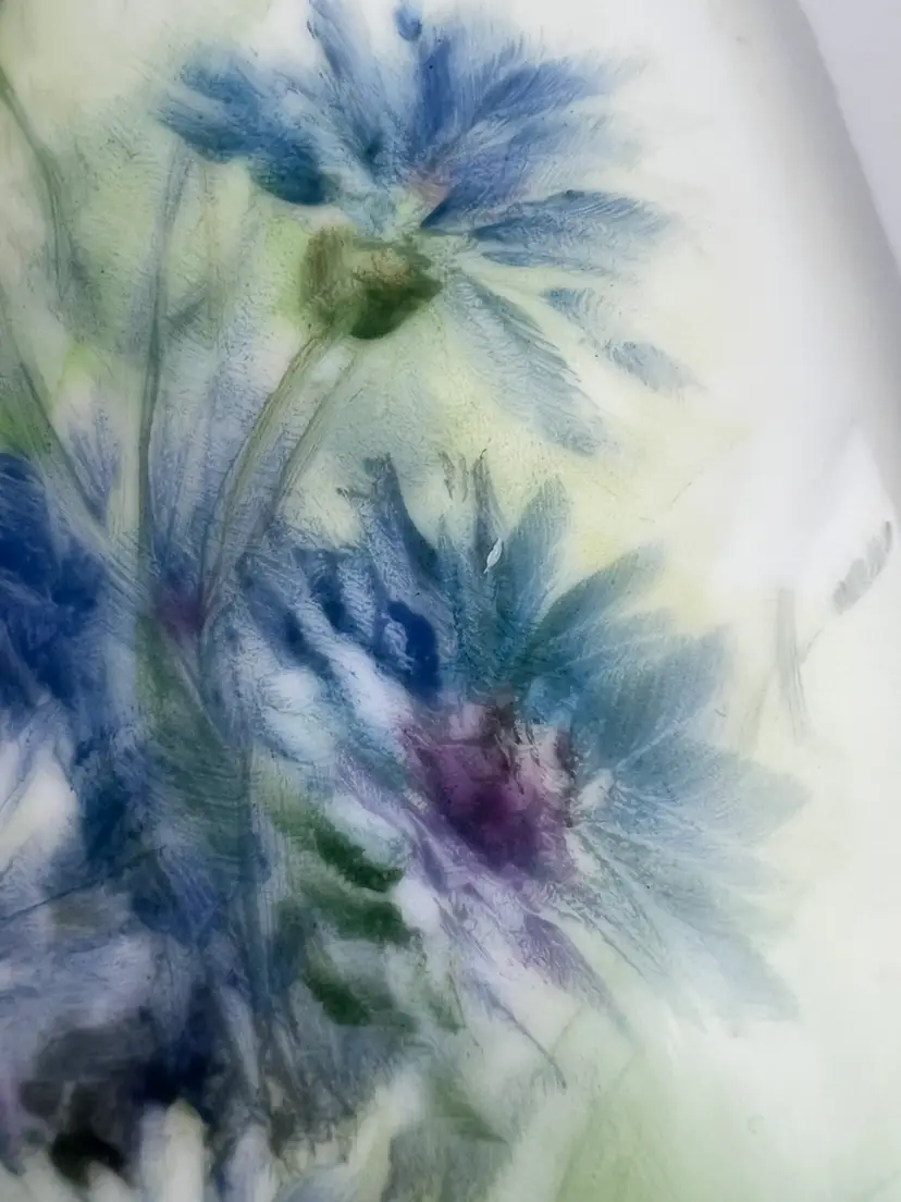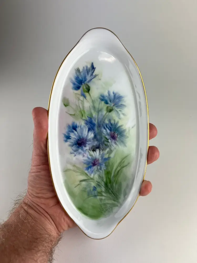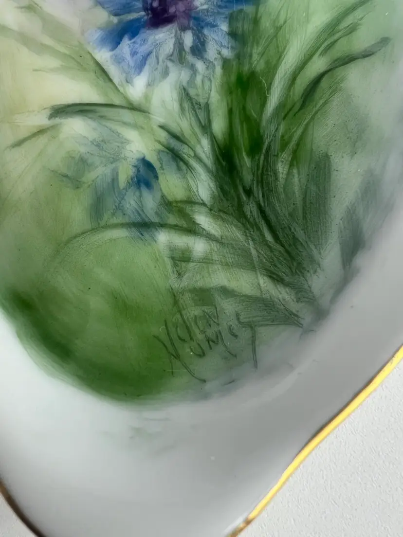 It appears to be signed Jon Mumis. There is some light minor wear to the floral painted design from normal use as well as wear to the gold gilded edge. I do not detect any chips, cracks, hairlines or repairs. This has a nice ring when tapped. This would be perfect to hold jewelry or just a decorative element around the home decor. It is very pretty. All pottery is double boxed for safe shipping.