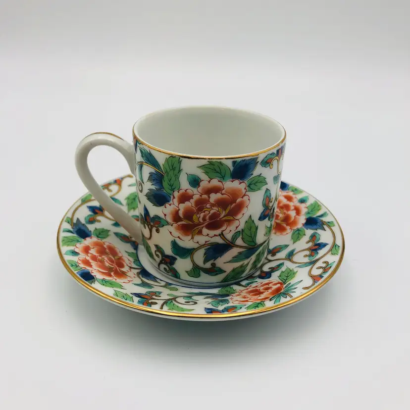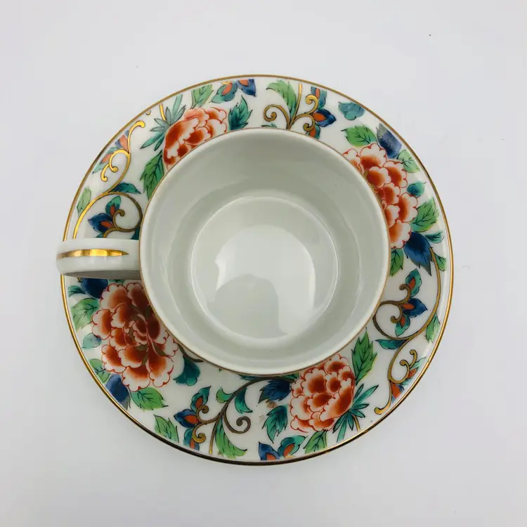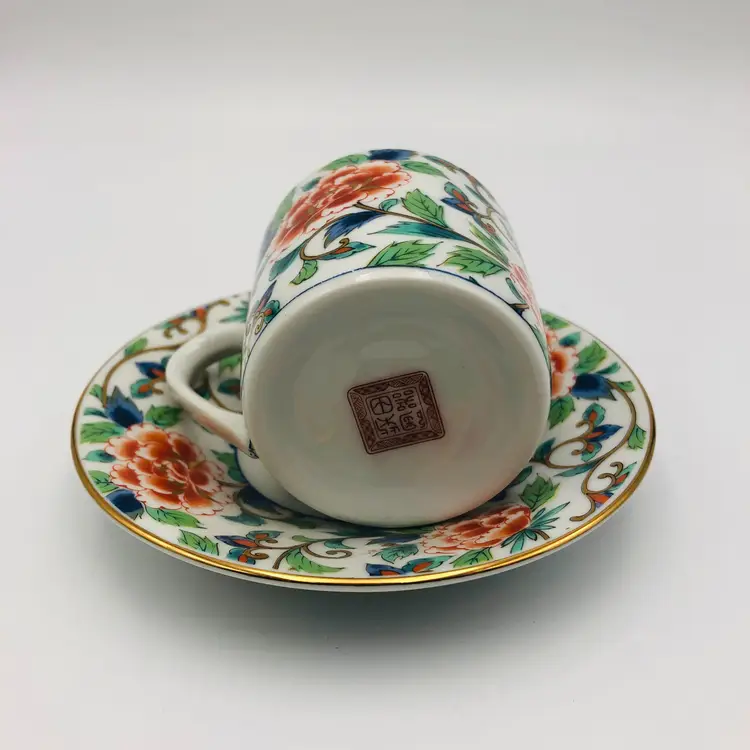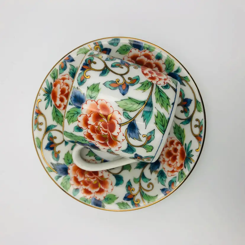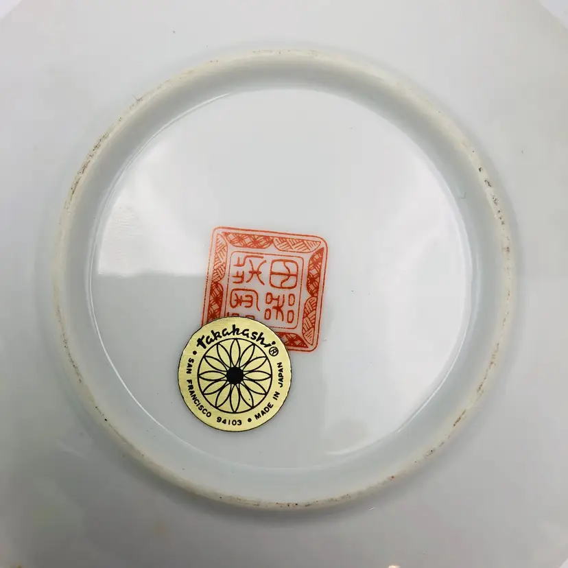 For sale is a Takahashi San Francisco 94103 Japan Tea Cup & Saucer Vintage Chintz Chintzware - this has two marks, the first is the back stamped of the maker: Shibata, and the sticker of the importer: Takahashi Trading; has a floral chintz pattern.