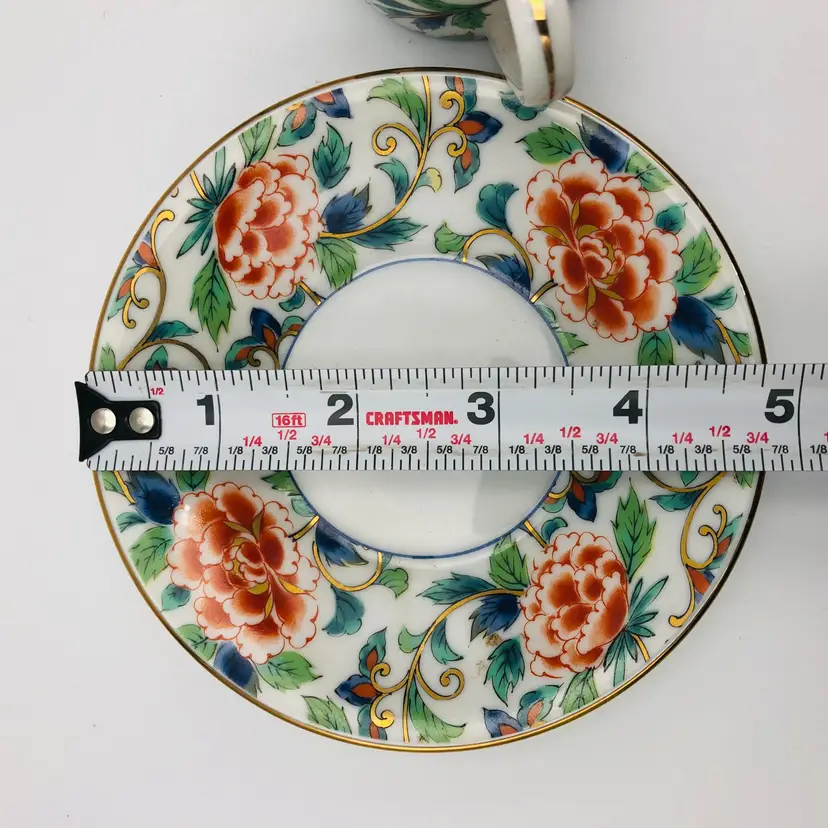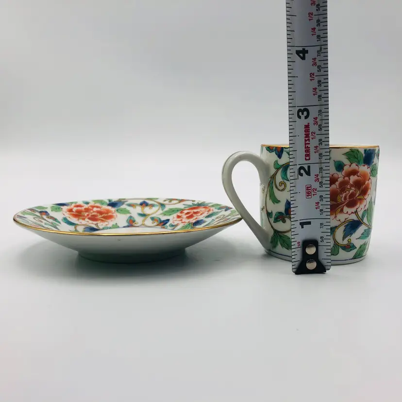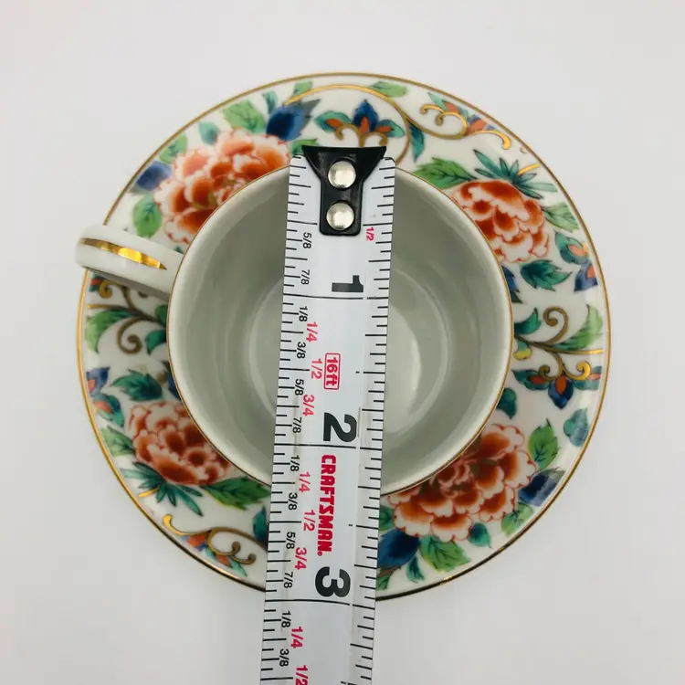 Dimensions: all approximate Teacup: 2 3/8" across in dm ( not inc the handle) x 2 1/4" tall Saucer: 4 7/8" across in dm x 3/4" deep Holds about 4fl oz of liquid