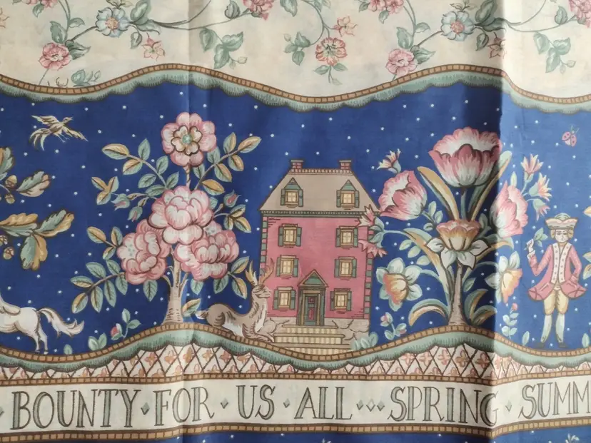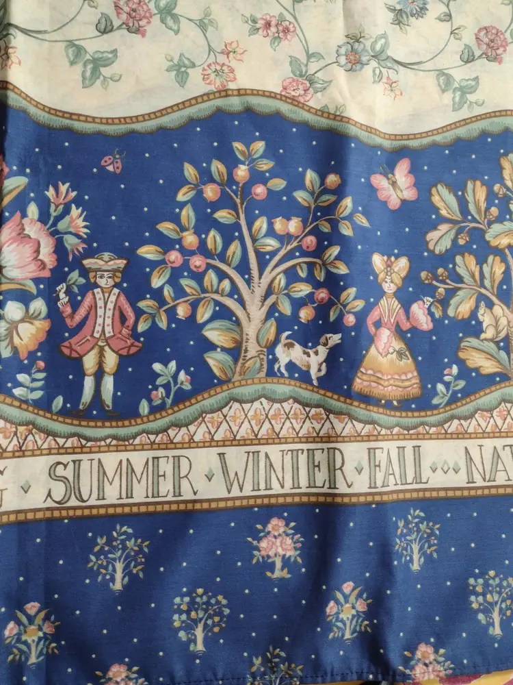 This is a very nice Folk Art floral countryside tablecloth with what looks to be Colonial French characters as well as animals, house etc. This is talking about Nature's Bounty that each season brings. Tablecloth measures 60W x 86L.