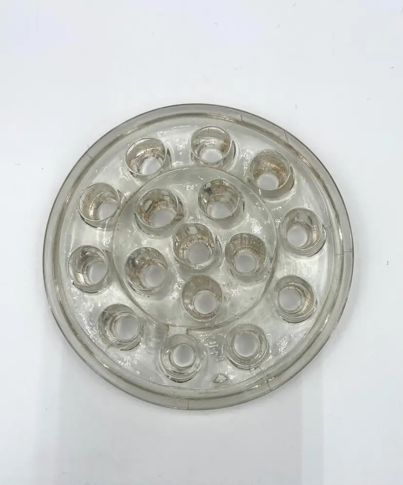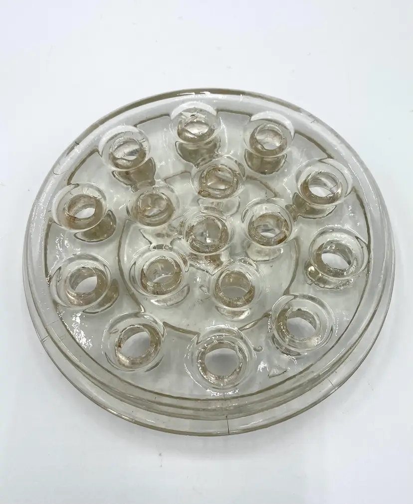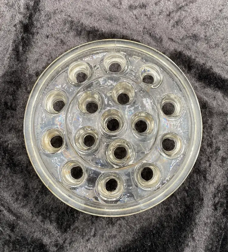 This vintage glass 16-Hole Floral Frog is a beautiful and functional piece made in the United States during the late 20th century. The round, 5" holder features 16 holes for flower stems.
