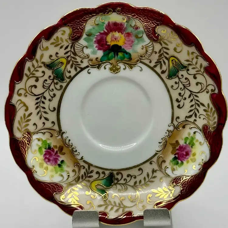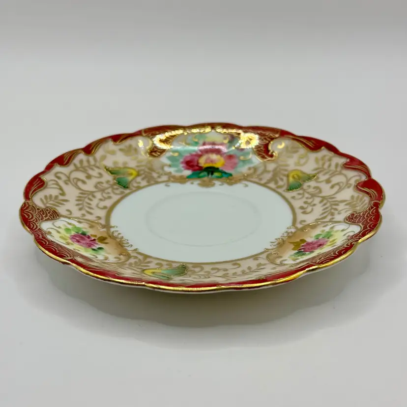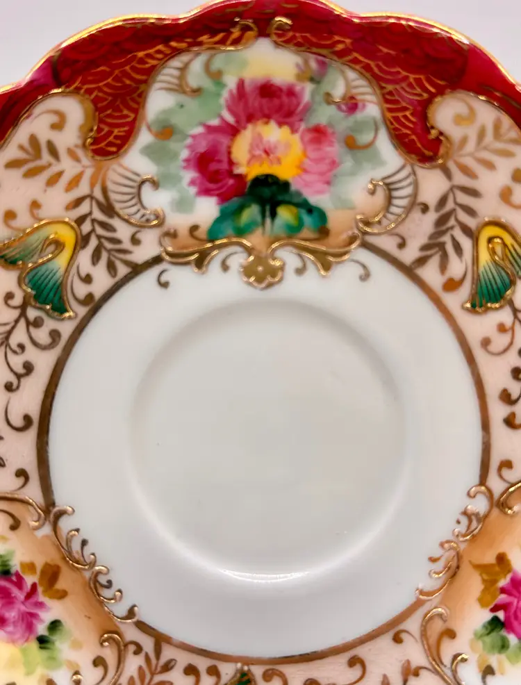 Step back in time with this exquisite vintage porcelain saucer, featuring a hand-painted floral motif surrounded by intricate gilded accents. A charming piece for any vintage tableware collection or as an elegant display item. Shows signs of love and use, which add to its vintage charm. No chips or cracks. Measures 5”. Weighs 4oz.