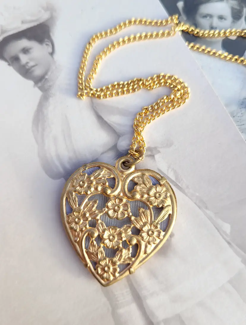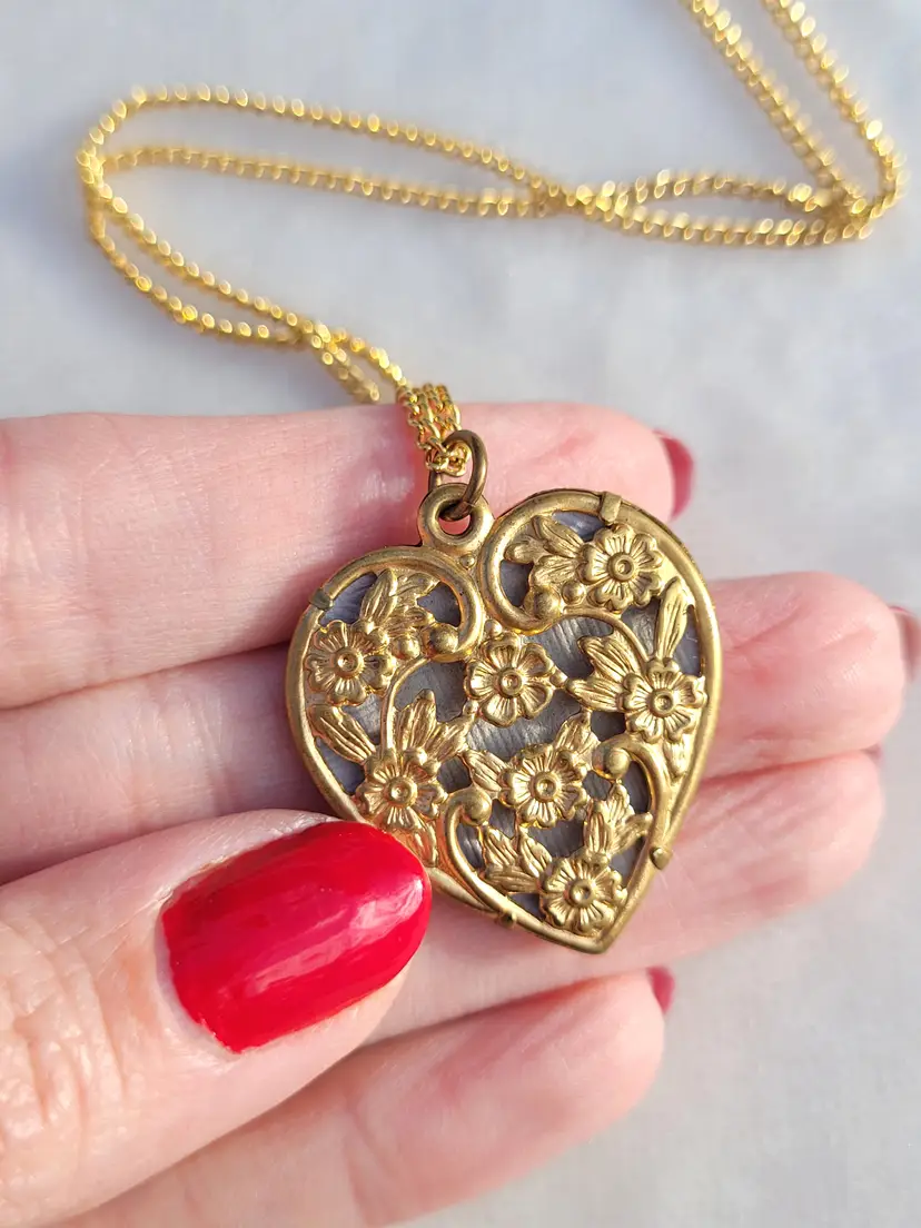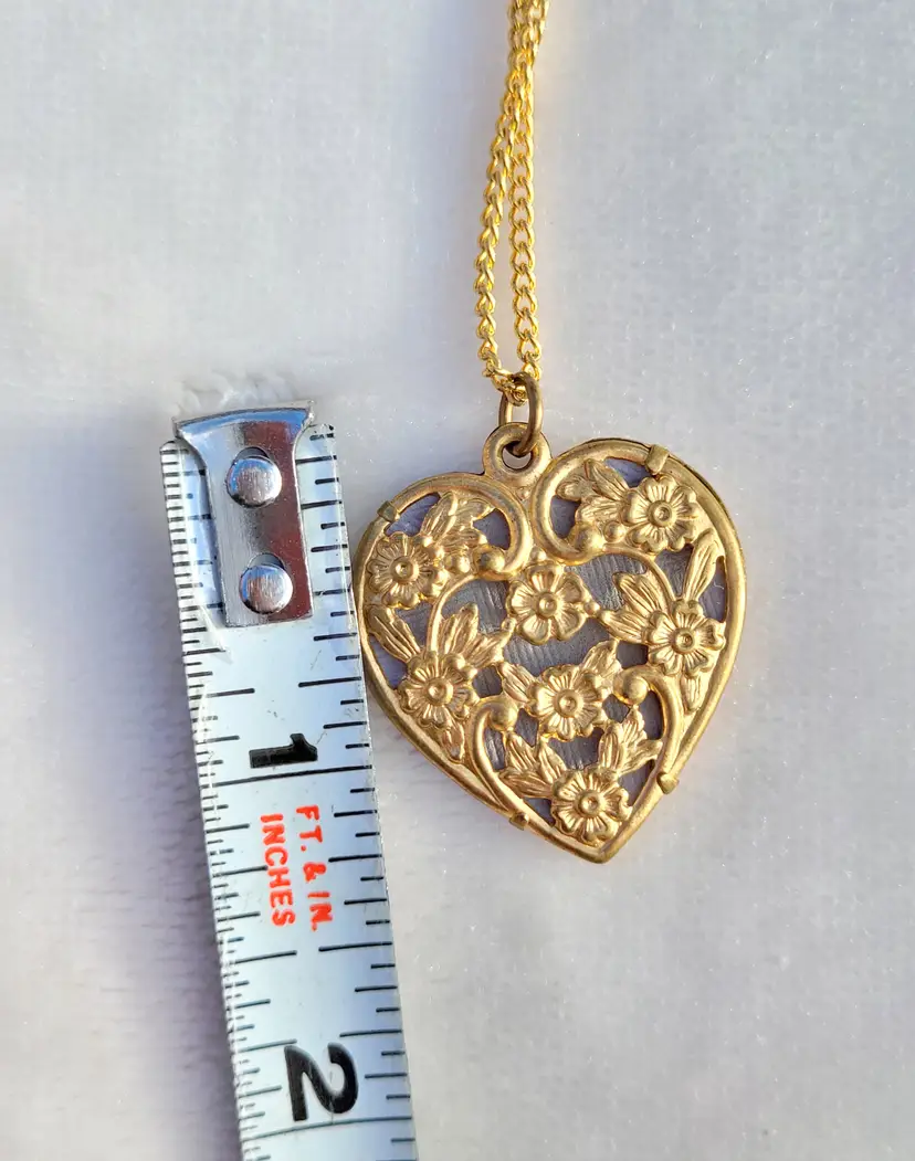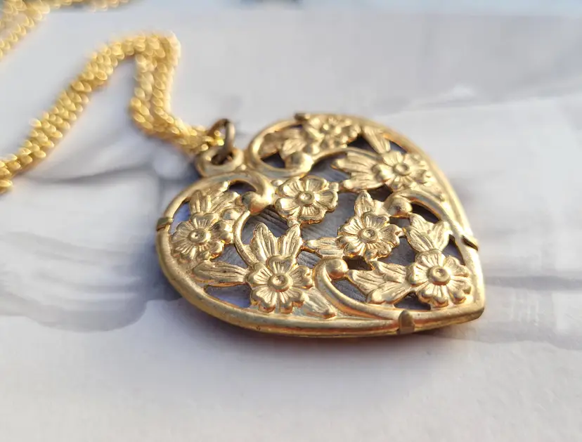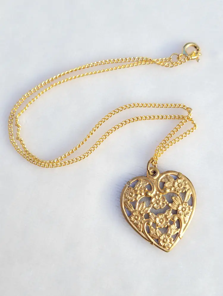 Really pretty floral filigree heart necklace that has a material inside for dabbing scents on. It has tabs and can open to switch out the material.