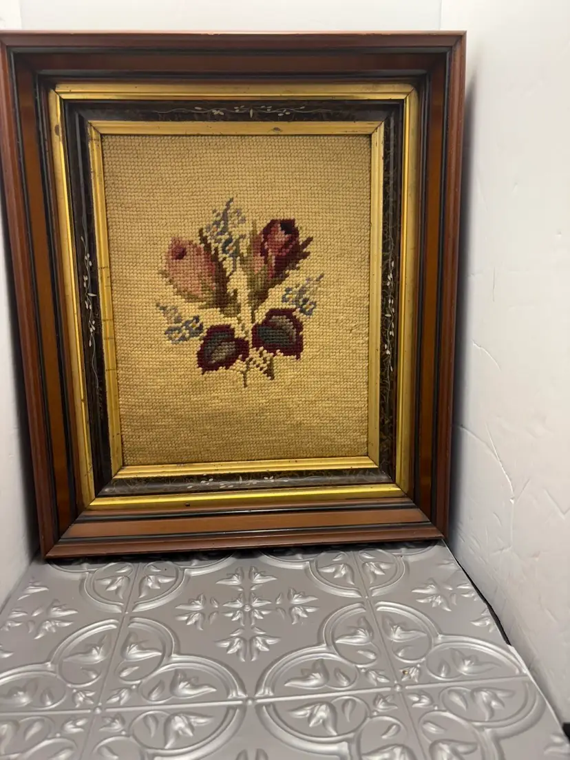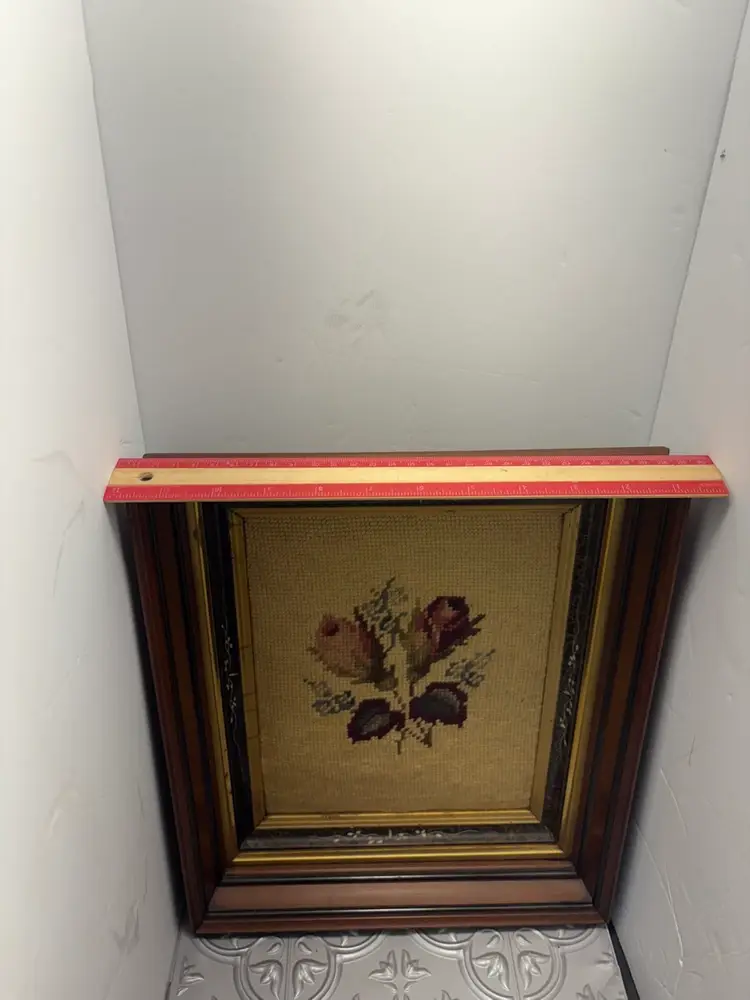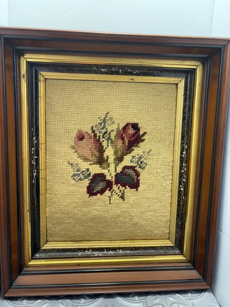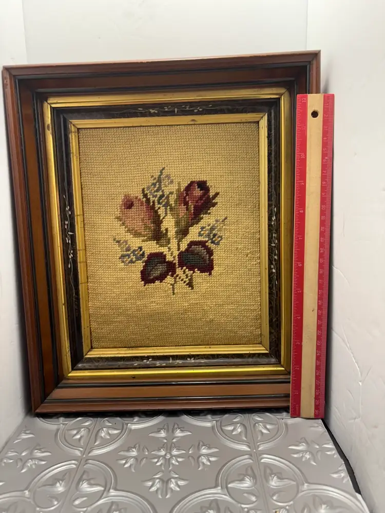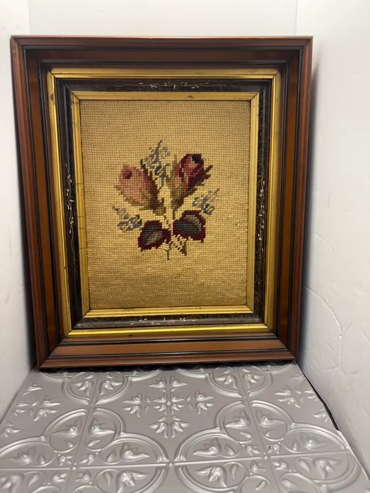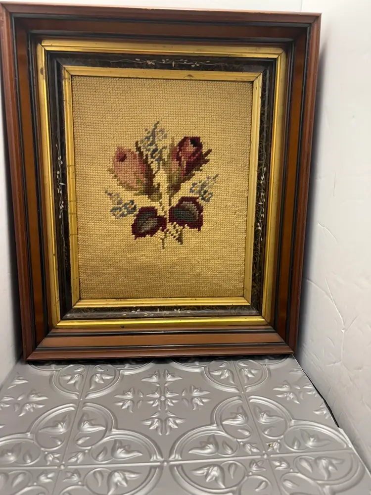Beautiful vintage floral needlepoint art. Features a bouquet of flowers in a wooden frame. Perfect for home decor.no glass