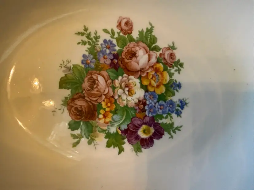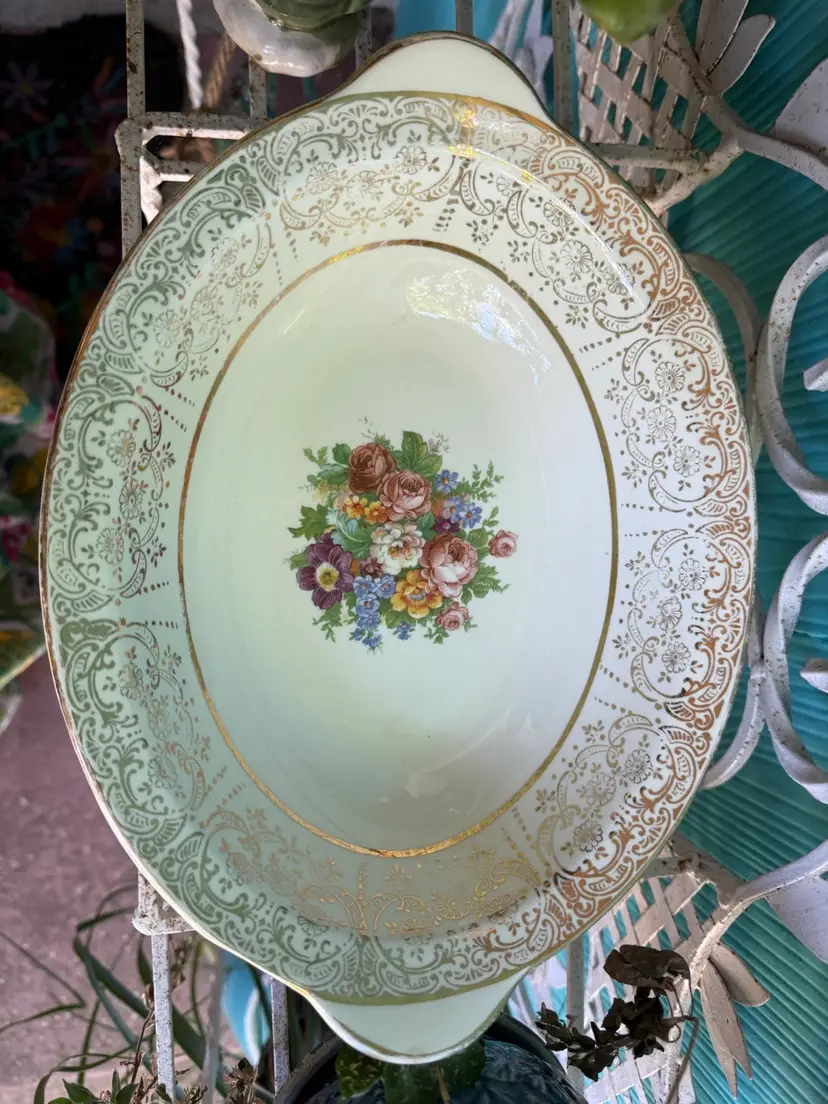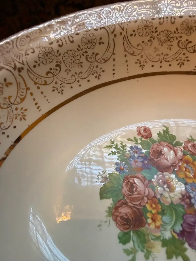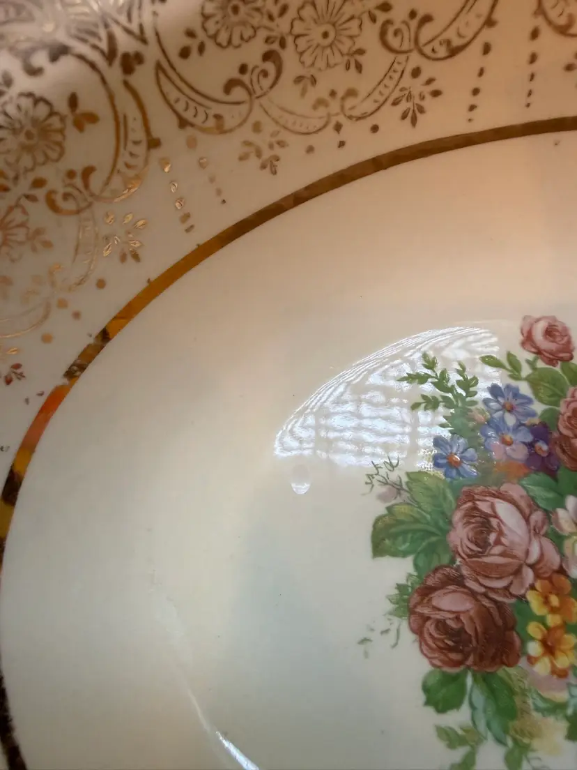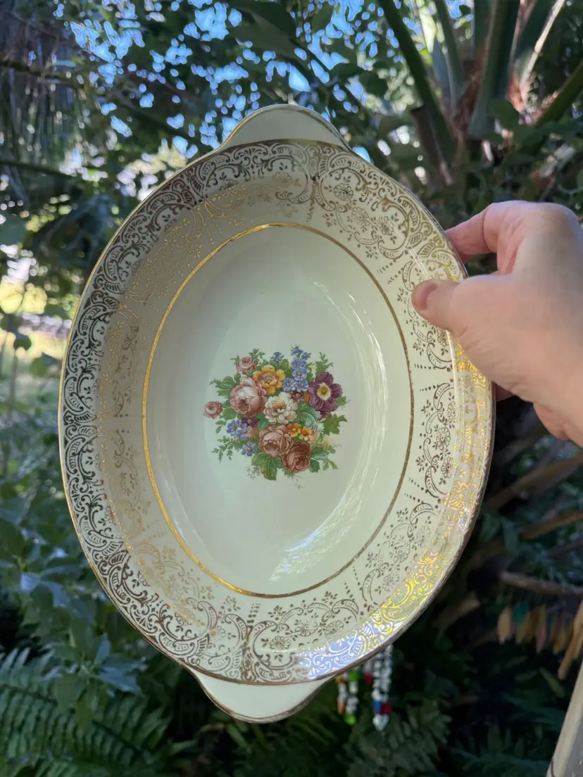 Features: • Origin: Marked Made in England (faint impression) • Pattern: Multicolor floral bouquet with gold filigree rim • Material: Semi-porcelain / earthenware • Finish: Gloss glaze with gold gilt trim • Era: c. 1940s–1950s • Size: Approx. 10.5” L × 7” W × 2.5” H • Condition: Excellent vintage condition with light age wear to the gold trim, consistent with age and use. No chips or cracks. • Hand wash recommended to preserve the gold detailing.