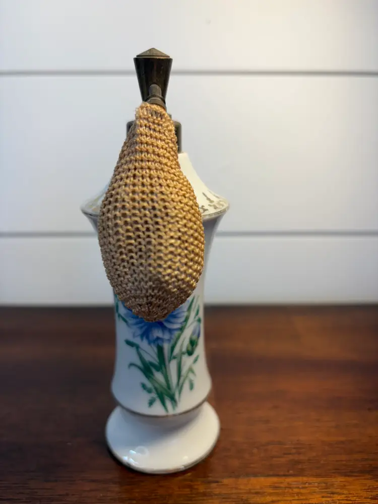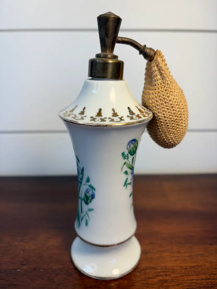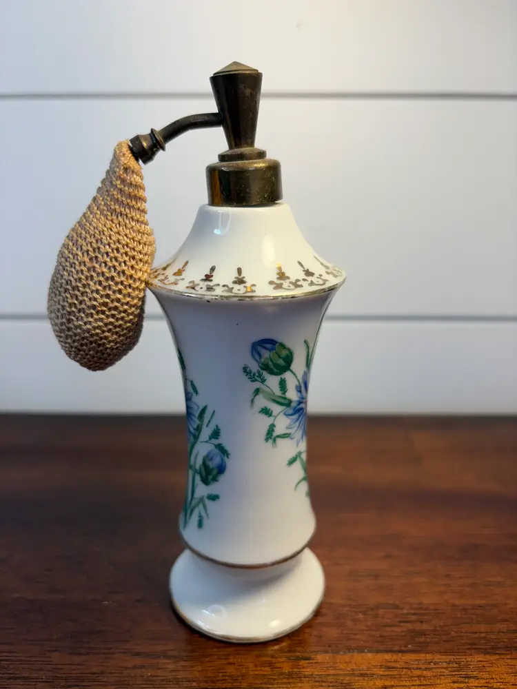 Charming vintage perfume atomizer with delicate blue floral design. Stands 6 inches tall. Brass top with hardened bulb.