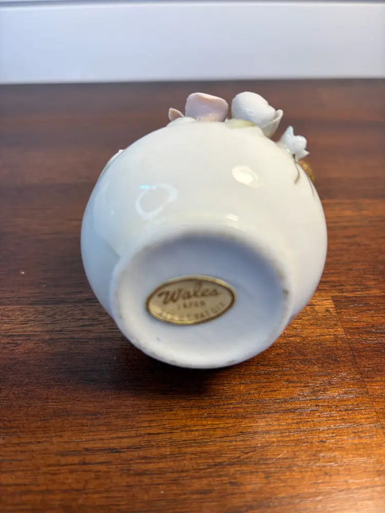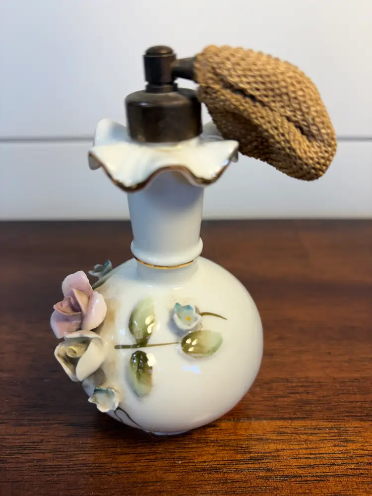 Charming vintage perfume atomizer with delicate floral accents. Stands 5 inches tall. Perfect for adding a touch of elegance to your vanity. 4.5 inches tall, 2.5 inches wide. Some chipping on the florals. Bulb is hardened.