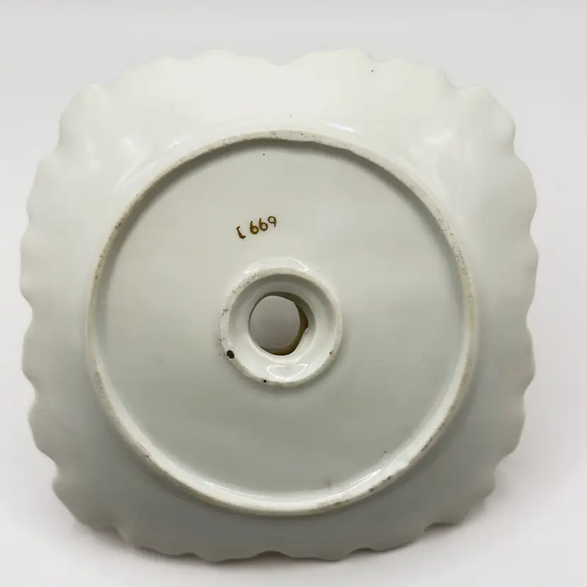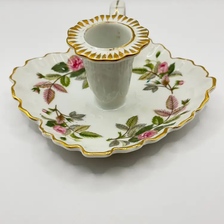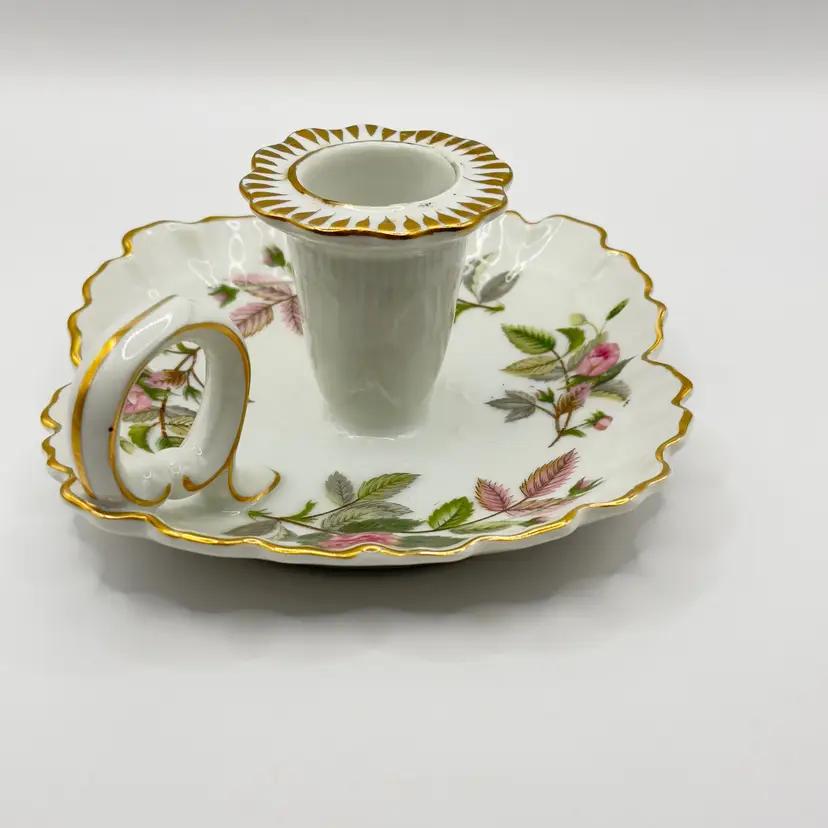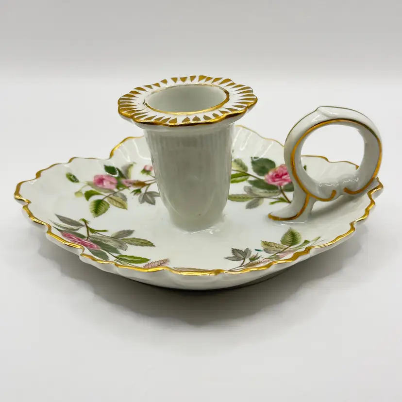 Illuminate your space with this charming vintage porcelain chamberstick. Featuring delicate hand-painted floral designs and elegant gold trim, it's perfect for adding a touch of classic elegance to any room. Ideal for collectors or as a unique gift. Excellent condition with no chips or cracks. Measures 6x5x3 inches. Weighs 1lb.