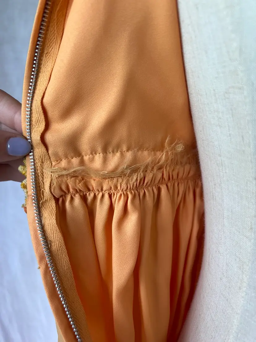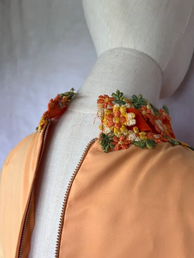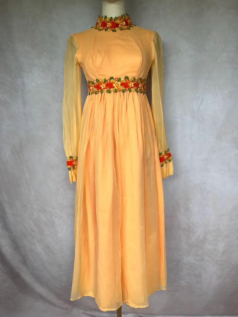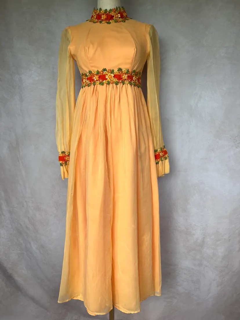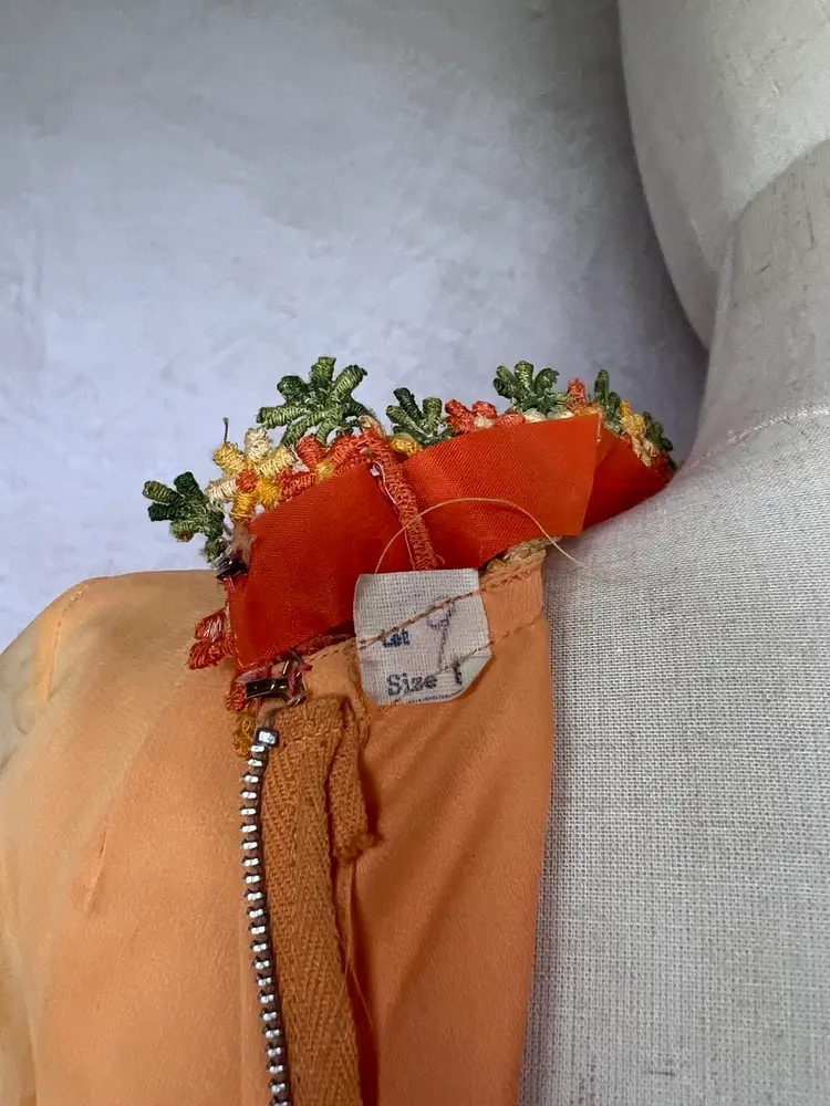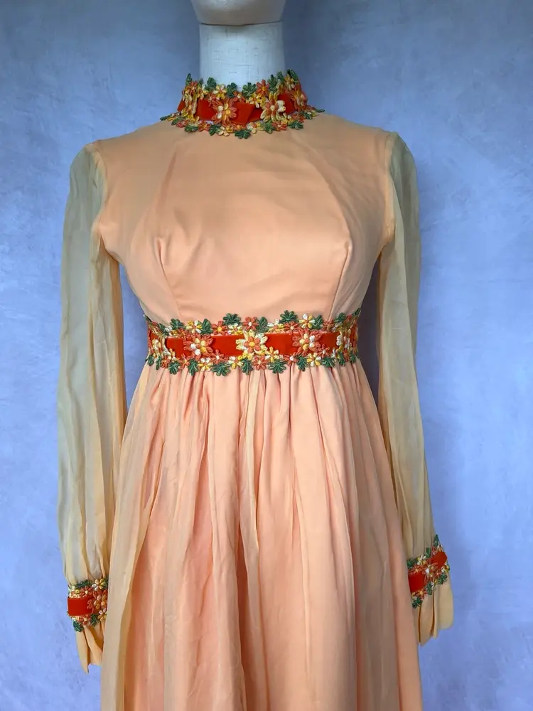 ๐ผ Appears handmade from the 70s ๐ผ Gorgeous peach color with embroidered flowers on the collar, wrists, and waist. These flowers have a velvet ribbon that run beneath them. ๐ผ Stunning sheer sleeves ๐ผ Good vintage condition, one small discoloration on the skirt noted ๐ผ Passing through smoke free home ๐ผ Color most accurate in the first photo