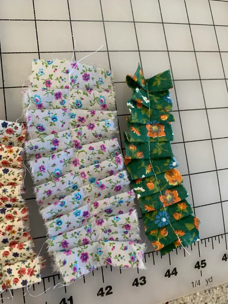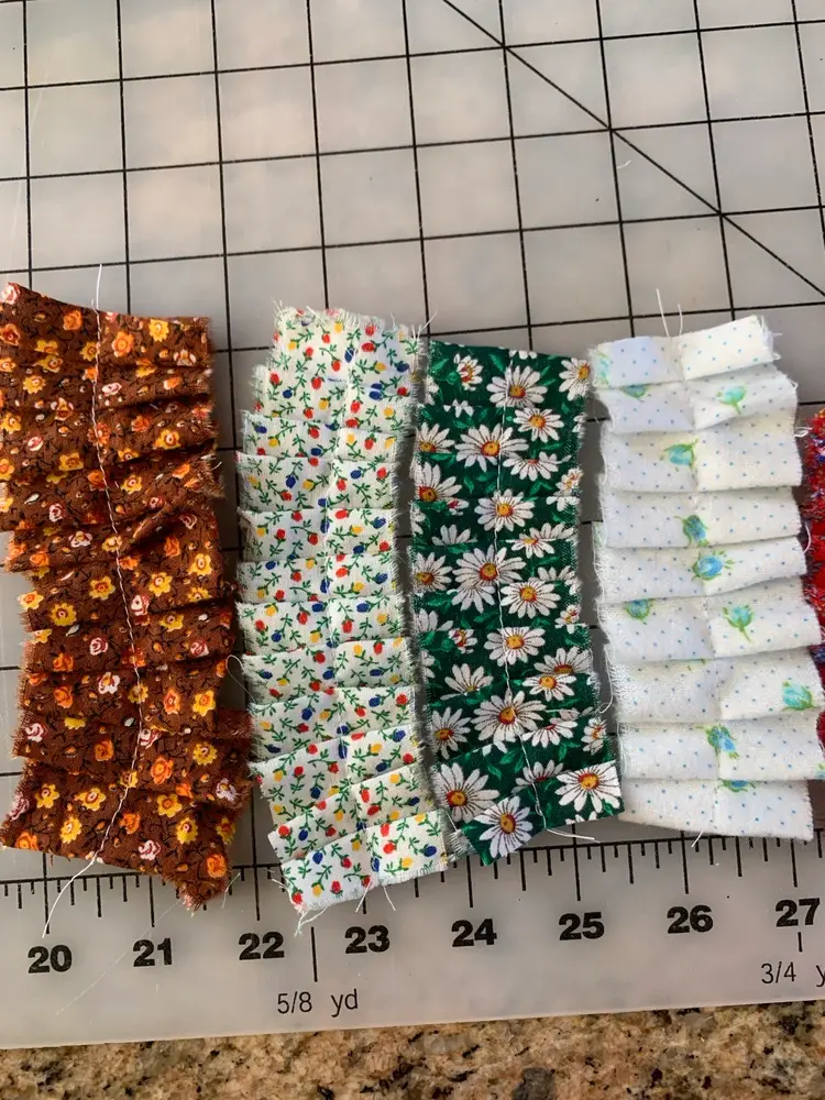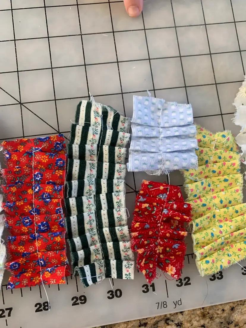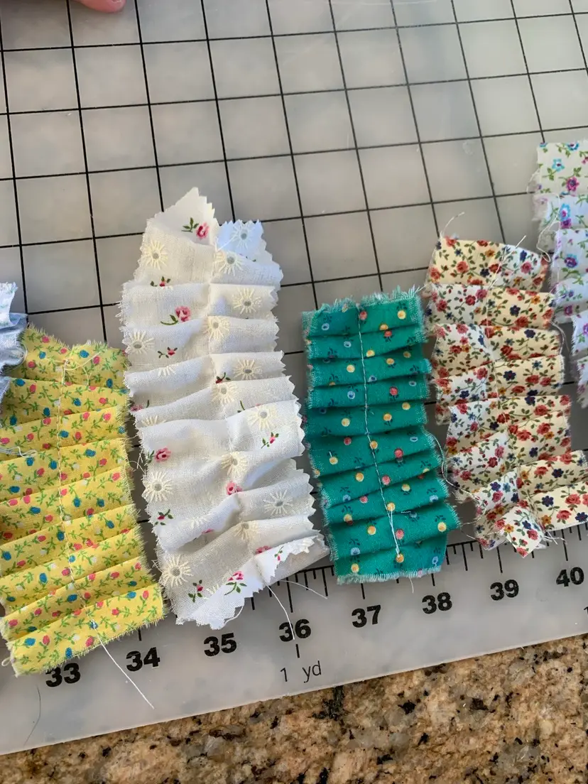 14 total ruffles, each different. Most fabrics are vintage and include Cranston and Calico company. Measuring 1-2 inches wide and 2-5.5 inches tall. Sewn with white poly thread and comes in a small organza drawstring bag.