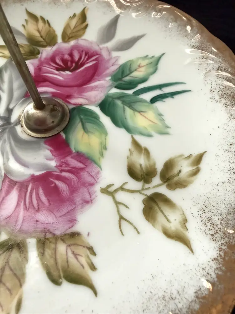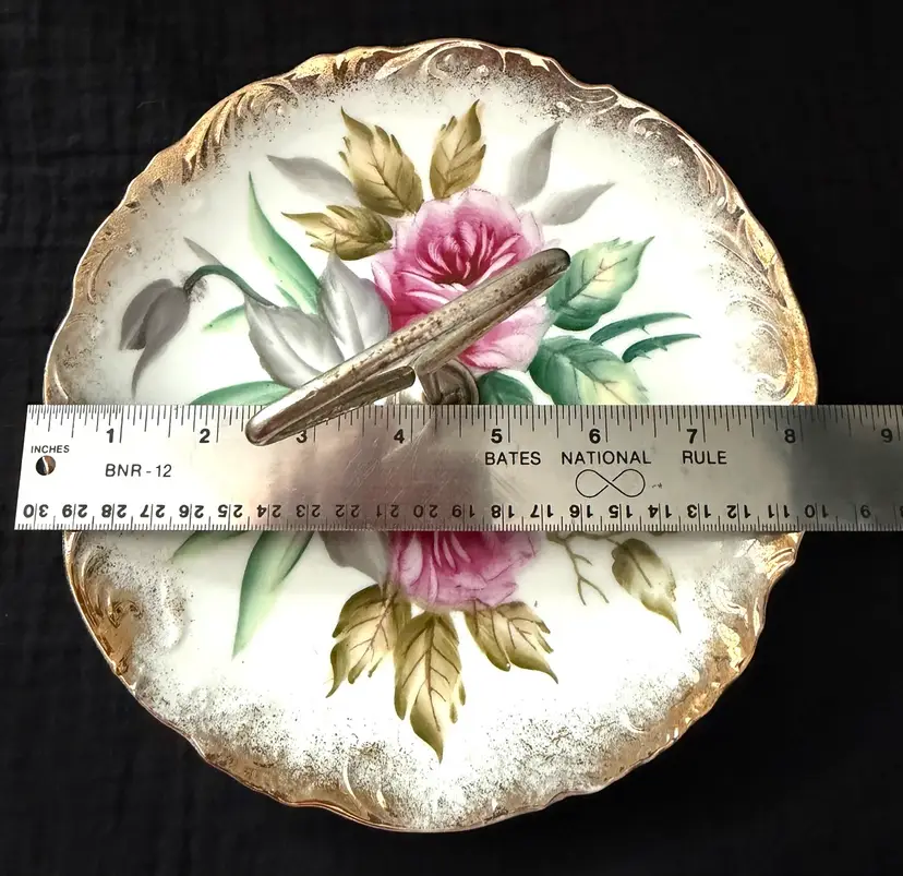 Beautiful roses adorn this platter with handle in the middle. The beautiful gold trim makes the colours of the roses pop.