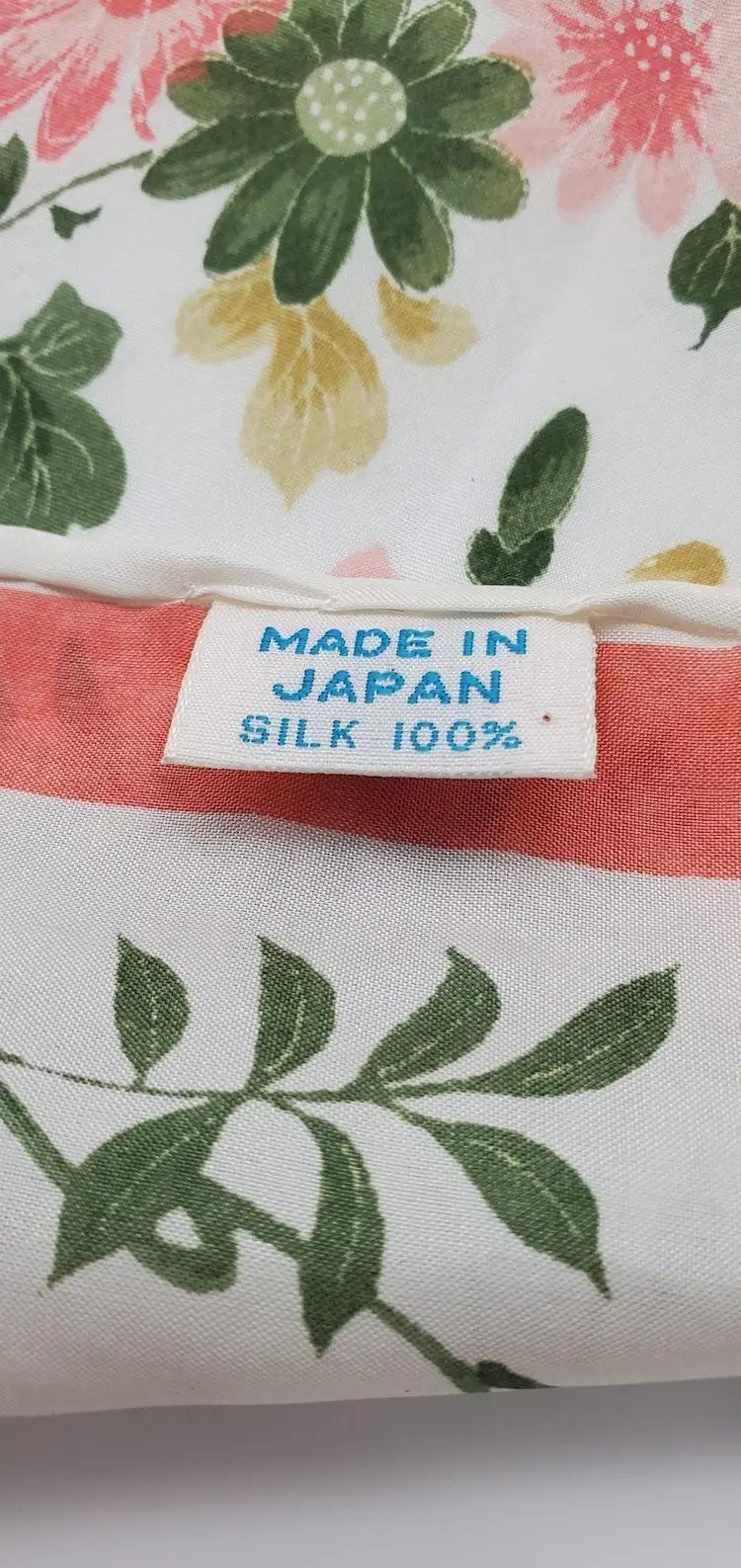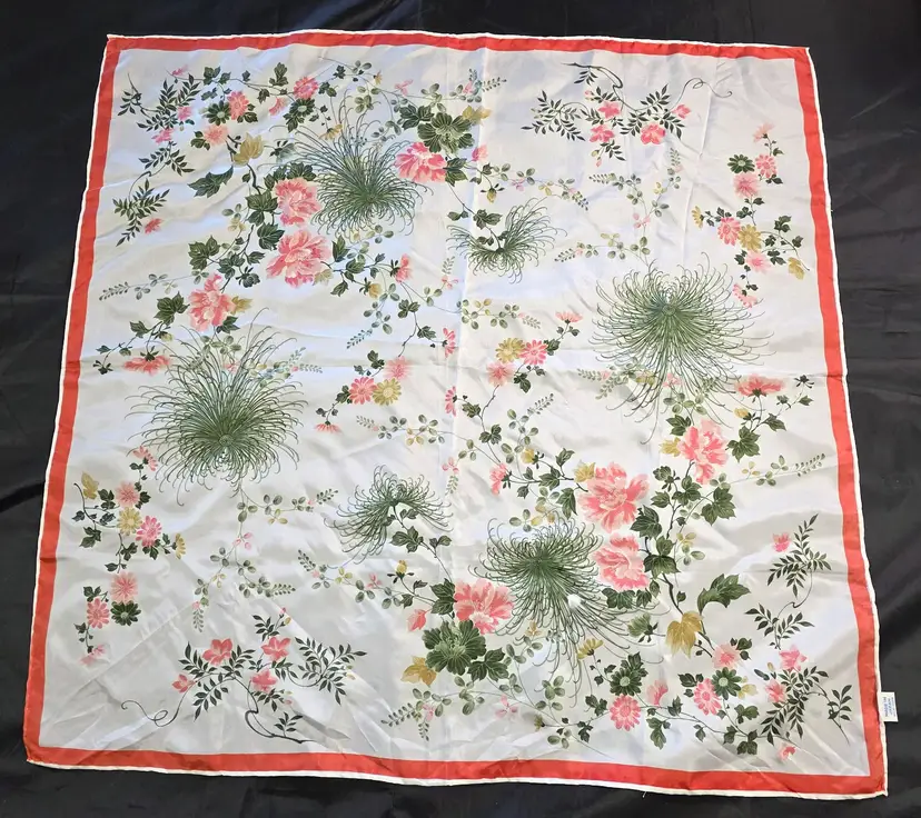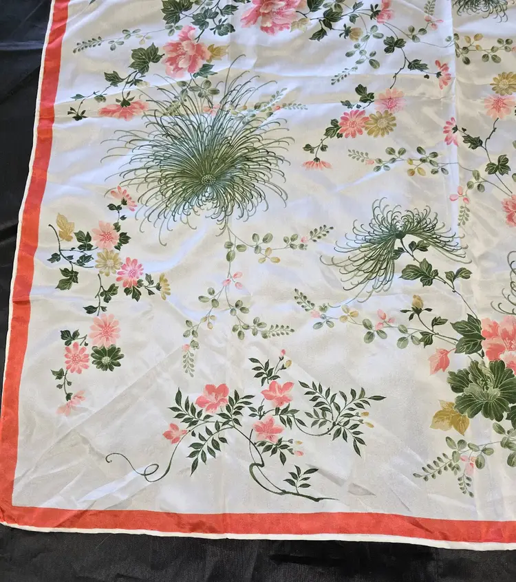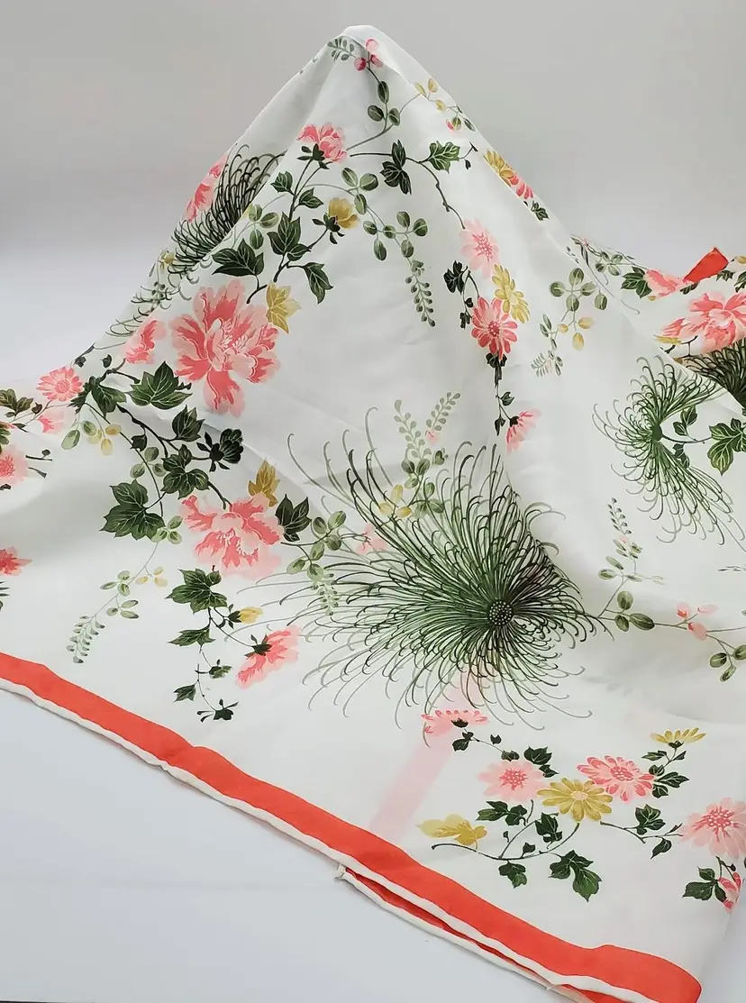 This gorgeous floral silk scarf depicts pink flowers surrounded by green foliage. The Made in Japan tag indicates 100% silk.
