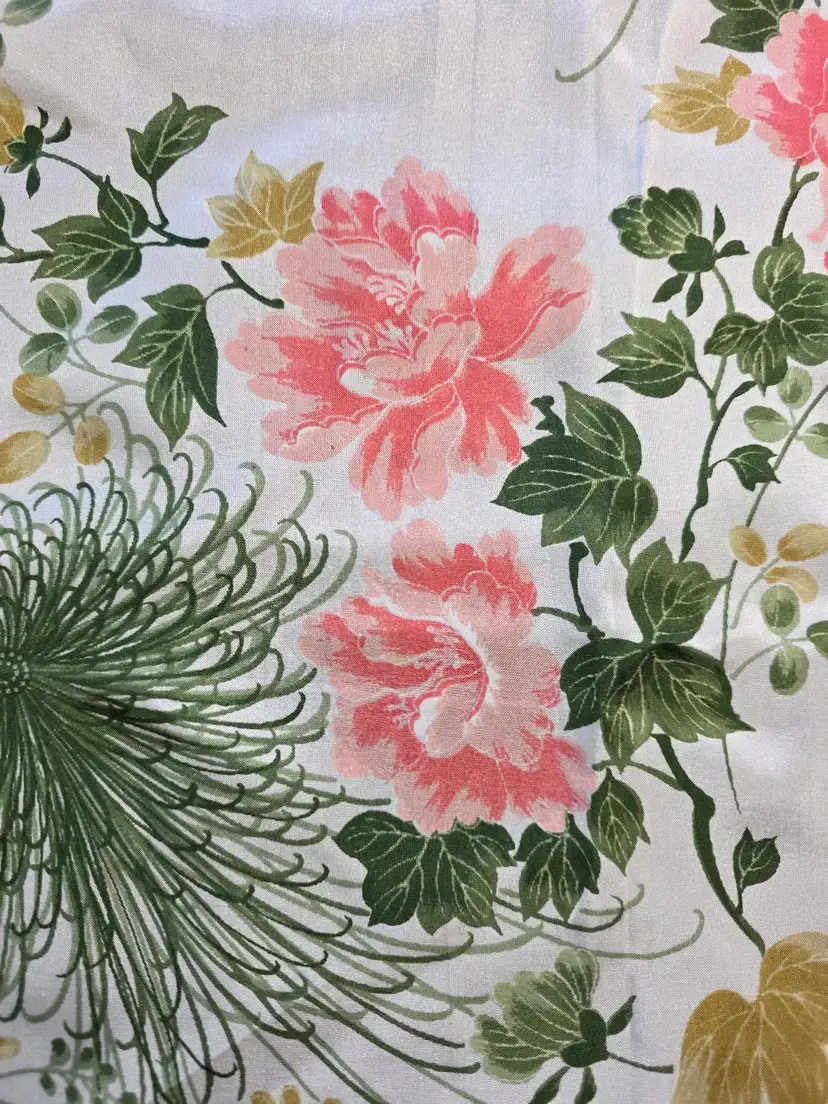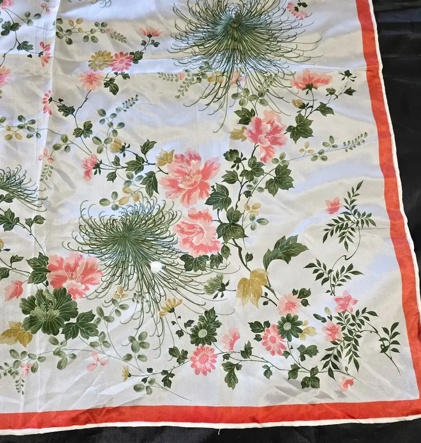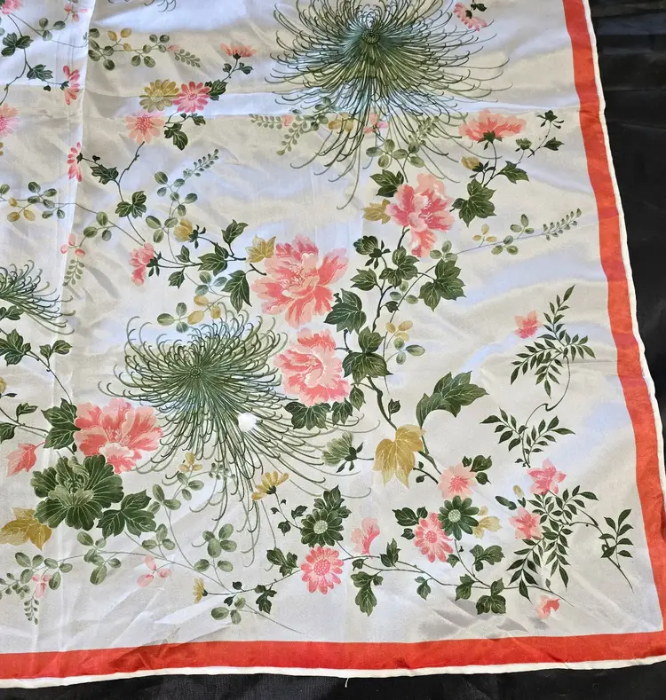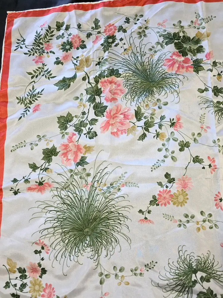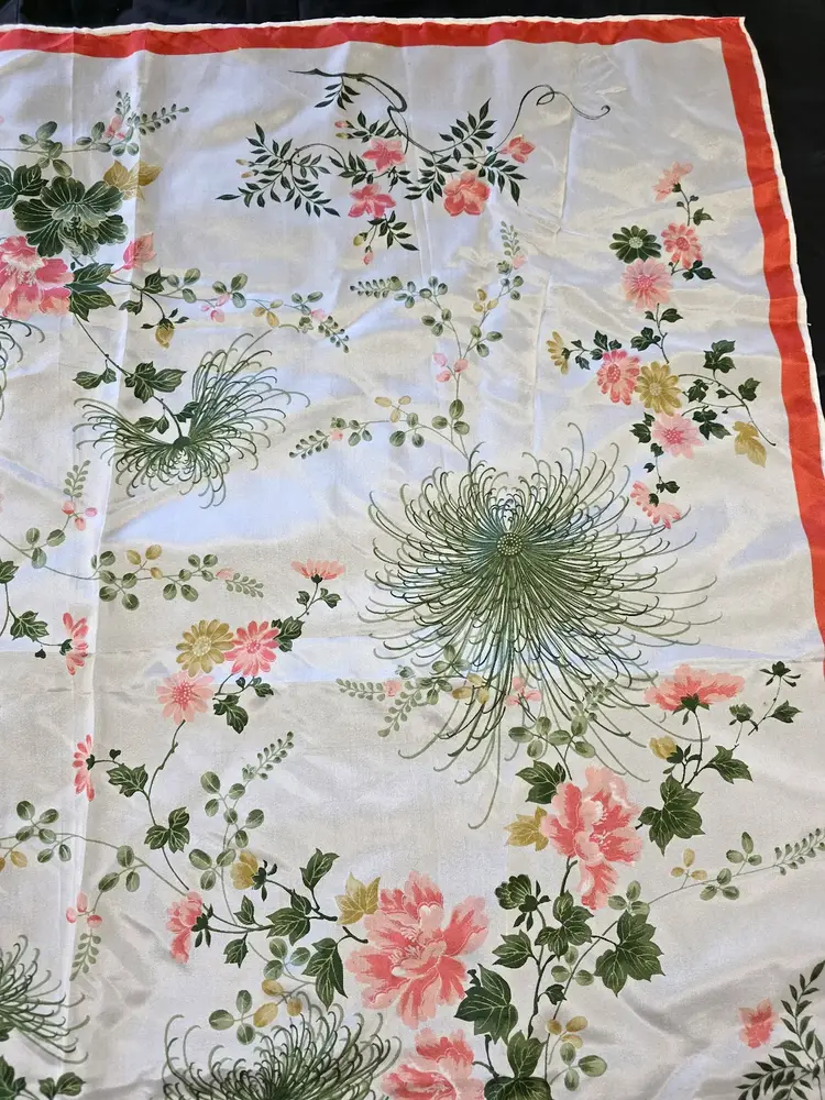 This gorgeous floral silk scarf depicts pink flowers surrounded by green foliage. The Made in Japan tag indicates 100% silk.