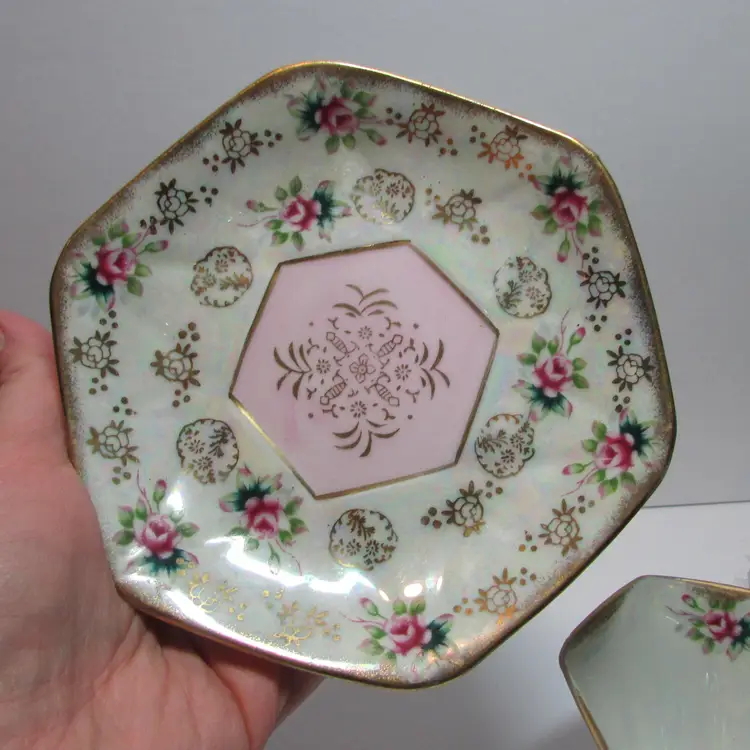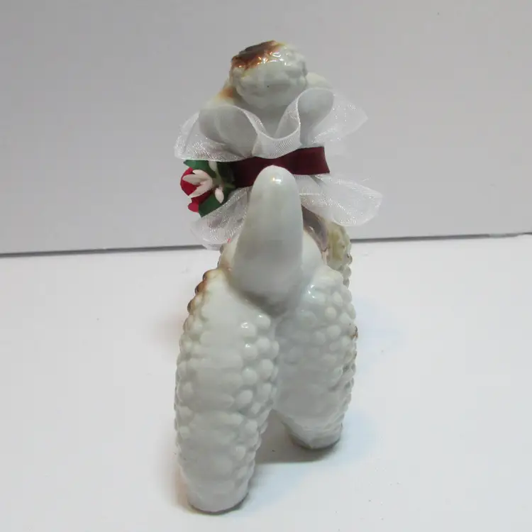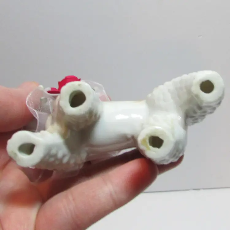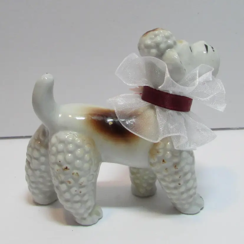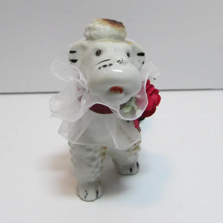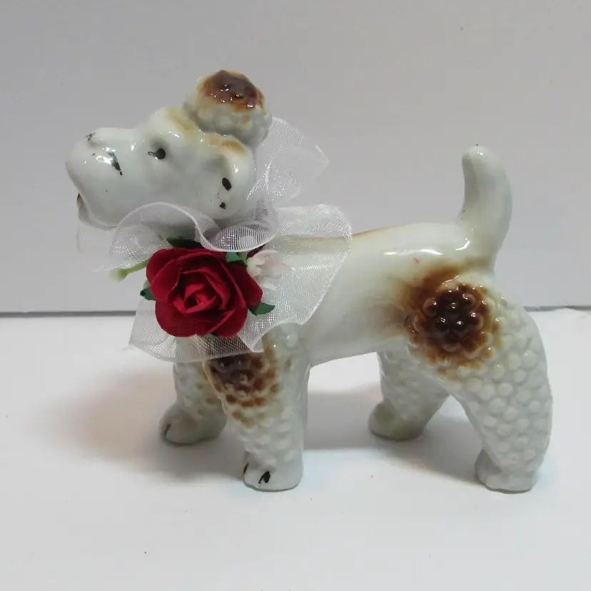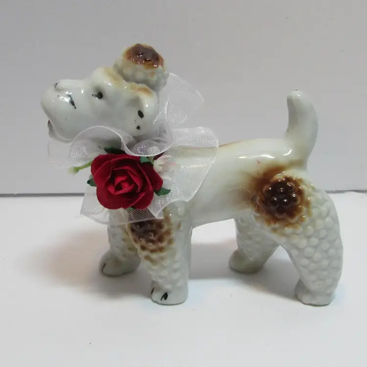 This lovely set has some wear, there is some fading on the cup and saucer. The dog has a crack on his neck, but it was glazed over. The bow around it's neck is not glued to the figure, so it can be removed (just wanted to give him a Valentine look). The saucer is about 6" round, the cup is about 3" x 3 1/4" x 4 1/2" and the dog is about 3" tall. This is shipped from a smoke free home. Thanks for looking! locub58