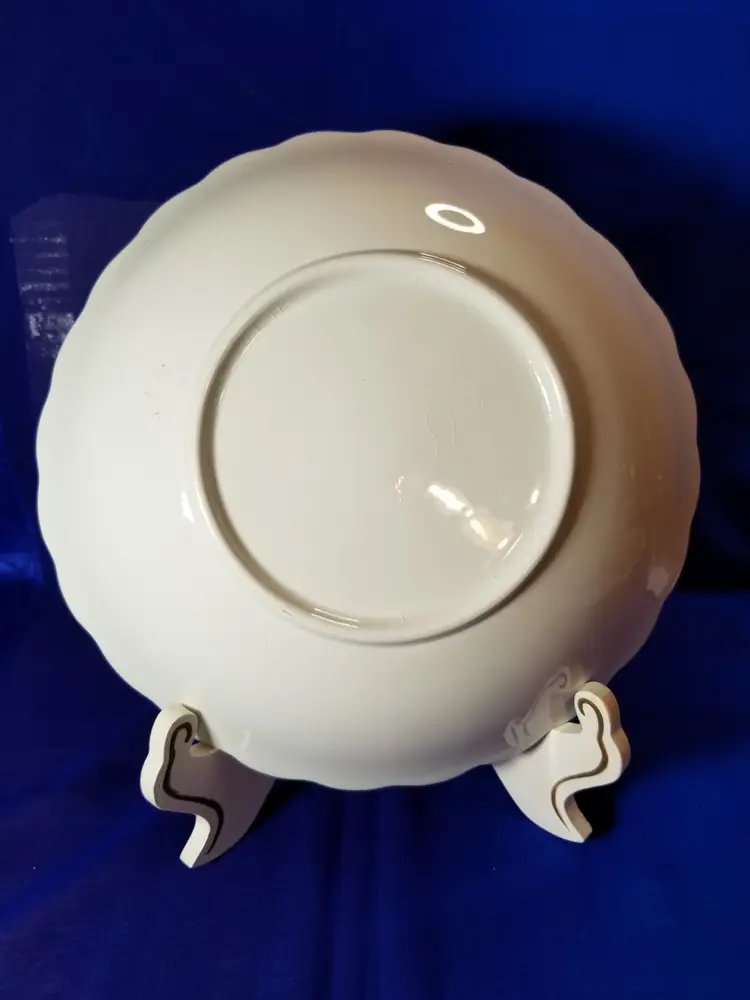 Vintage Floral Vegetable Bowl signed Renier is 10 1/2" wide. It features a beautiful rose applique with hand-painted detail over a yellow, blue and green bowl with a scalloped rim gilt in gold. It shows a slight bit of edge wear and a few utensil marks/scrapes in the flowers. It is signed Renier, but not marked on the back. No chips, cracks or repairs. Please view pictures and feel free to ask questions. Thank you for visiting my shop.