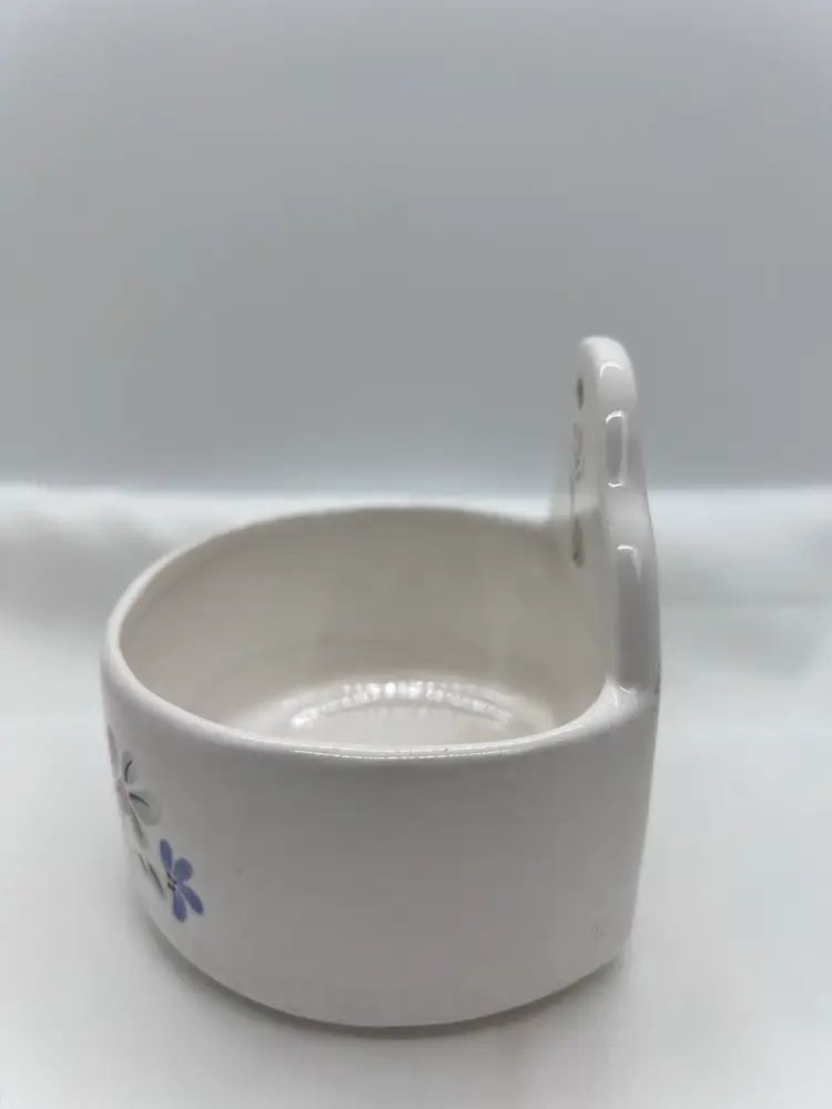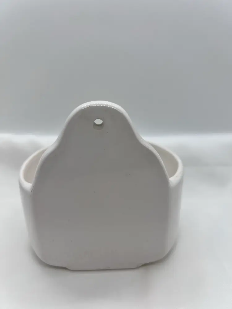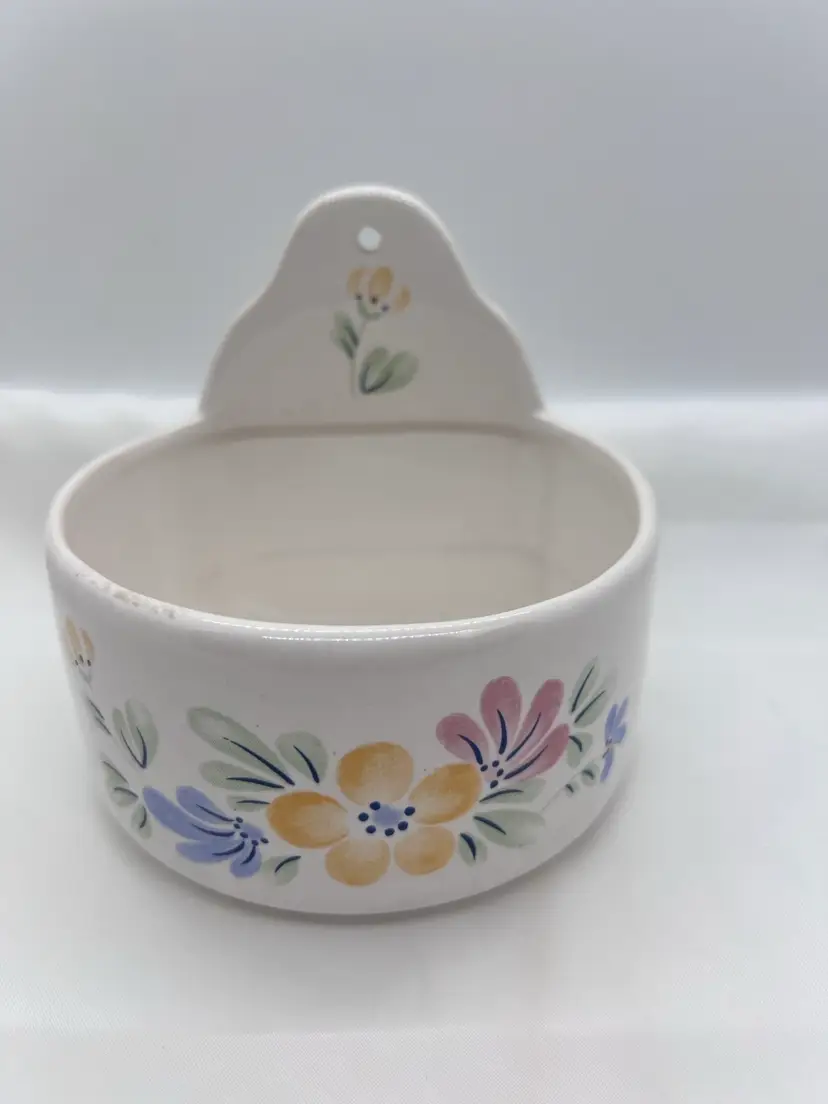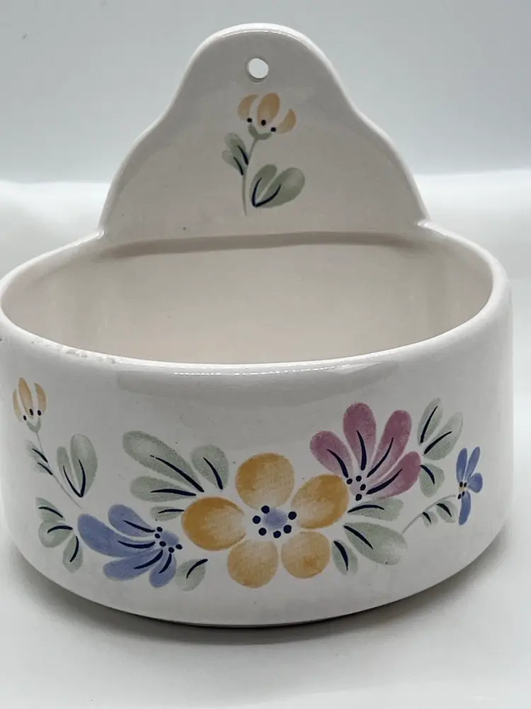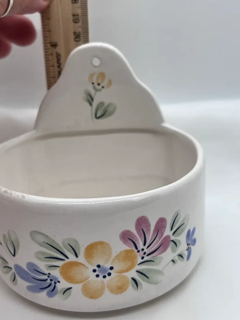 Lovely vintage withe ceramic wall pocket planter or ring holder with hand painted floral design. Crowning Touch Collection