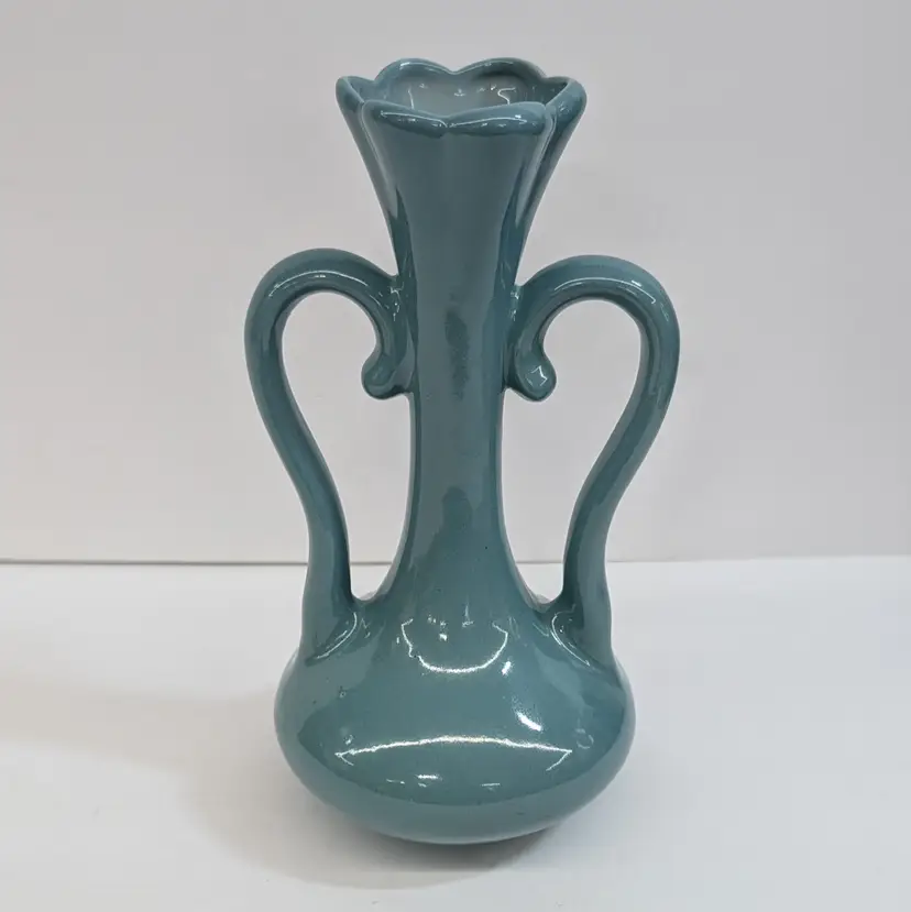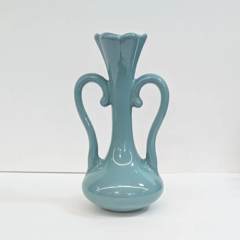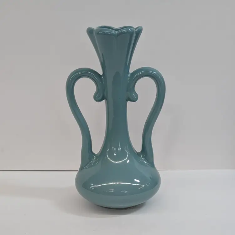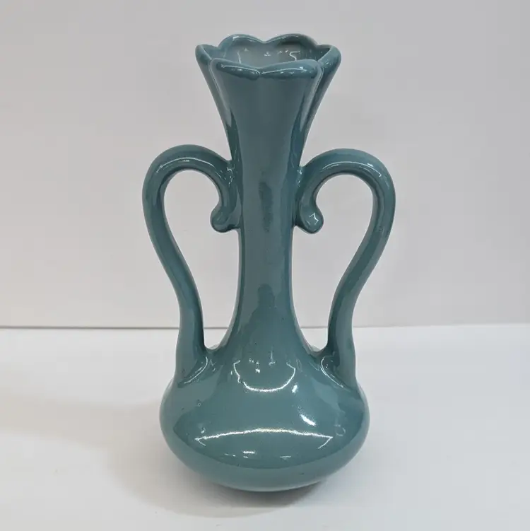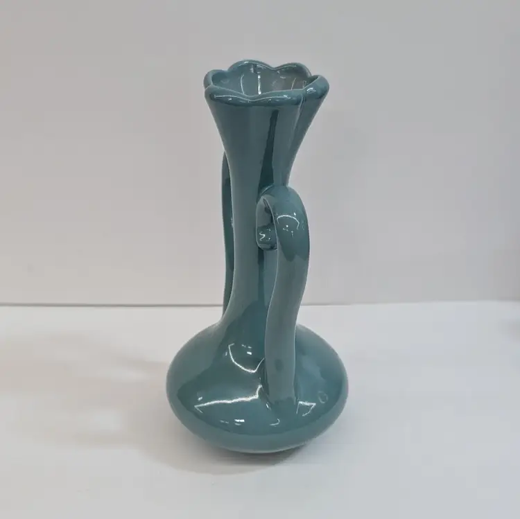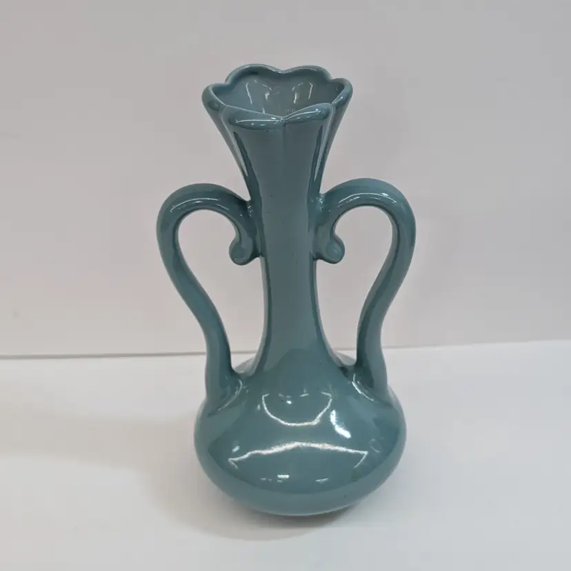 Lovely vase from Floramics made in Florida. It has a petal top and swan-neck double handles. It is in nice, vintage condition with s couple spots on the glaze that I couldn't get to wipe off (see pictures). It's a nice glossy duck egg blue color with a hint of green, much prettier than it's coming through in the pictures. Measurements ~ 3.5 x 4.5 x 7.25"