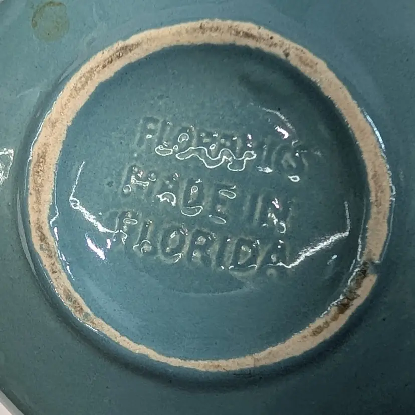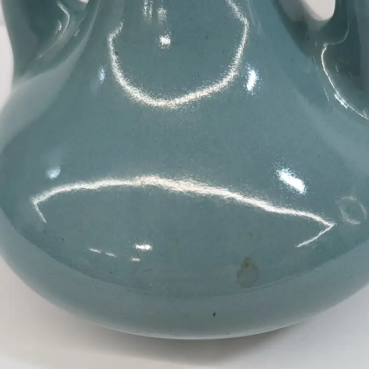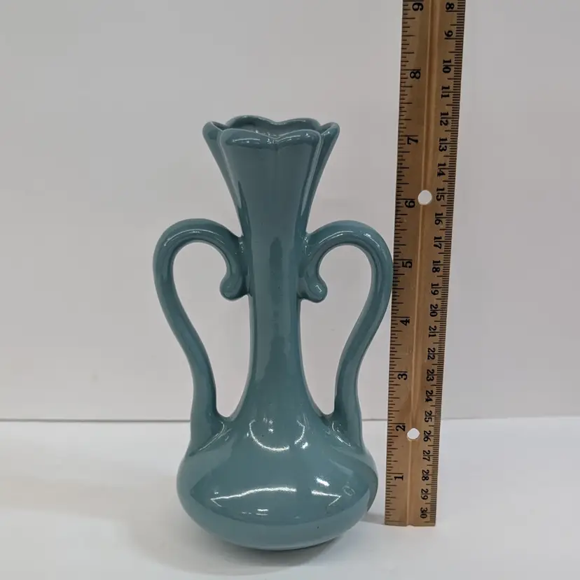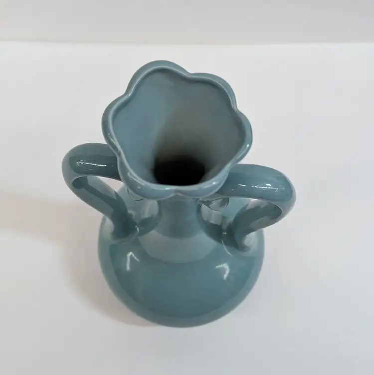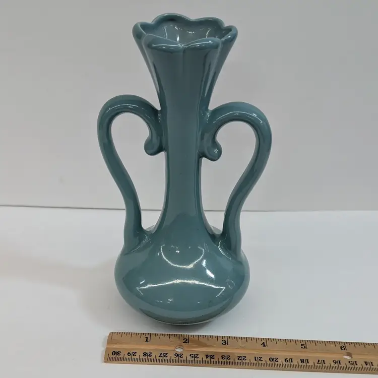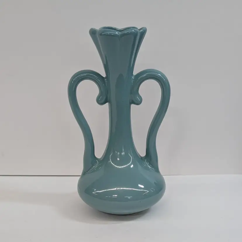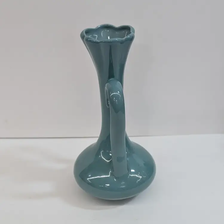 Lovely vase from Floramics made in Florida. It has a petal top and swan-neck double handles. It is in nice, vintage condition with s couple spots on the glaze that I couldn't get to wipe off (see pictures). It's a nice glossy duck egg blue color with a hint of green, much prettier than it's coming through in the pictures. Measurements ~ 3.5 x 4.5 x 7.25"