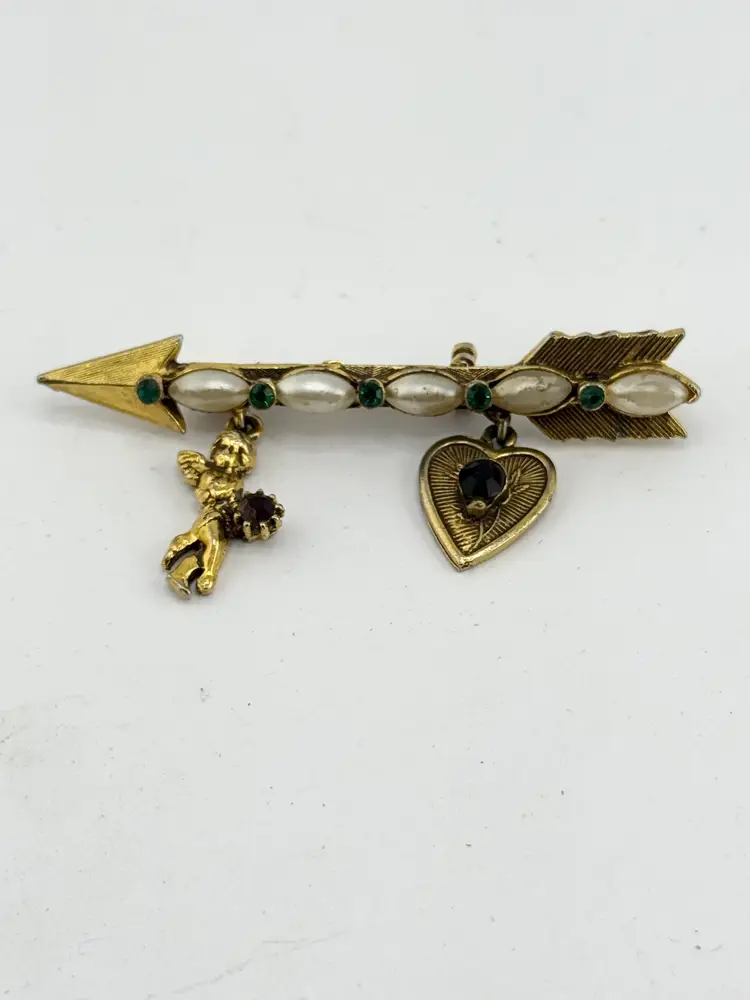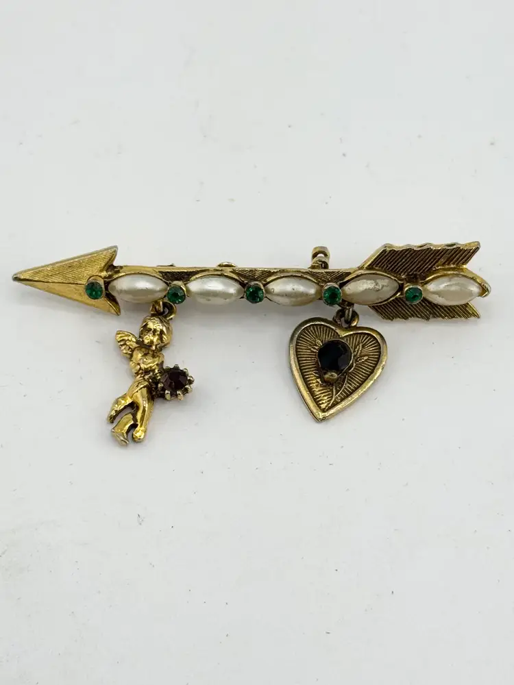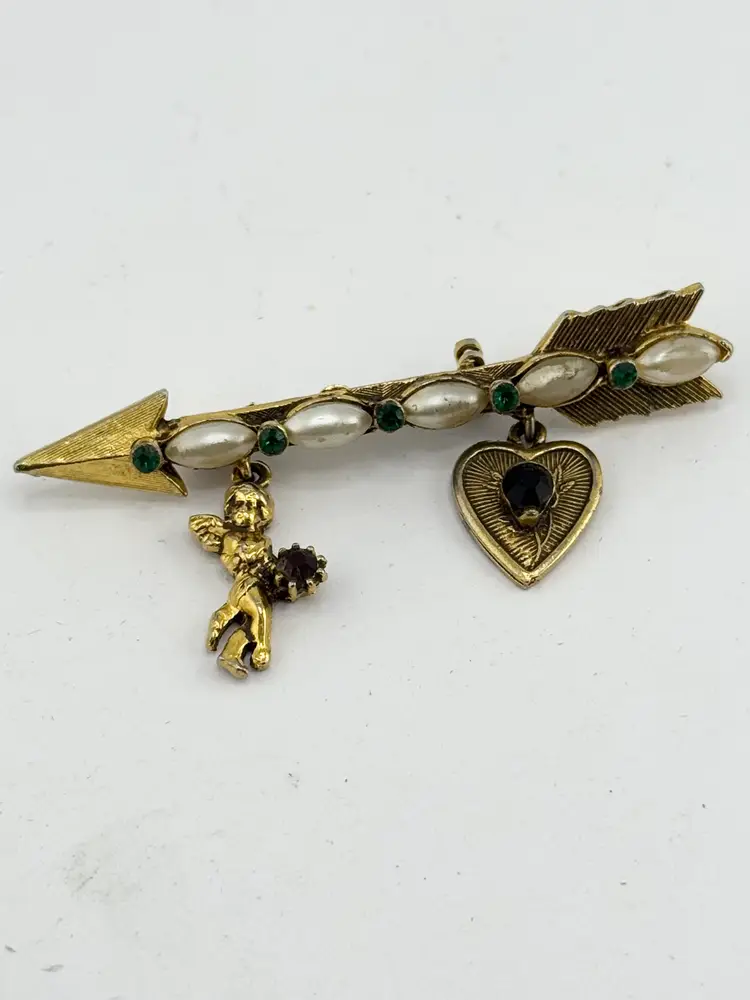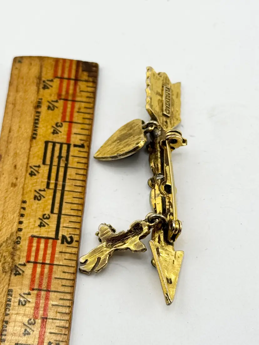 Vintage Florenza Arrow heart angel Cupid rhinestone brooch pin. Signed Florenza with hanging Cupid baby angel and heart. Colored rhinestones. Arrow shape. Vintage Florenza brooch pin. MN53HG.