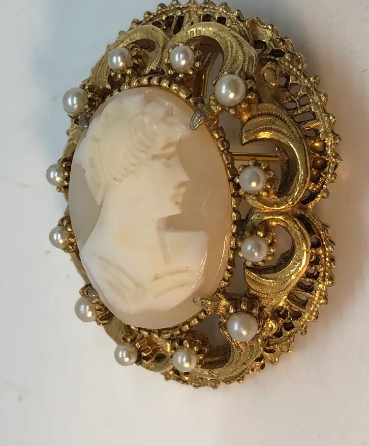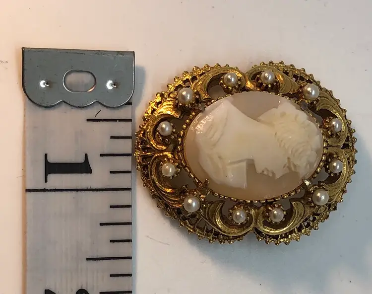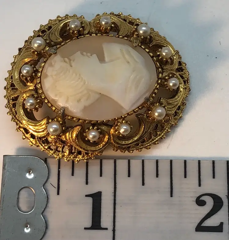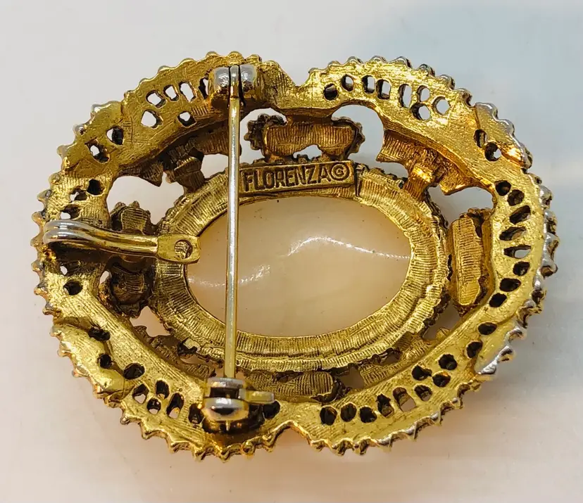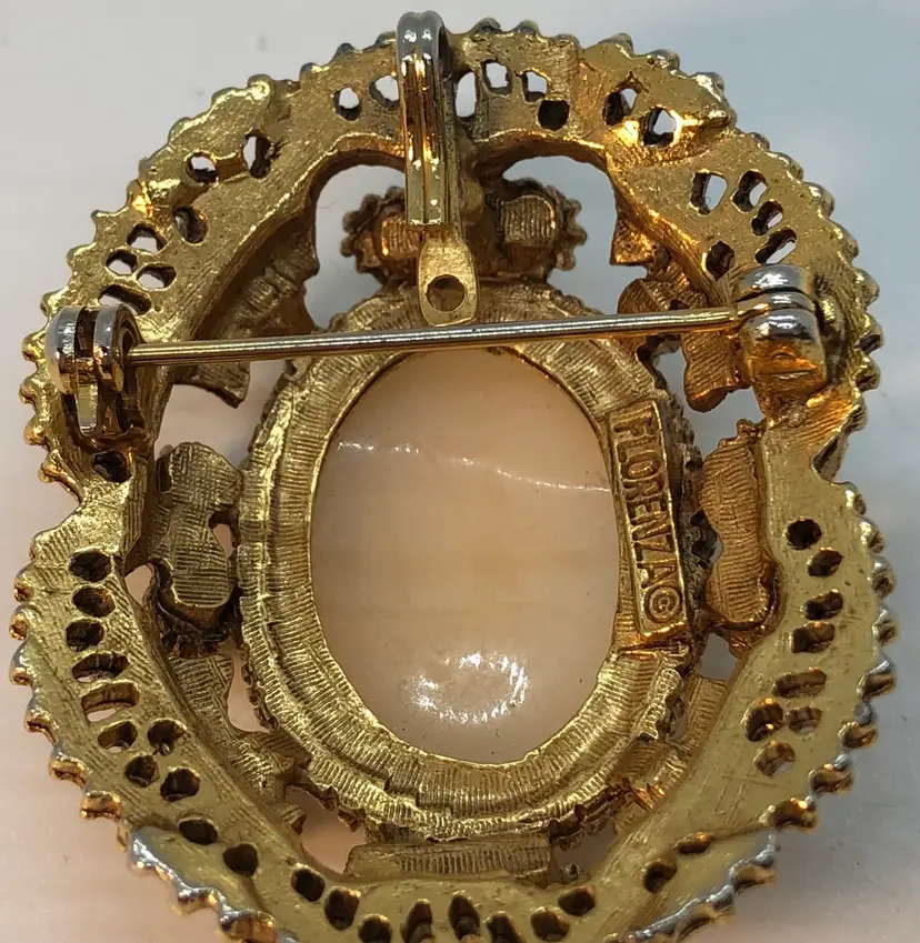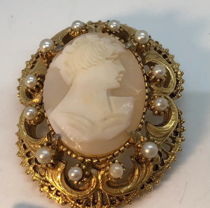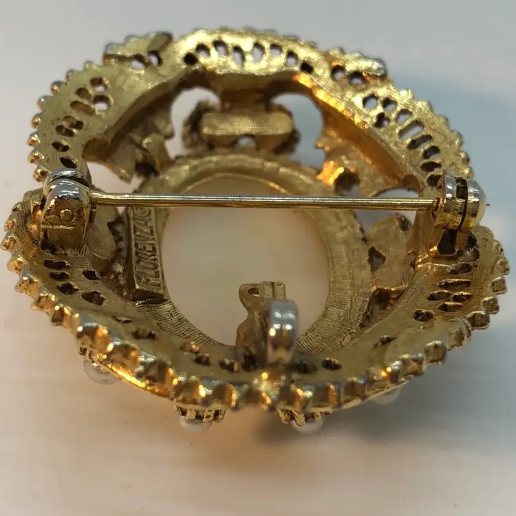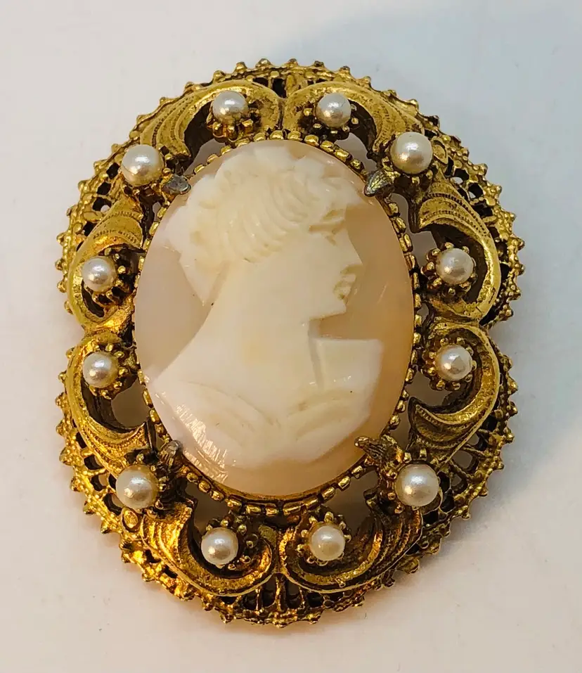 This exquisite vintage brooch pin from Florenza is a true jewelry masterpiece. With delicate carved shell cameo and faux pearl accents, it exudes elegance and sophistication. The gold tone metal adds a touch of luxury to the design, making it a perfect addition to any fashion collection.