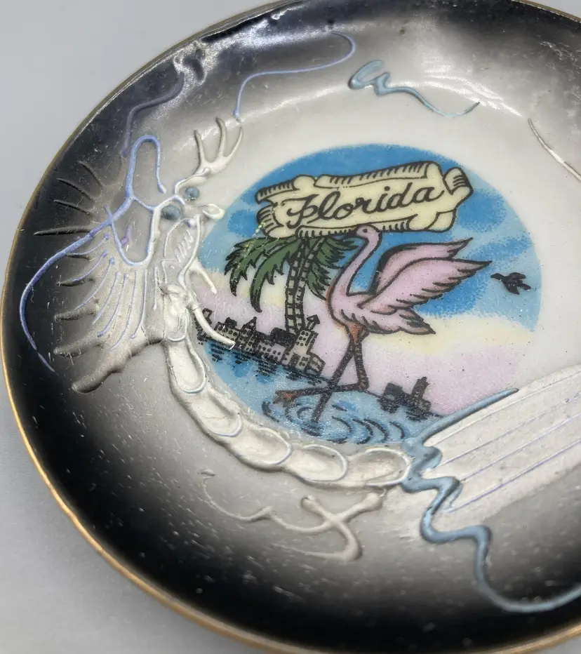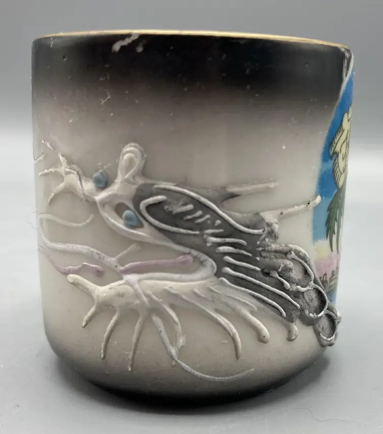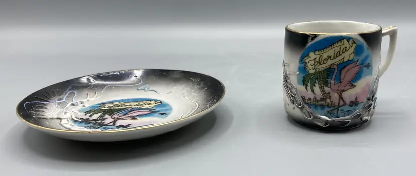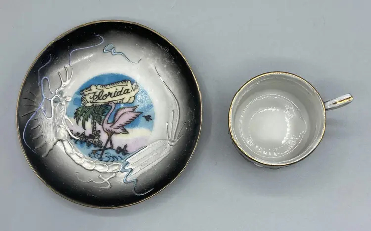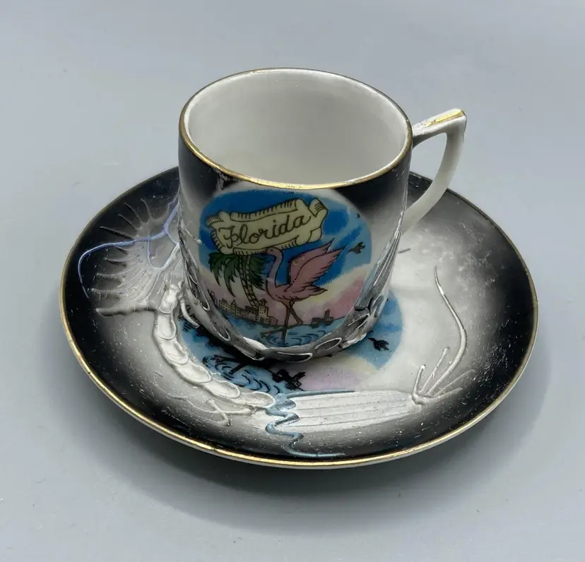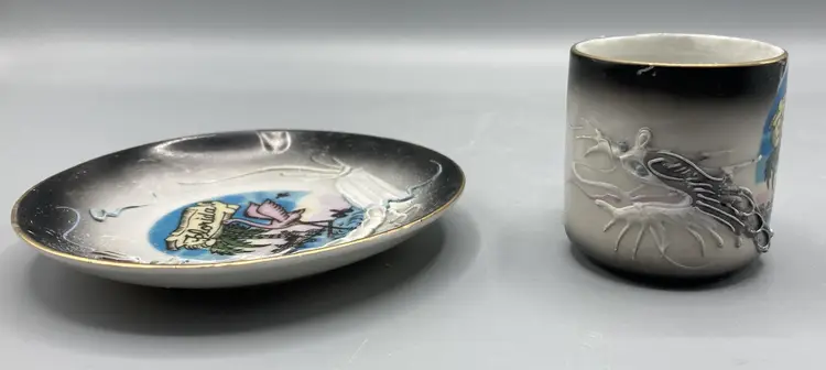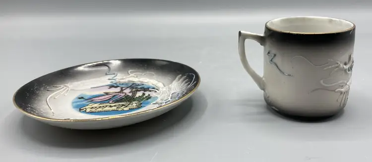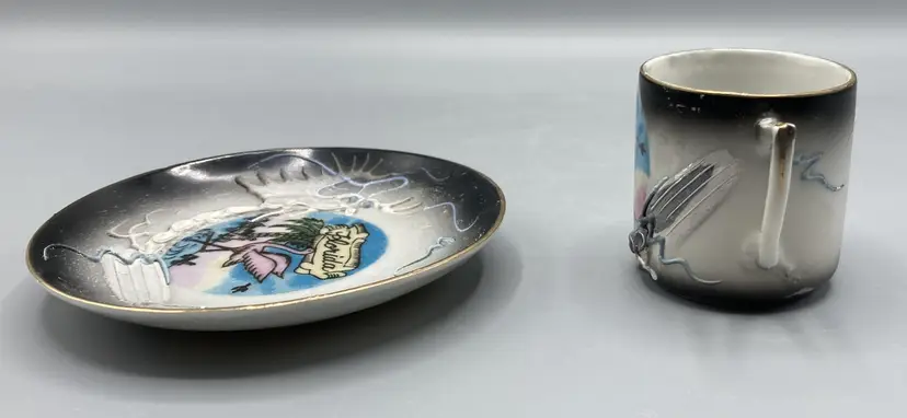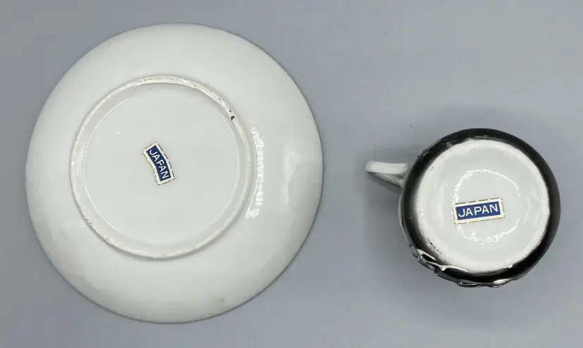 This cup and saucer set is overall good condition. There are some wear, scratches, and paint loss here and there. Please see pictures for specific details. The cup measures approximately 2 1/4" across including the handle. Without the handle, the cup opening is approximately 1 3/4" wide and 1 3/4" tall. The saucer measures approximately 4" across.