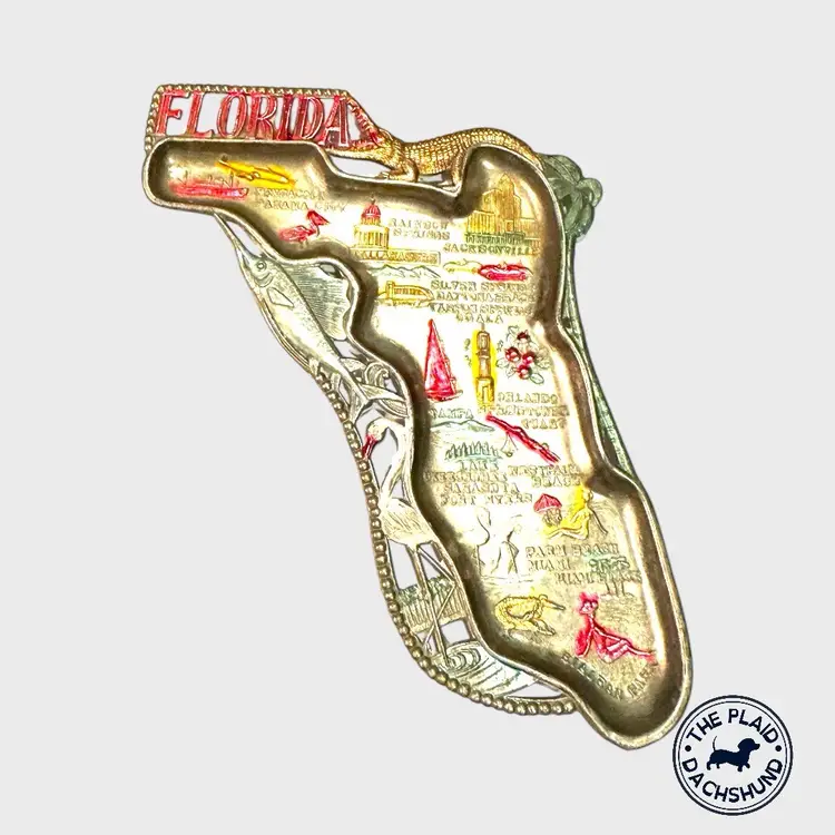 Fabulous Florida shaped trinket dish from the 60’s! Depicts popular sites in Florida. Made of tin in Japan.