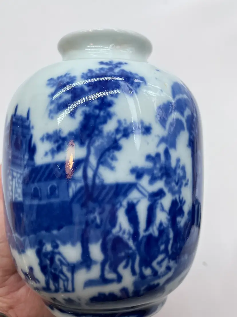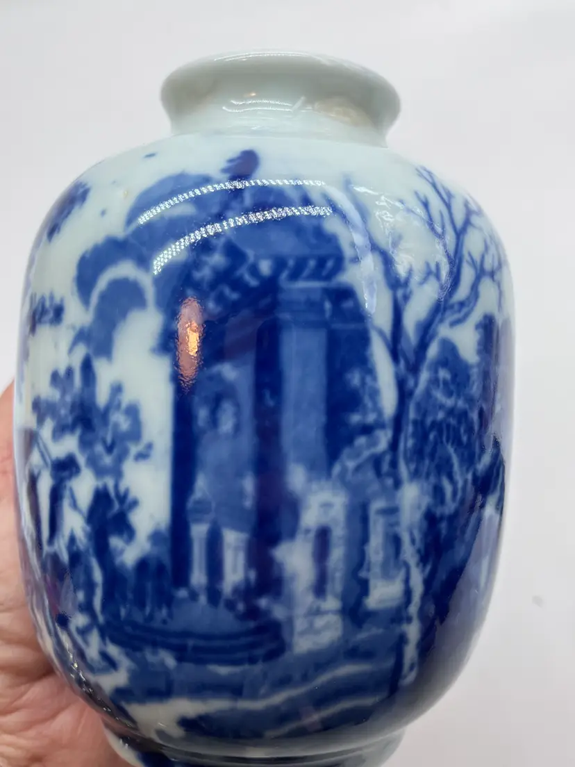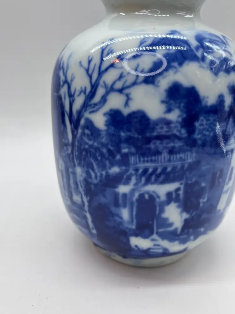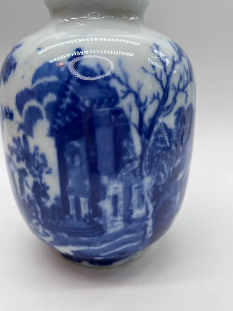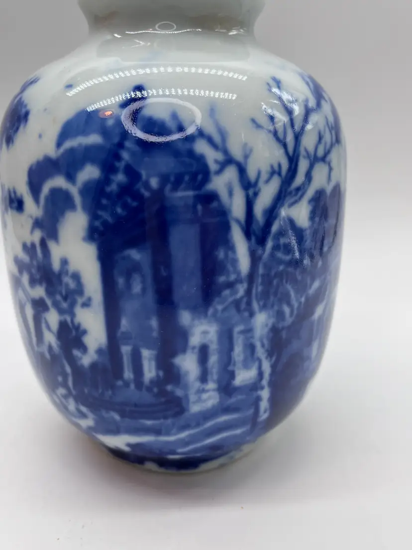 A Beautiful Victoria Ware ironstone flow blue cobalt tall vase, depicting what looks to be pastoral village life. The base is stamped with a maker mark, but it is illegible. The pattern matches other catalogue pieces by this maker.