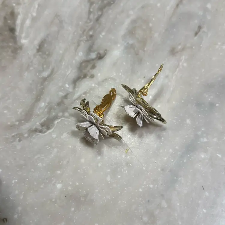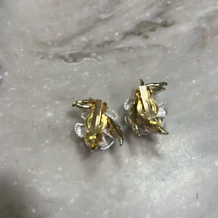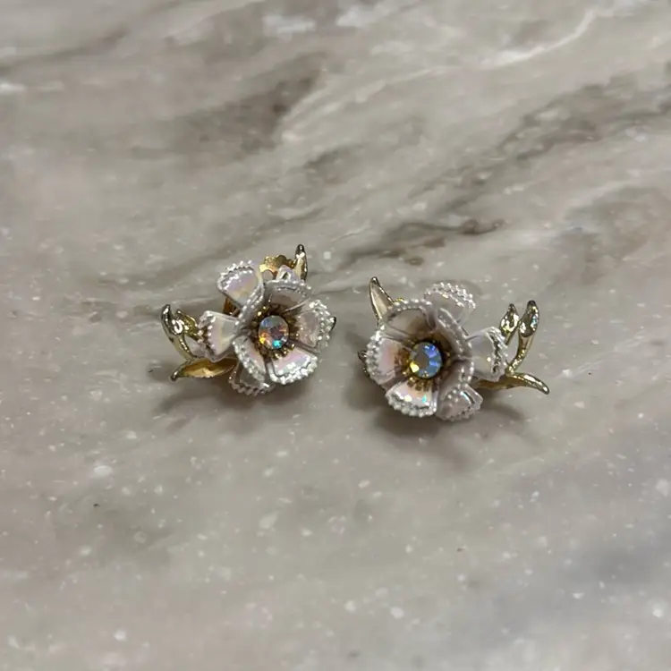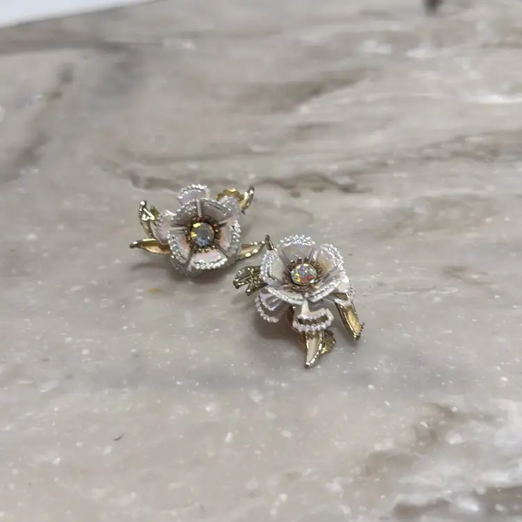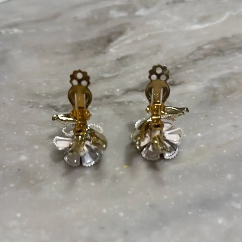 Very pretty preowned clip on earrings. Unmarked Gold tone Enameled Faux pearl. Unknown age but very good condition