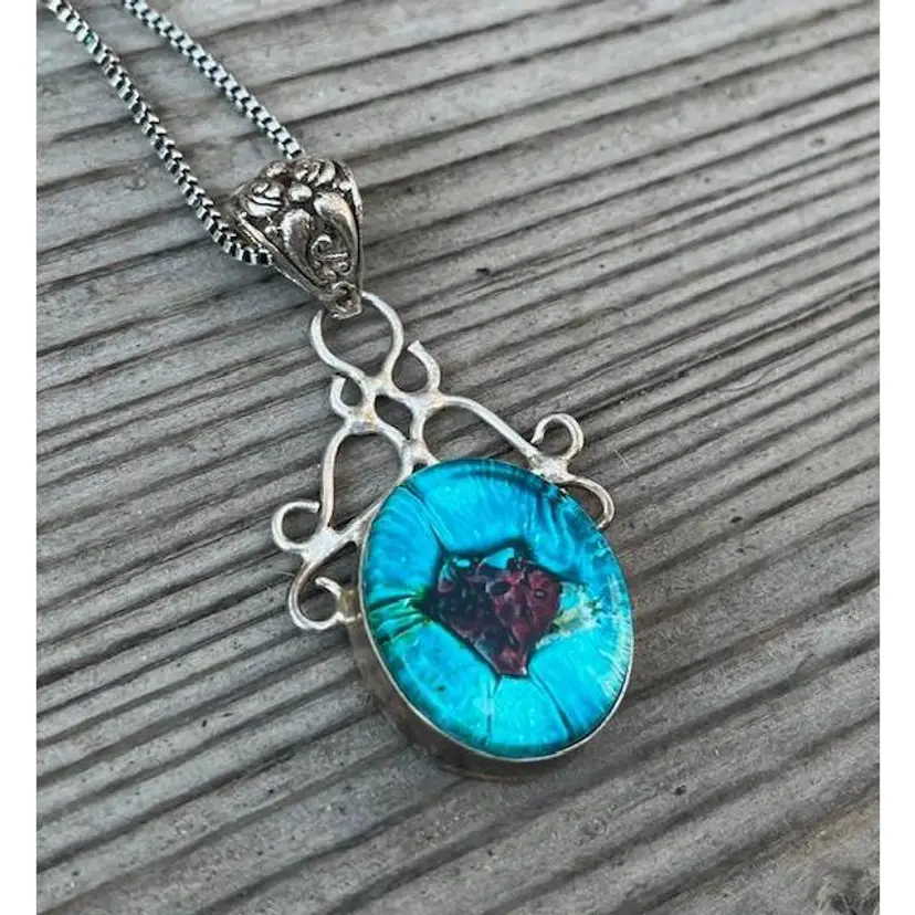 This vintage pendant is cool! Approximately 1 1/2 inches long and 7/8 of an inch wide. On a 18 inch sterling silver chain.