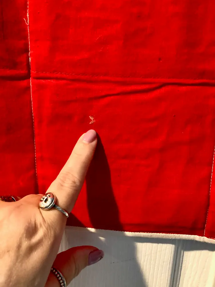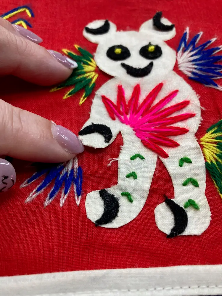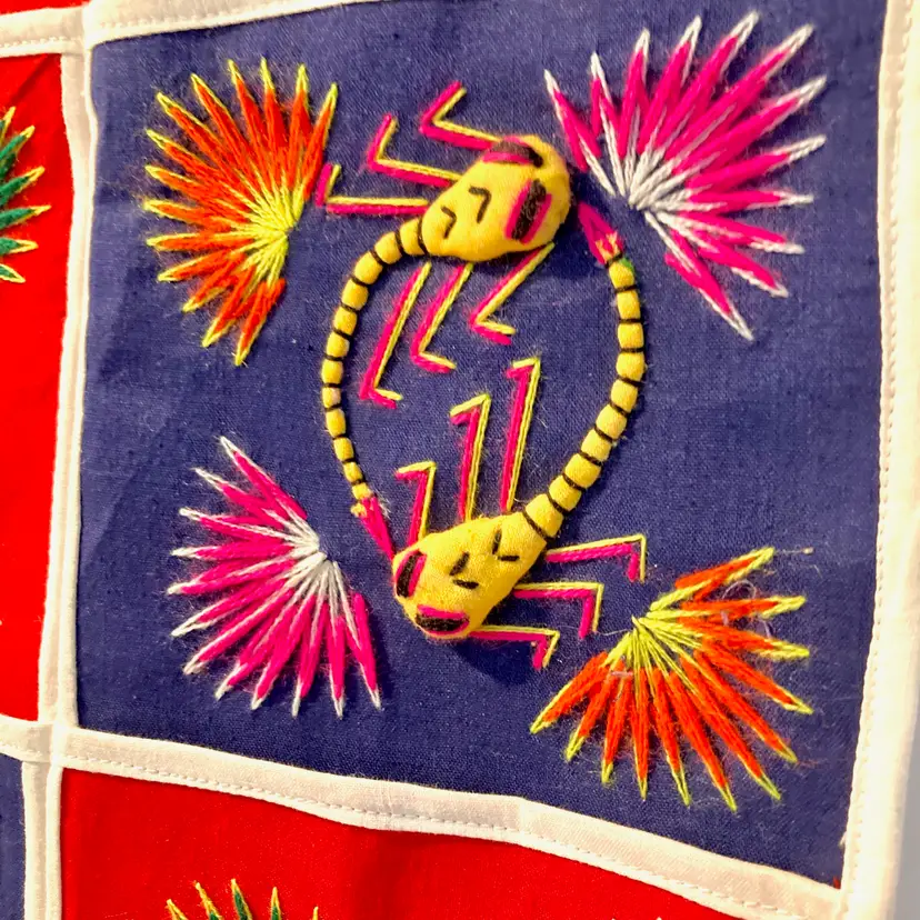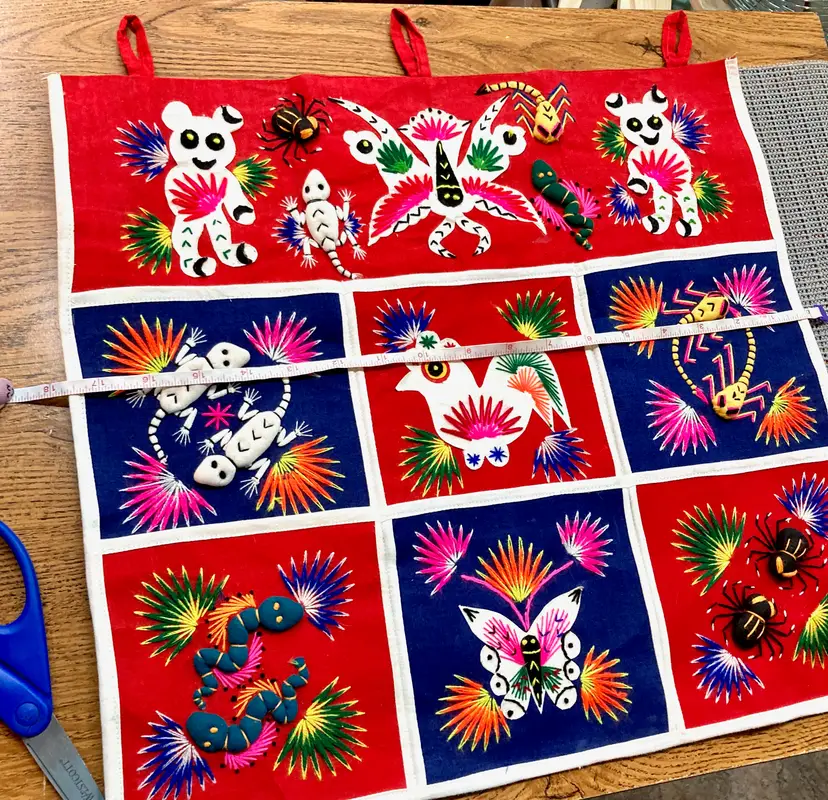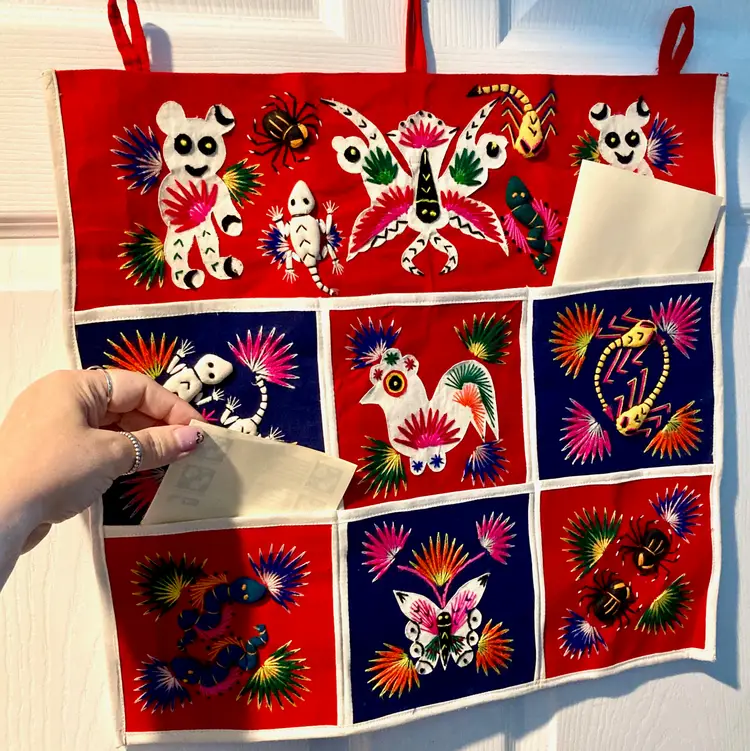 Vintage Asian Tapestry w/ Pockets ~Bright red backing fabric w/ hand embroidered animals, reptiles, and bugs(most are 3D!) ~6 individual pockets for mail, notes, cell phone, keys, hair supplies, etc ~Has 3 loops for hanging on your wall or door ~Measures aprox: 18' X 18" ~Has a couple specks of dried glue and the end of one of the bear's hands has curled up(can be re-glued) ~Very cute unique piece of Asian art that I found in an antique mall