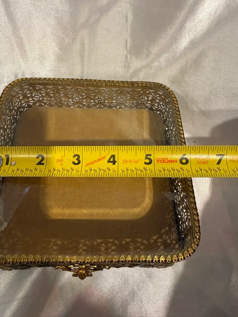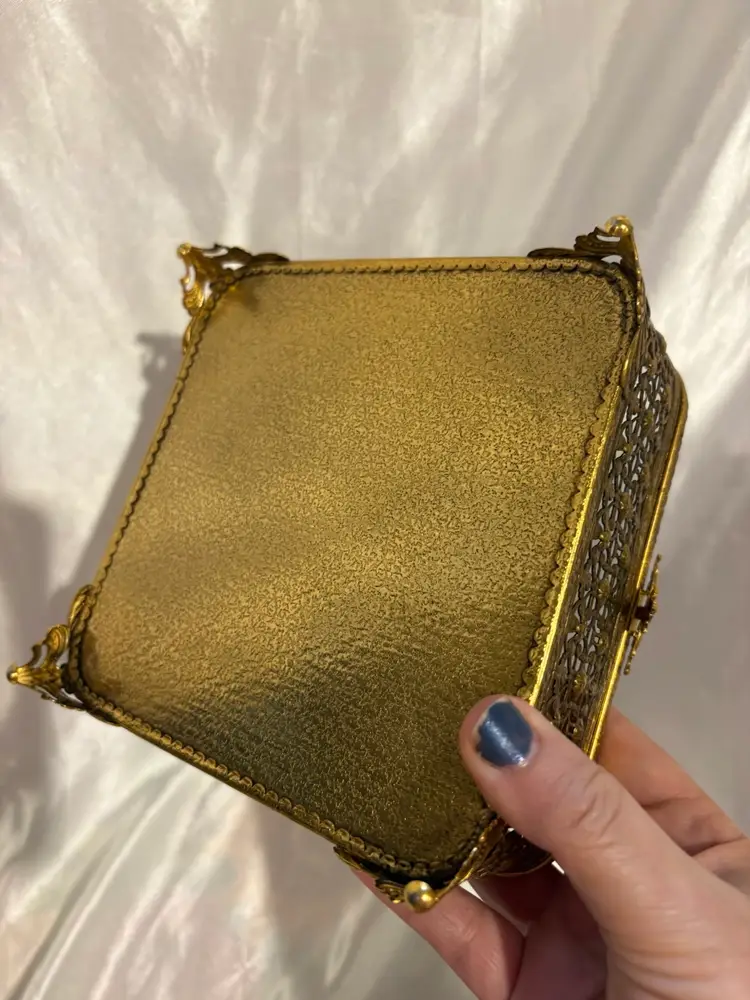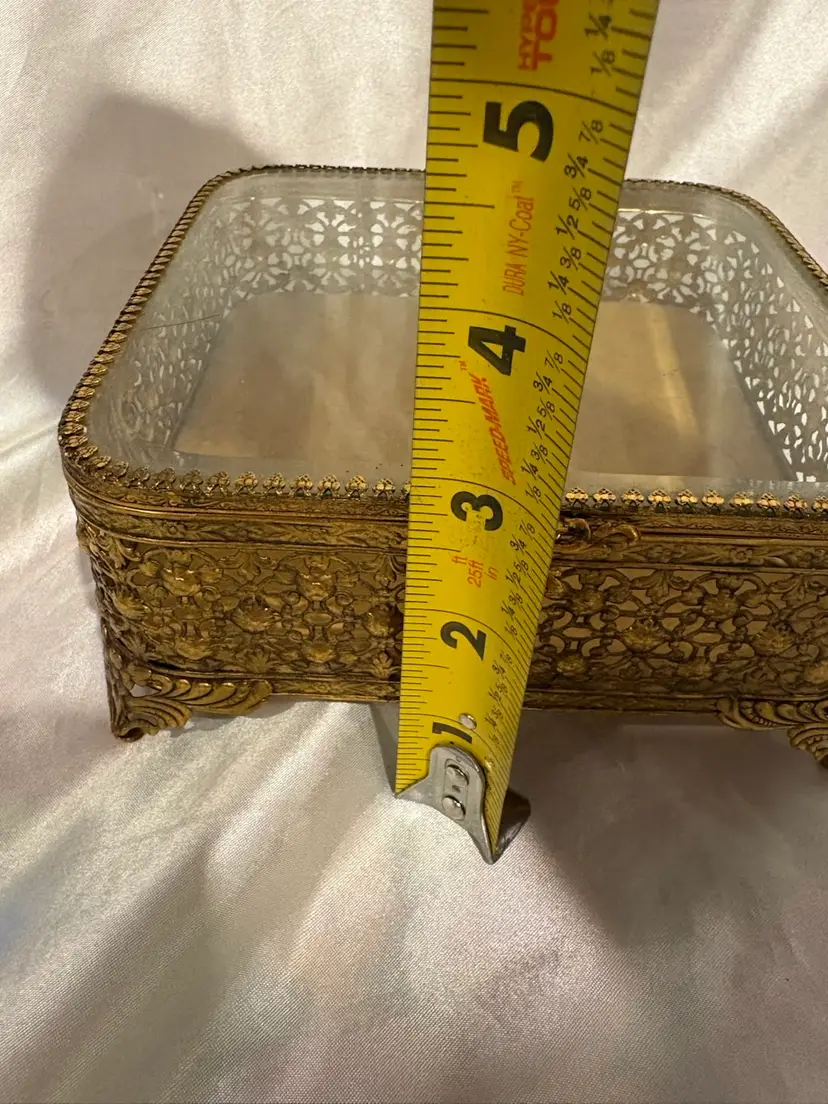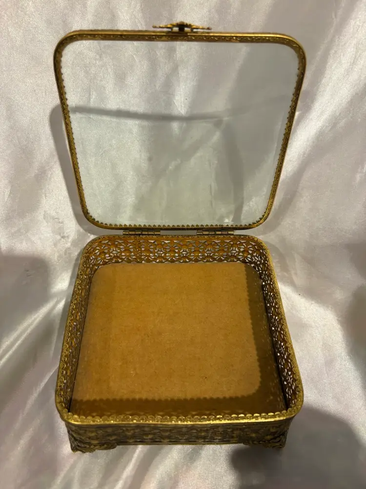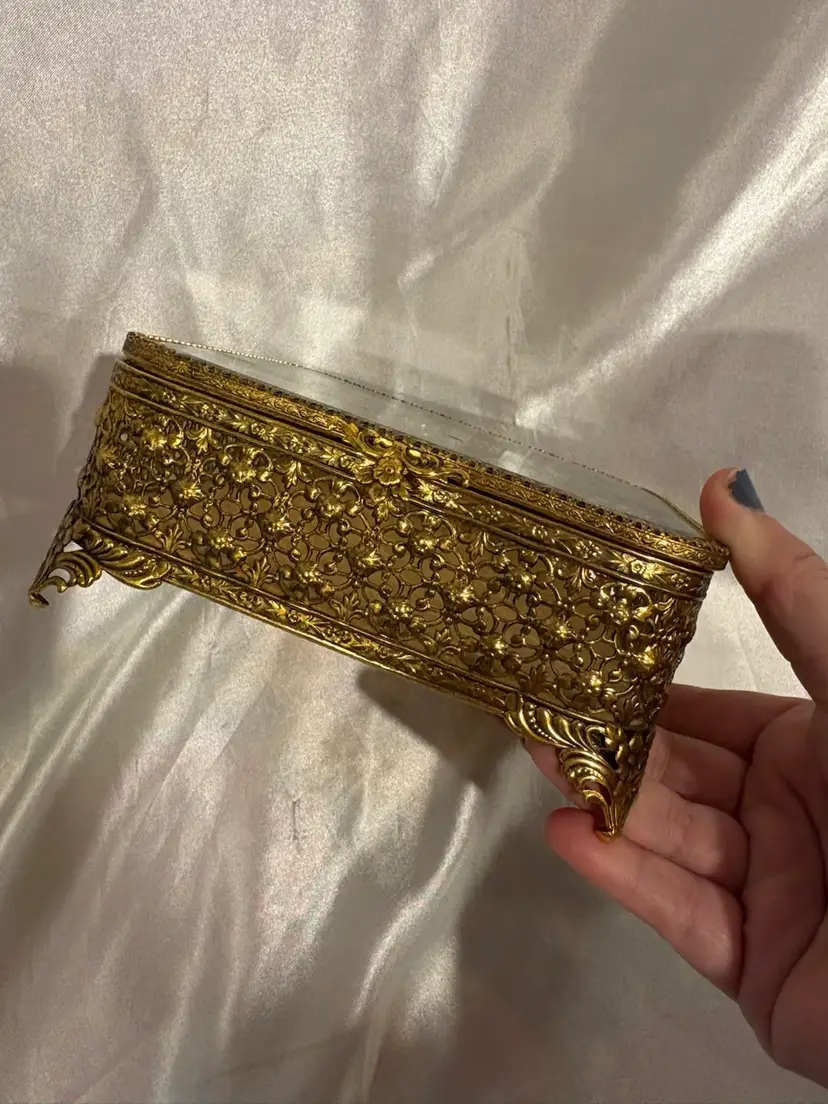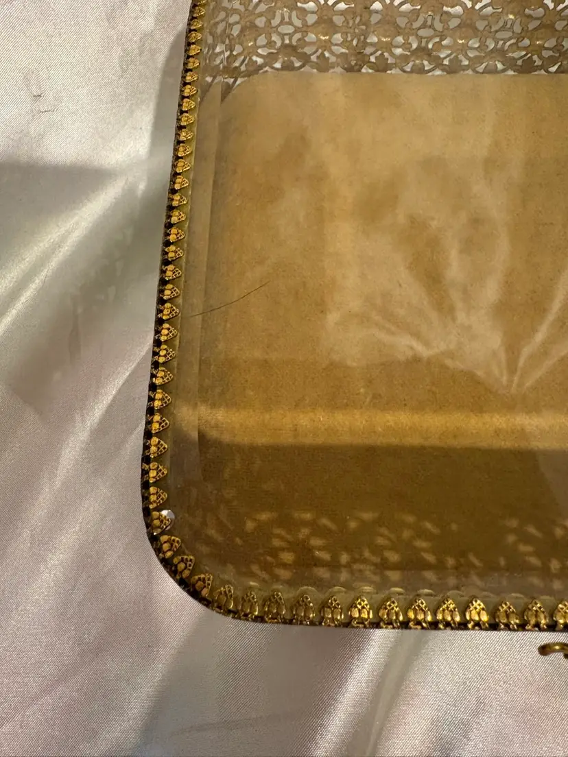 Vintage Footed Gold Metal Beveled Glass Top Jewelry Box