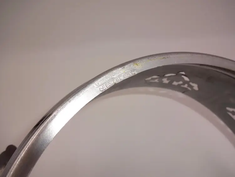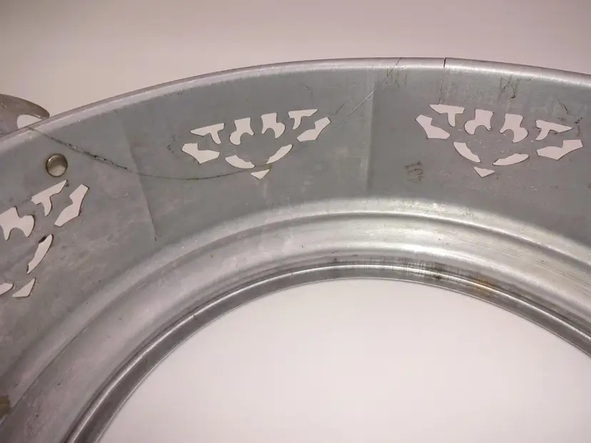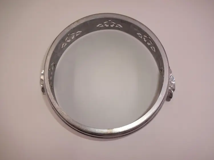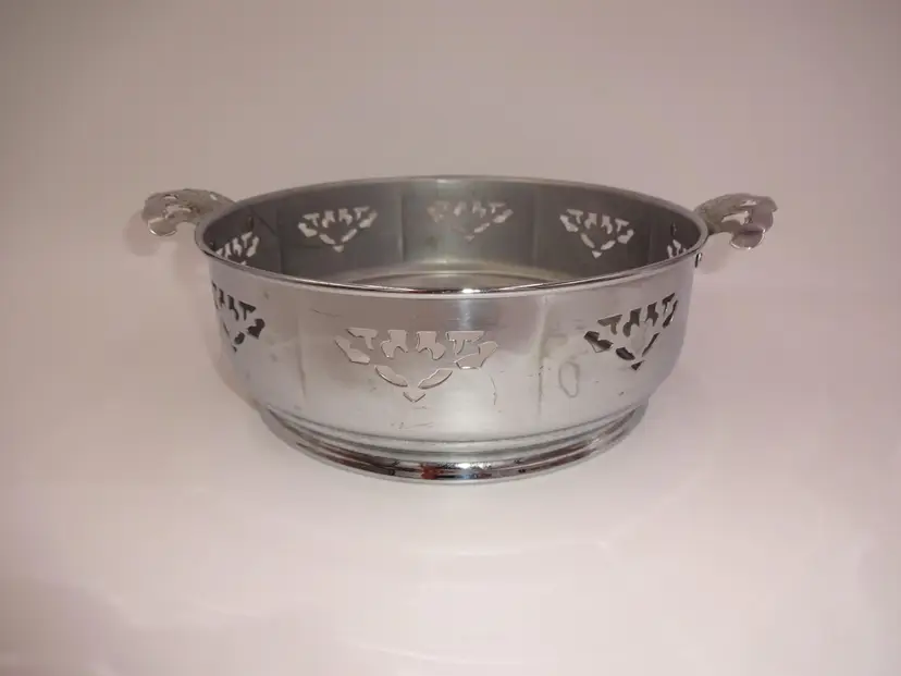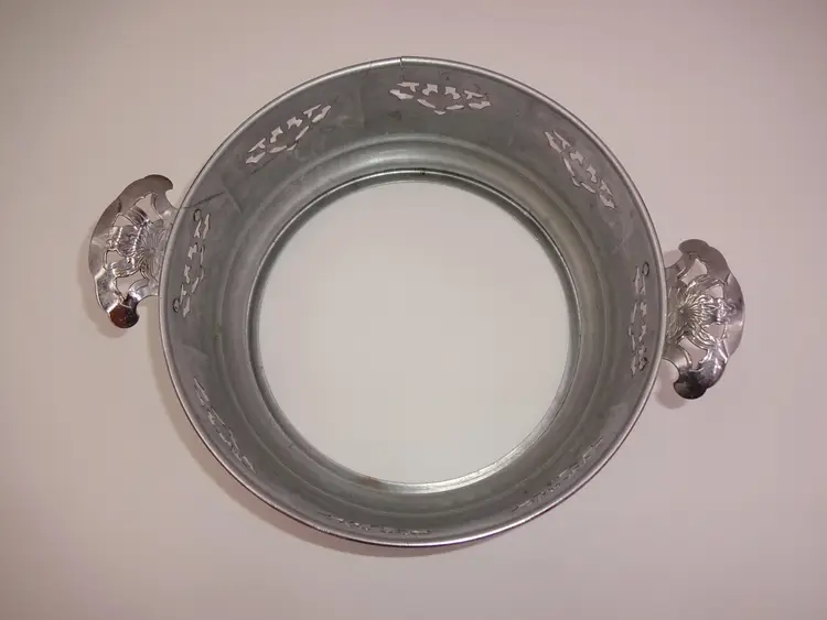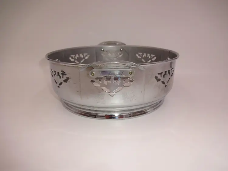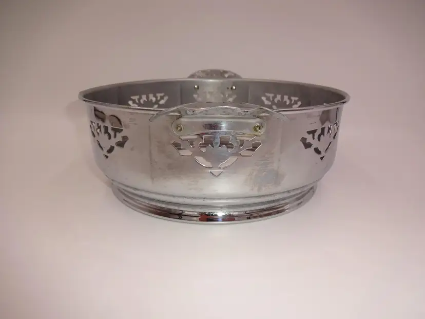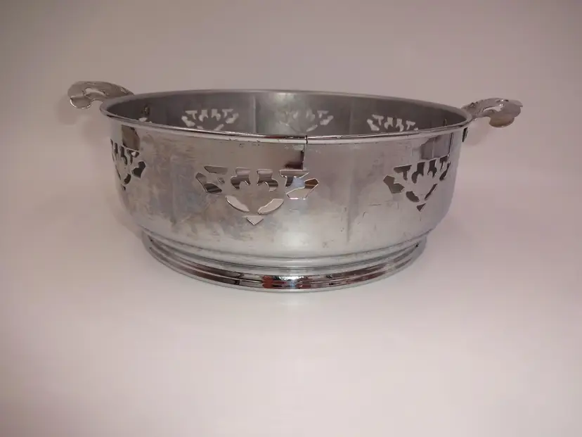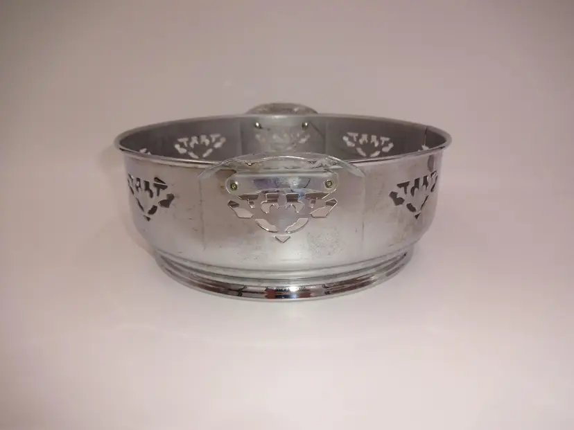 Fair to good pre-owned condition. Double-handle, round, metal holder with cutouts and ornate handles with cutouts. Holder has been repaired and there is a small area of separation (please see pics). Scuffs and marks consistent with age/use. Approximate measurements: 10-7/8" (including handles) x 8-3/4" x 3-1/4" and 3-1/2" at handles.