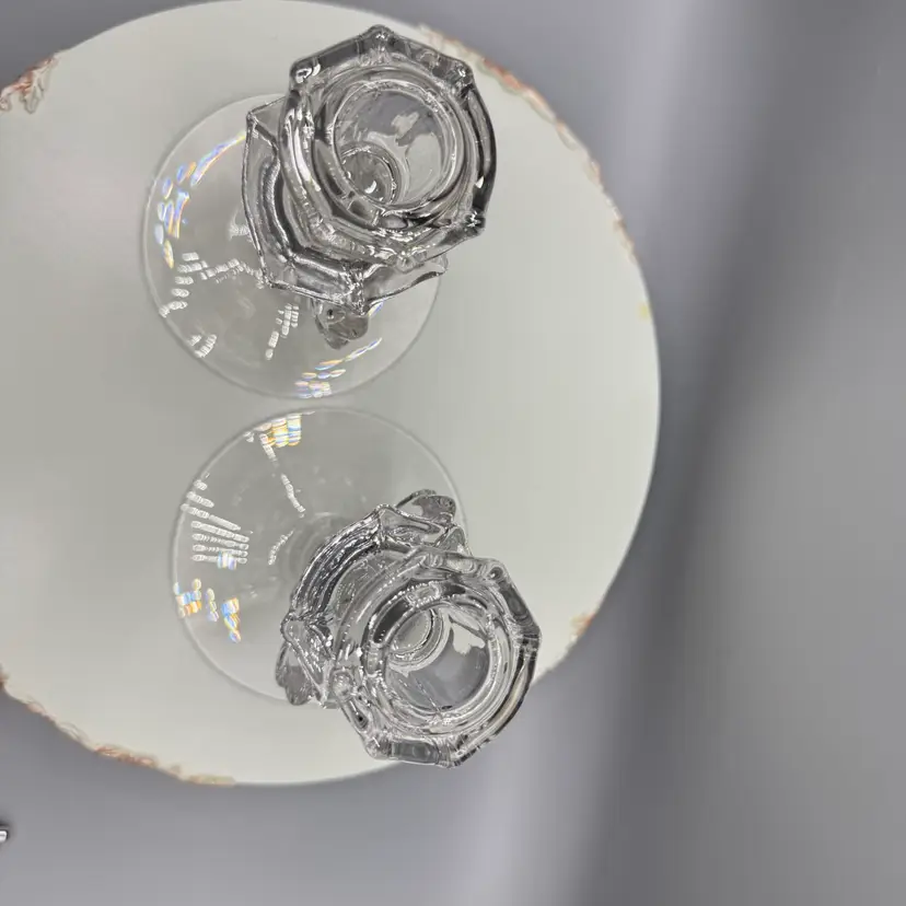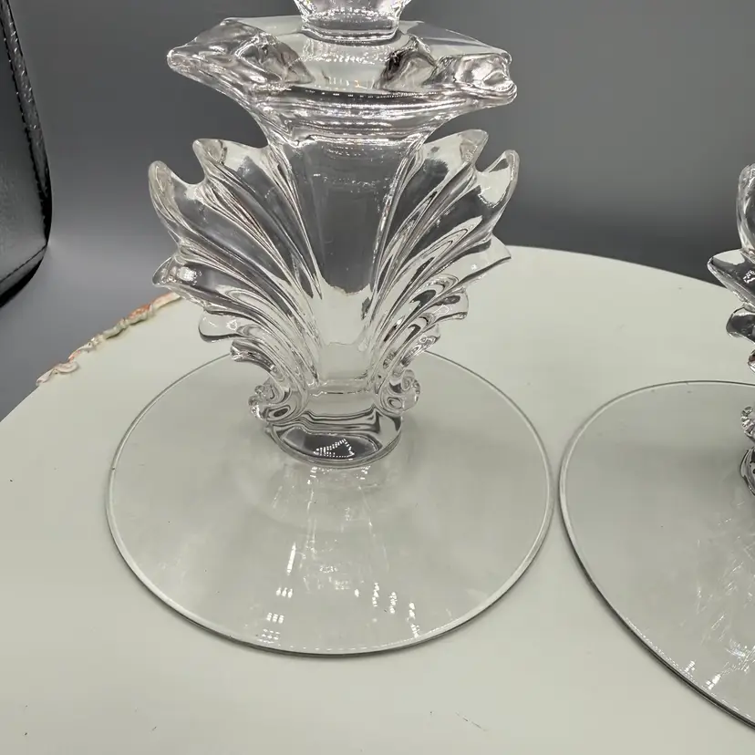 Single-light Fostoria candlesticks made from clear pressed glass in the Baroque pattern. These pieces feature a distinctive, dramatic "fancy flame" or "cornucopia" design on the stem that catches the light beautifully. Excellent condition no chips or cracks.