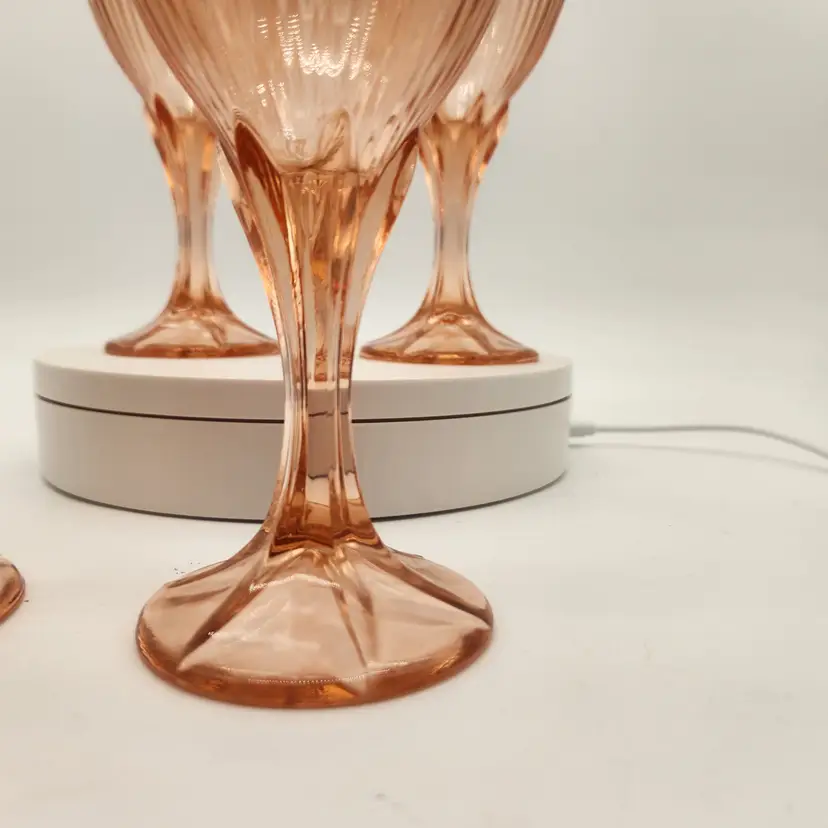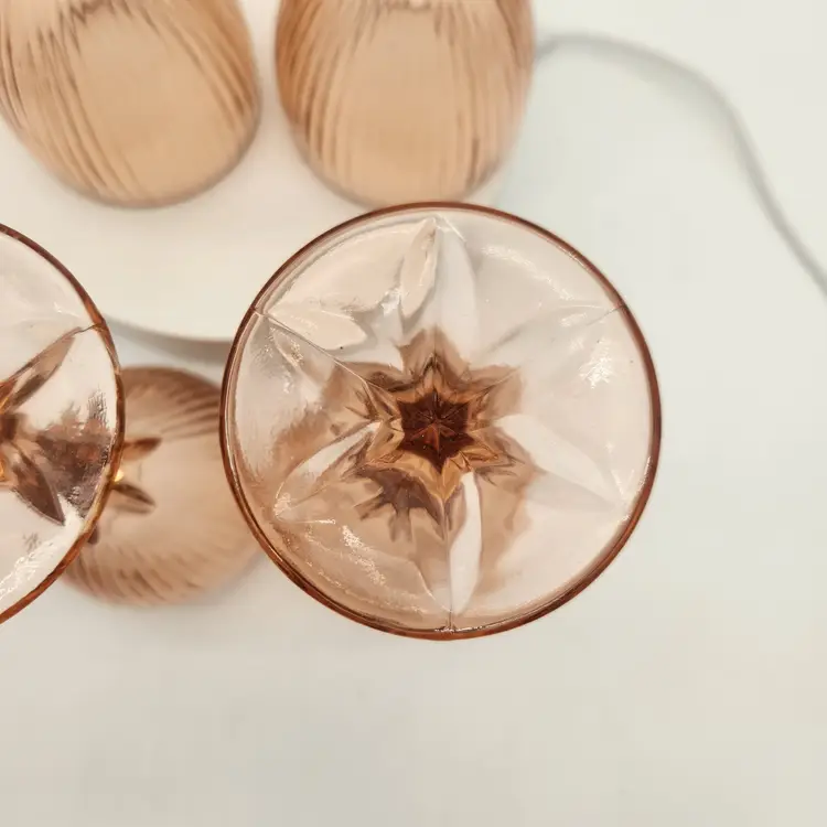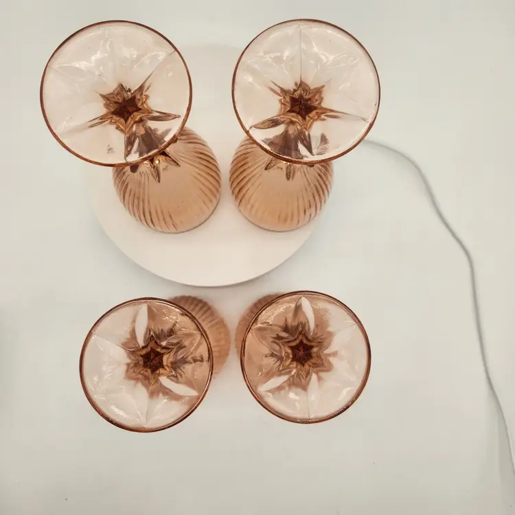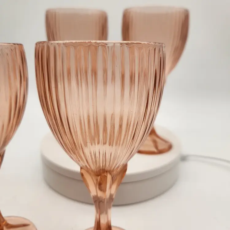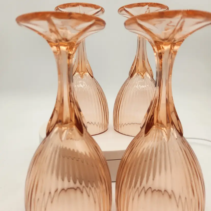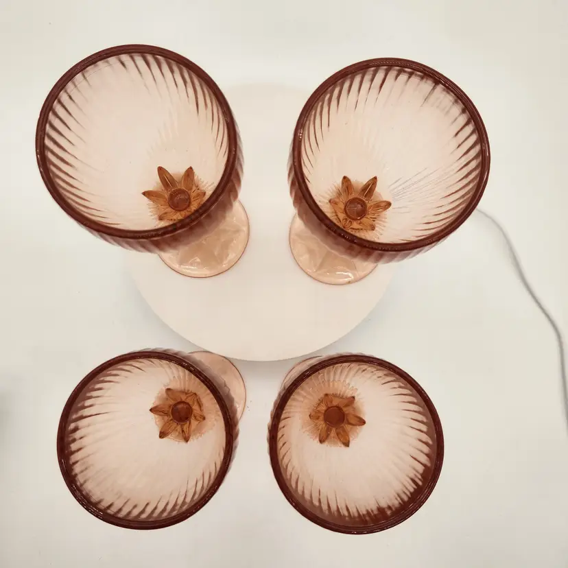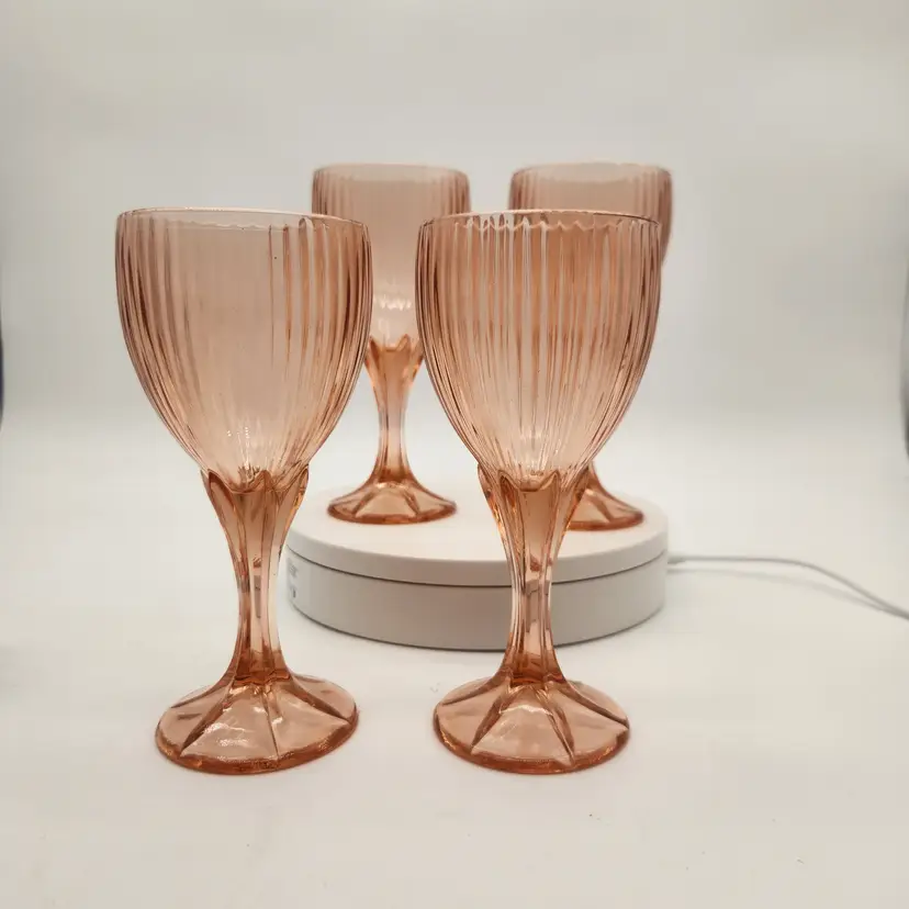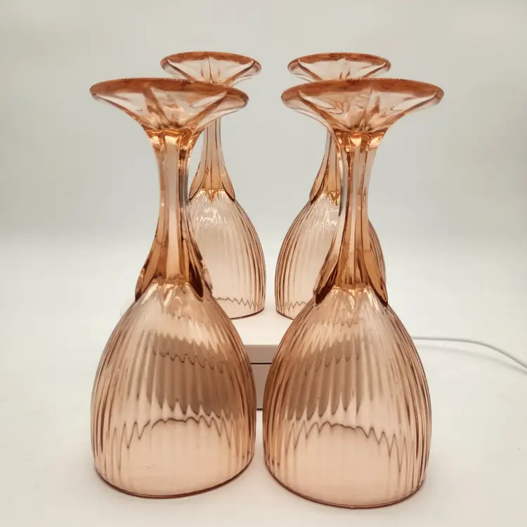 These beautiful pressed vintage wine glasses are part of a collection that was produced by Fostoria between 1985-86. It was then discontinued. The pattern consists of a delicately-ribbed bowl on a uniquely detailed stem and base all in an unusual, soft peach colored glass. Measurements: 6 5/8" tall, 3" wide Like New Condition: no chips, cracks, or signs of use. Note: This glasses are being sold as a set of 4. Price is for 4 glasses.