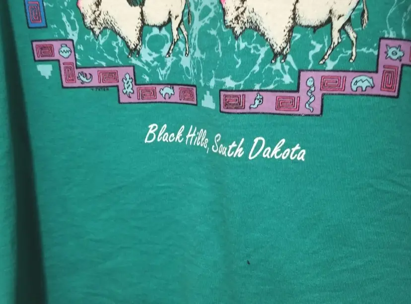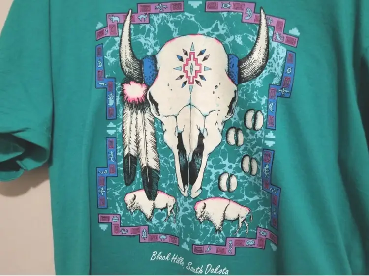 Vintage fruit of the loom single stitch native american bull skull t shirt with Black Hills South Dakota on front. Shirt is in very good condition. Design is very bright yet.