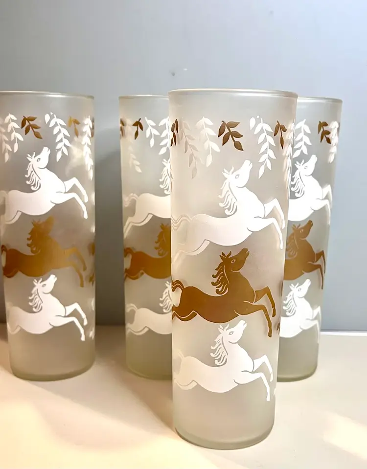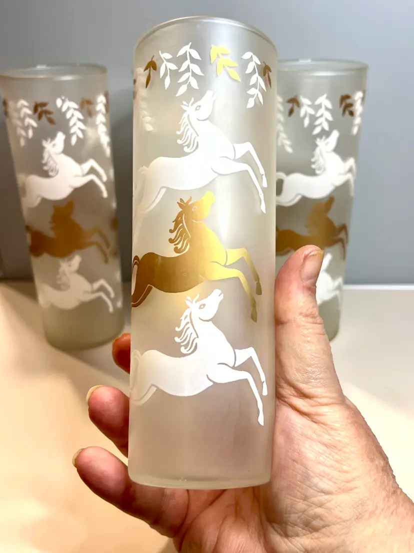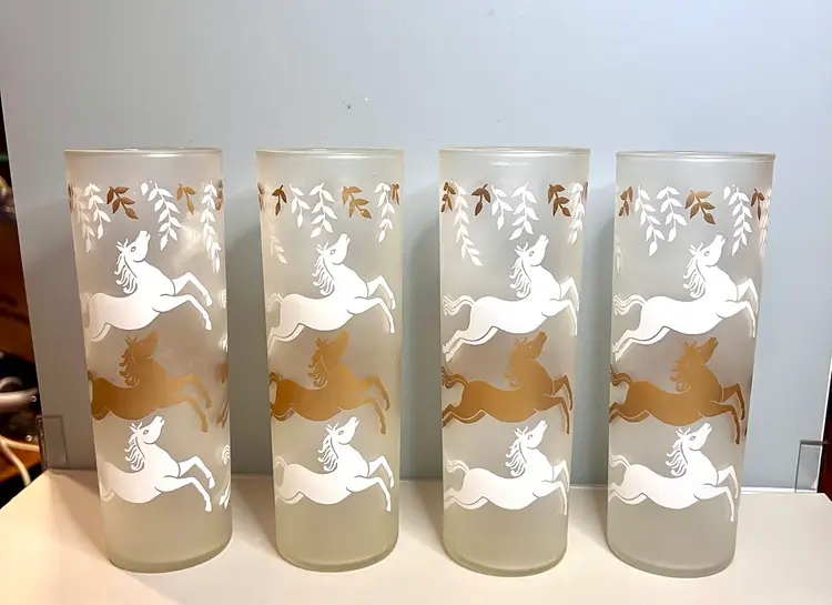 Set of four satin glass Tom Collins glasses. 7” tall. 2 1/2” across the top. No chips or cracks.