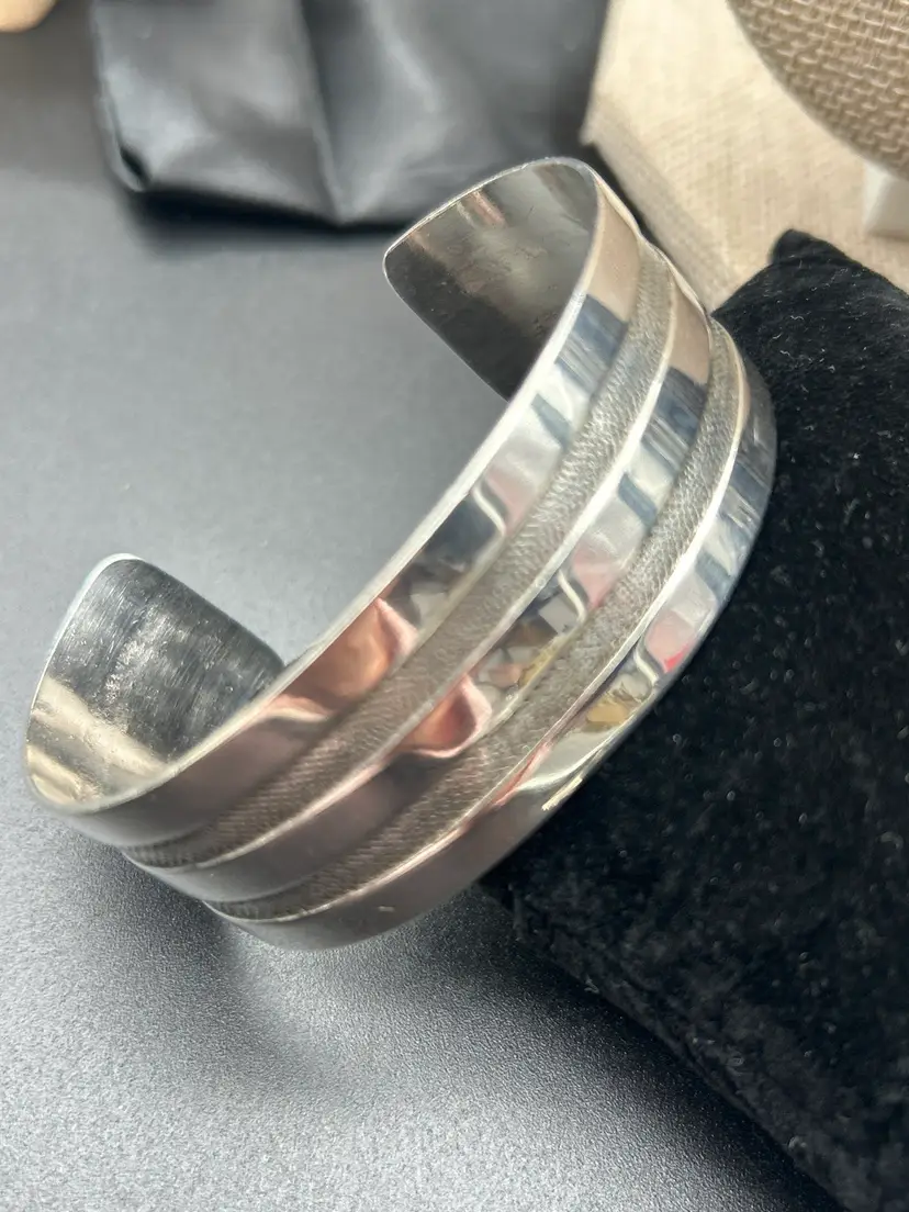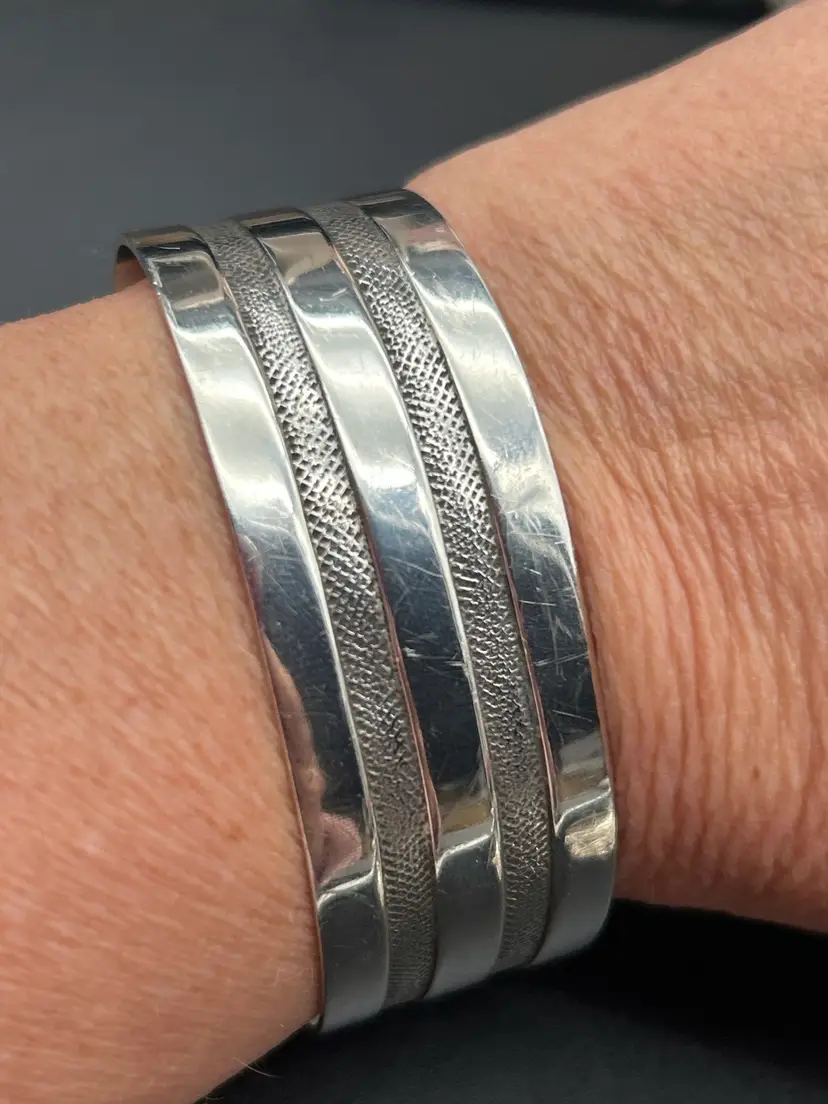 Bold vintage sterling silver cuff bracelet weighing 30 grams, stamped FP Sterling. This striking piece features a 1-inch wide band with alternating smooth and textured silver sections, giving it a sleek modernist appeal. The solid weight and classic design make it versatile enough to wear as a statement piece or layered with other bangles. A collectible sterling bracelet for lovers of timeless silver craftsmanship.