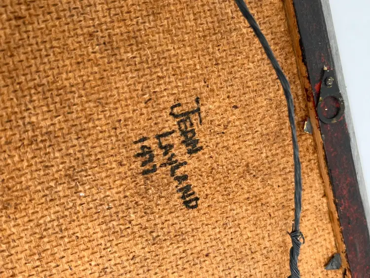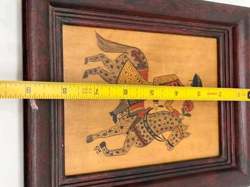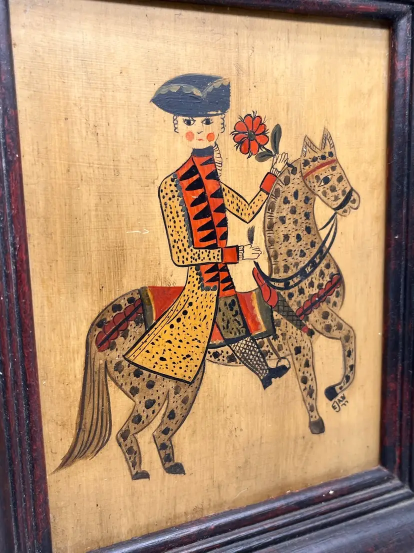 Vintage framed art by artist Jean Layland- 1977. Signed on art and on back. Painted on a piece of wood. This painting is a vintage folk art piece, created in the style of Pennsylvania German Fraktur. It depicts George Washington on horseback, a popular subject in this traditional art form.