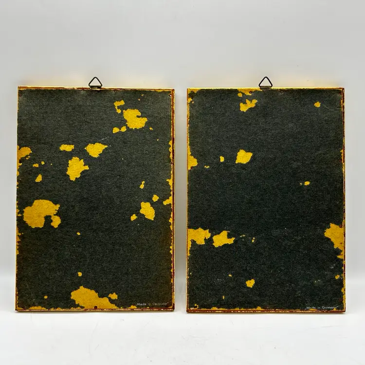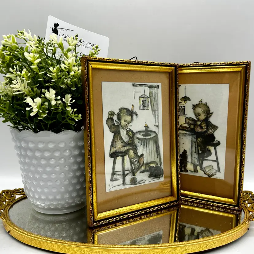 This beautiful vintage framed print set from Germany depicts two adorable Hummel figurines, "Mother's Helper" and "Little Bookkeeper." The lithography production technique and small paper size make them a unique addition to any art collection. These original prints were produced in the mid-century and are in great condition.
