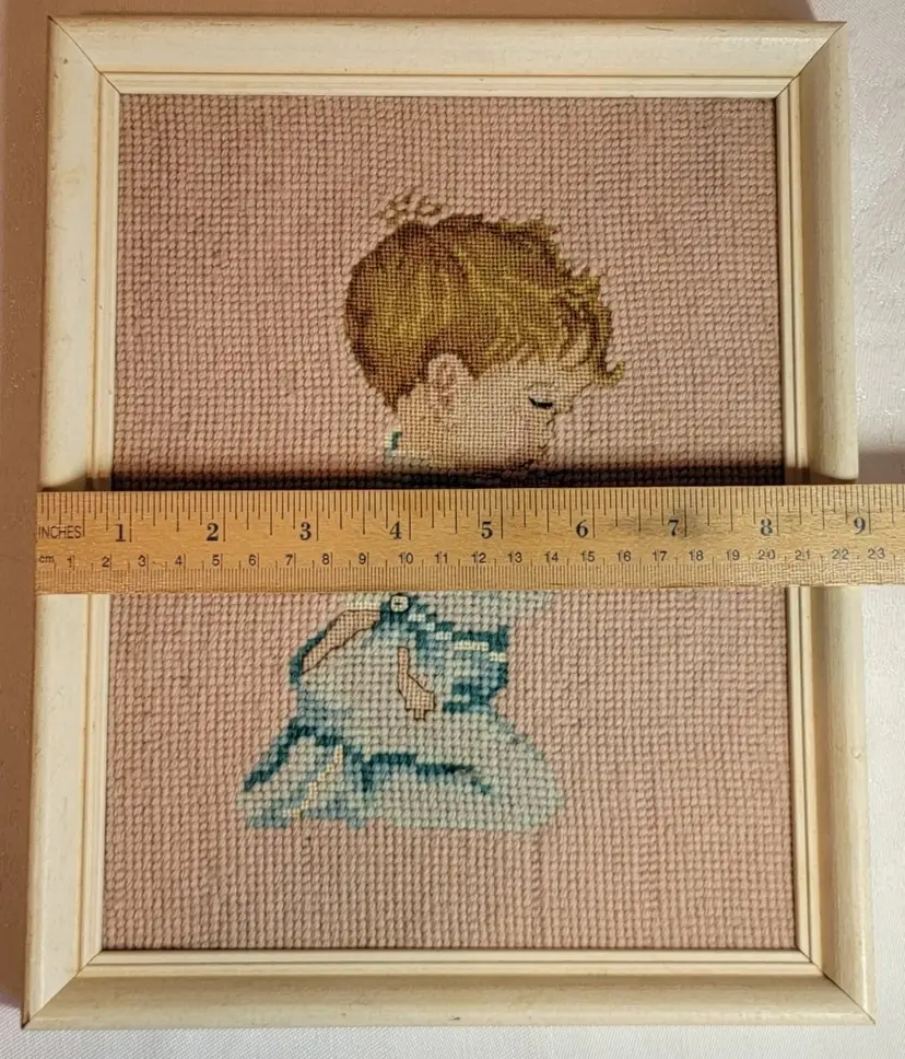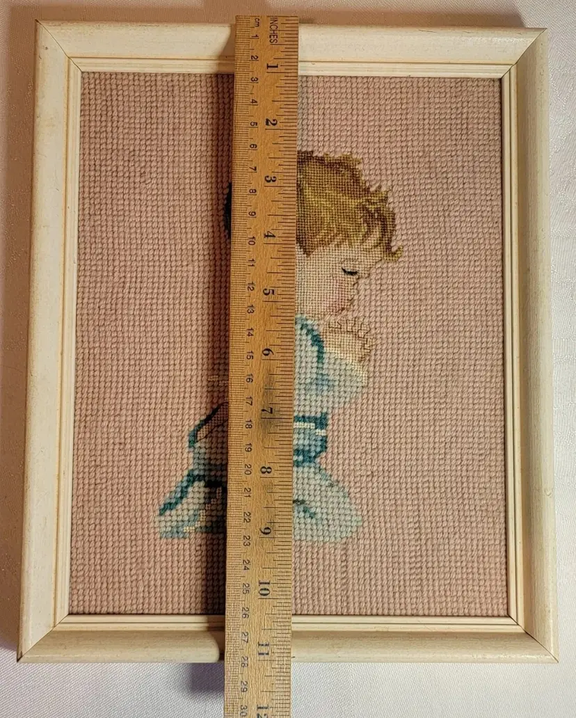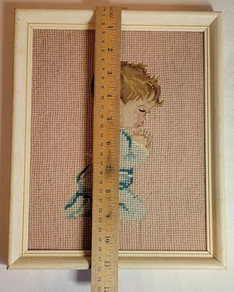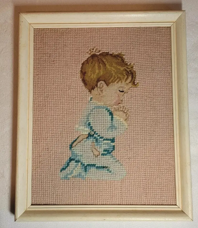This vintage framed needlepoint and petit point artwork features a charming baby boy praying while kneeling. The piece was handmade in the 1970s and comes with a cream-colored wood frame for display. The embroidery was done using needlepoint techniques and the finished product measures 11 inches in height and 9 inches in length.
