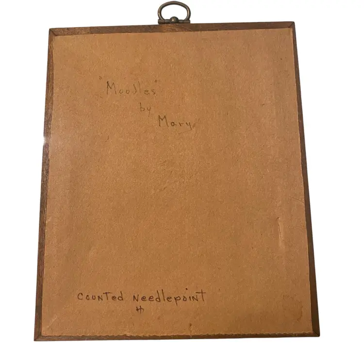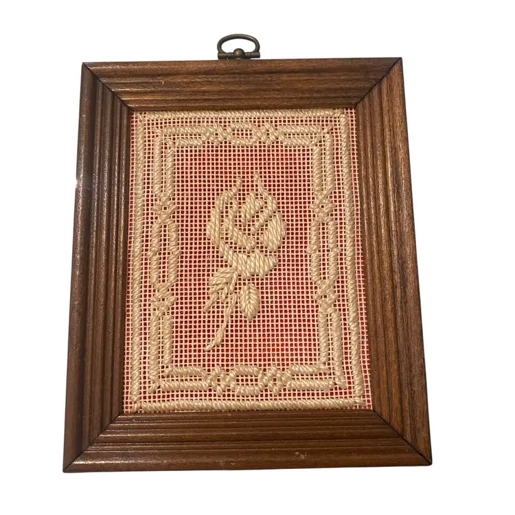 vintage framed needlepoint or cross-stitch artwork, likely featuring a rose design, which falls under the collectibles category due to its decorative and artistic nature. Signed back 6x5